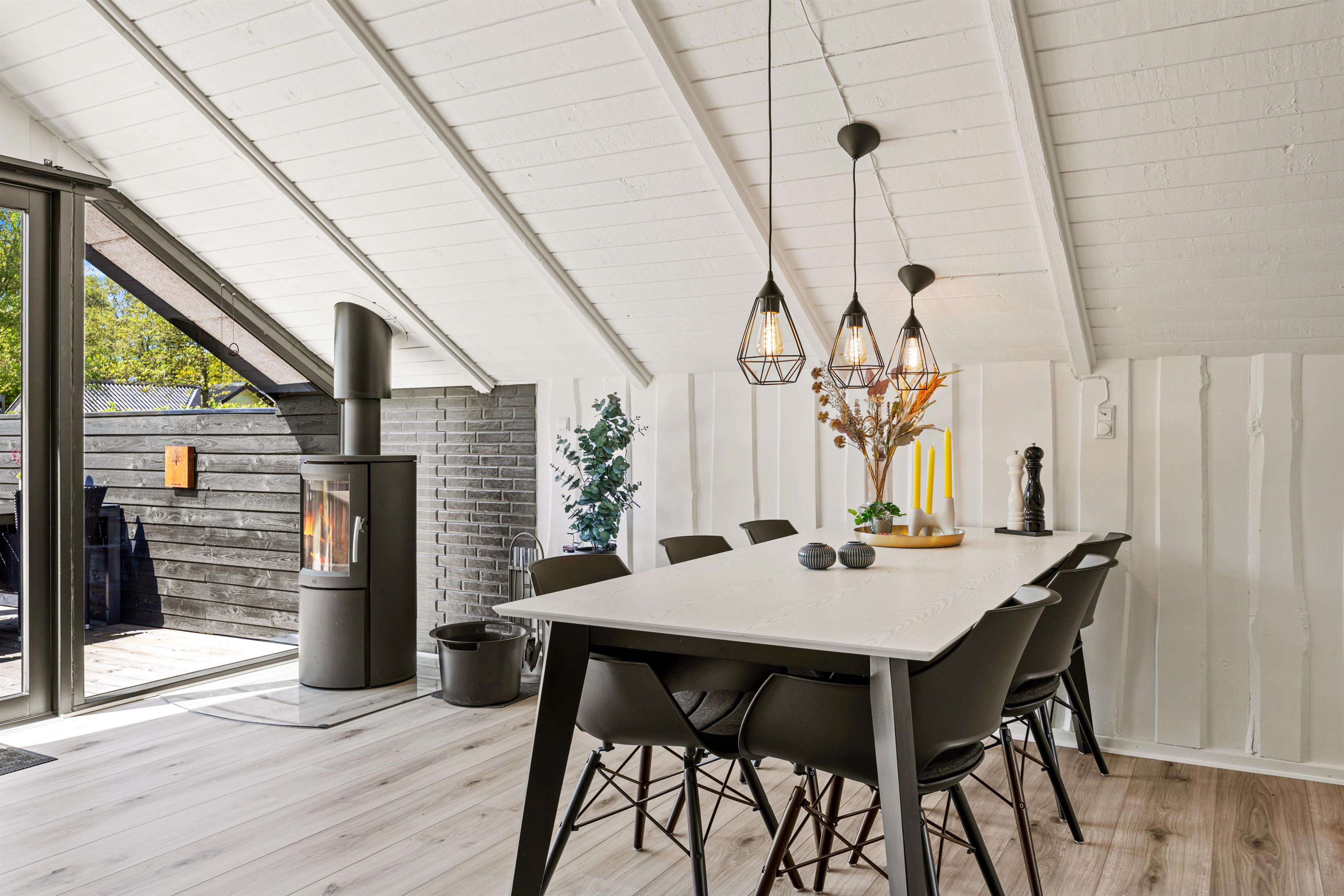 Lys og hyggelig indretning med brændeovn