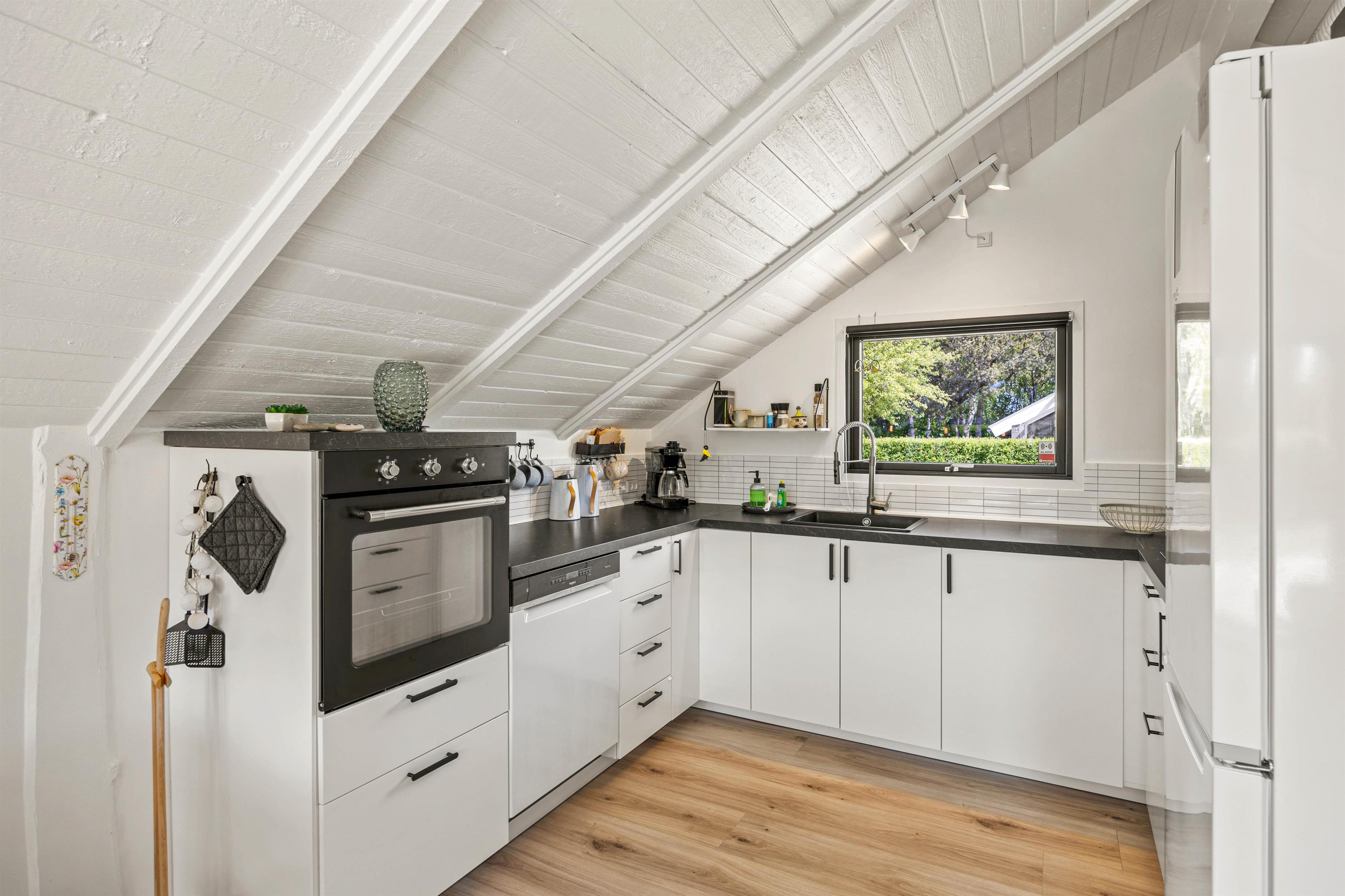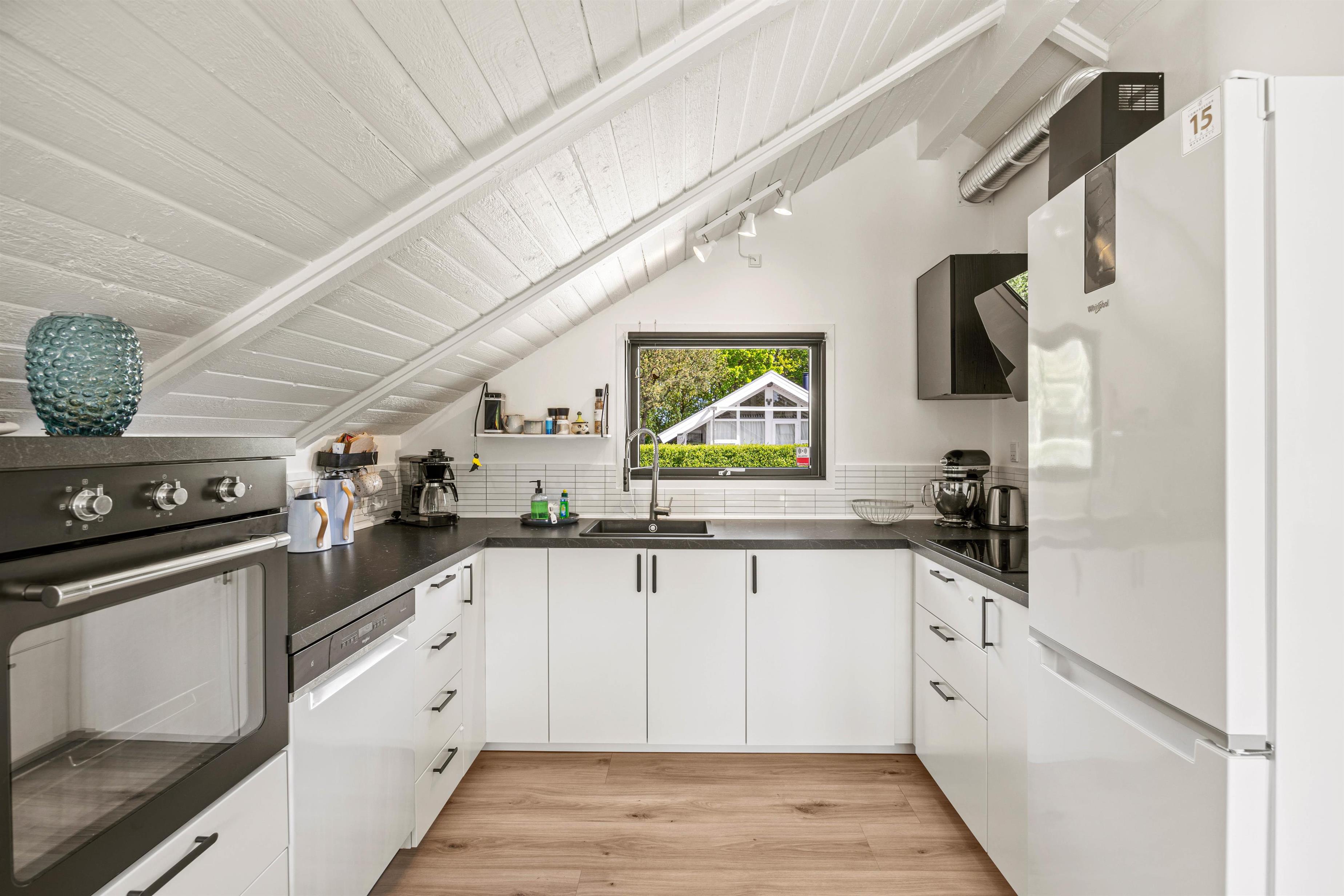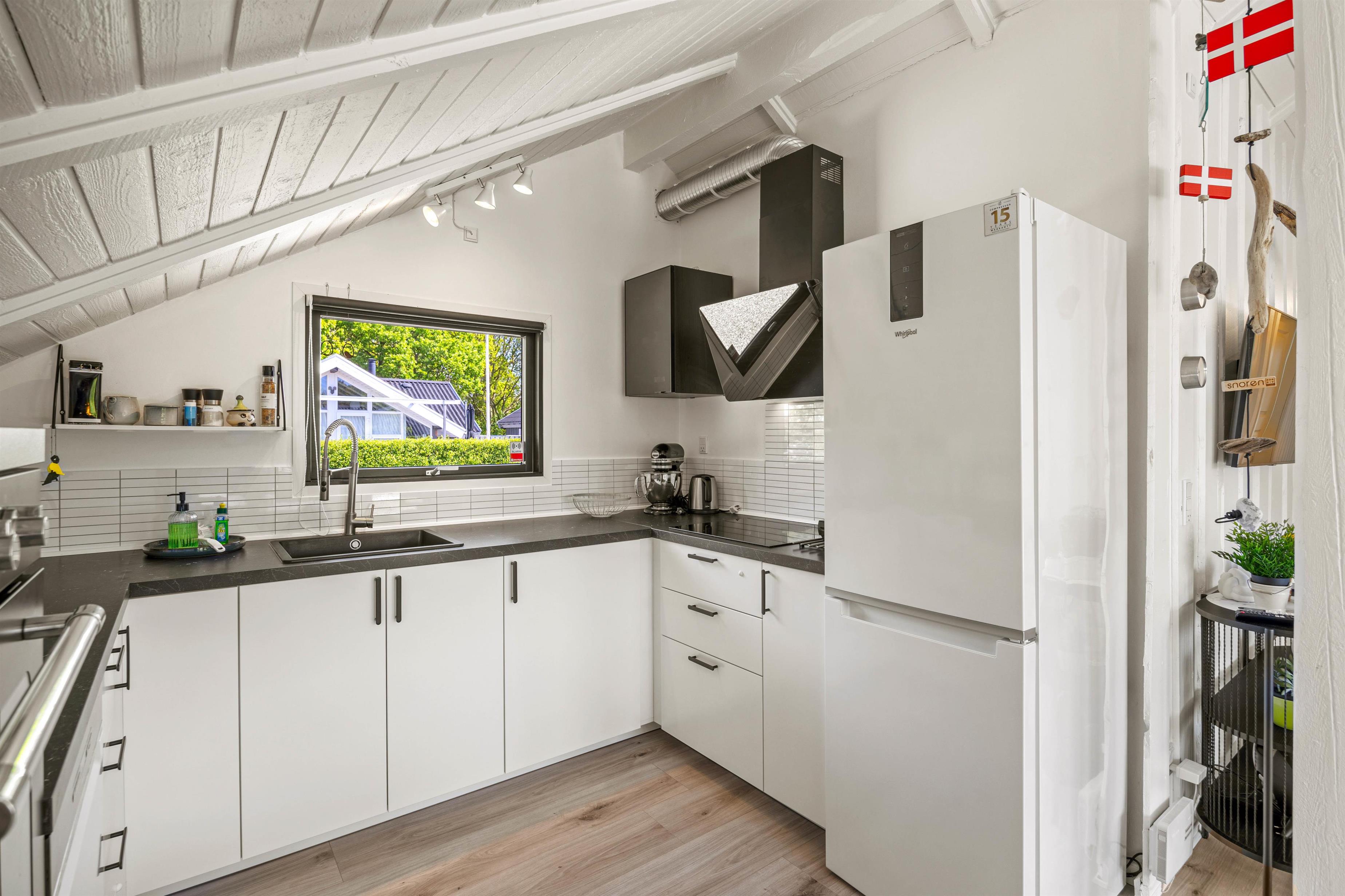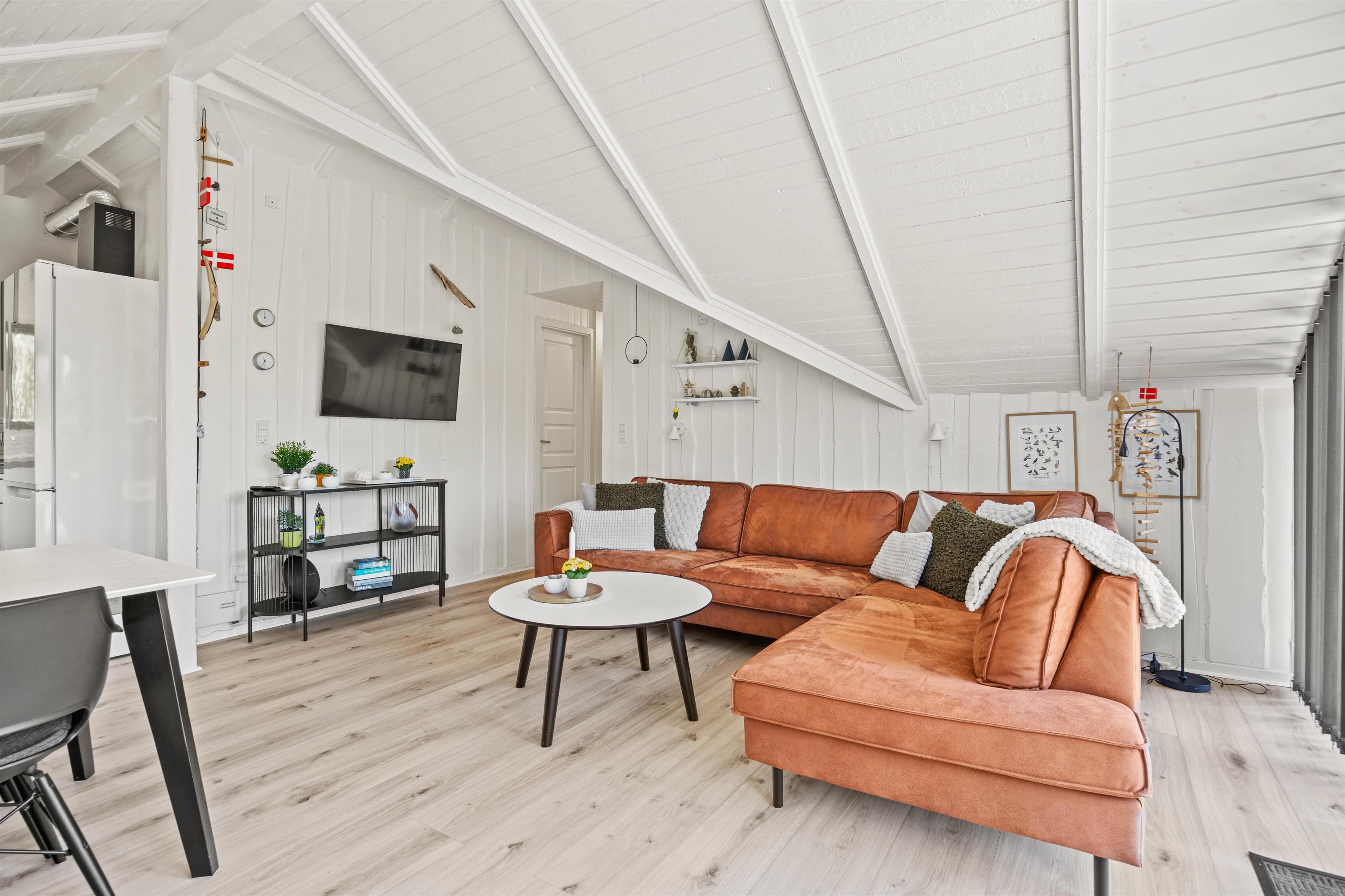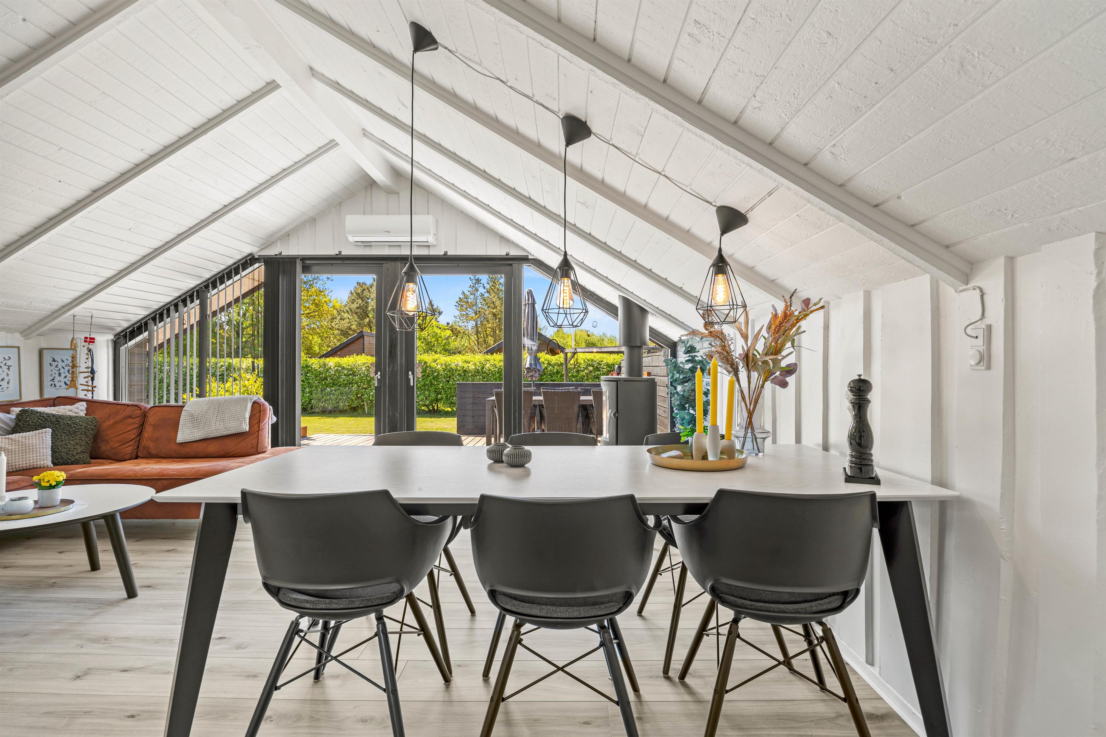 Sommerhusets hjerte er alrummet, hvor køkken, stue og spiseplads ligger i åben forbindelse. I alrummet er der lagt op til hyggelige feriestunder med mad, spil og film, og her sørger brændeovnen for at fuldende feriestemningen med sin knitren og varme.