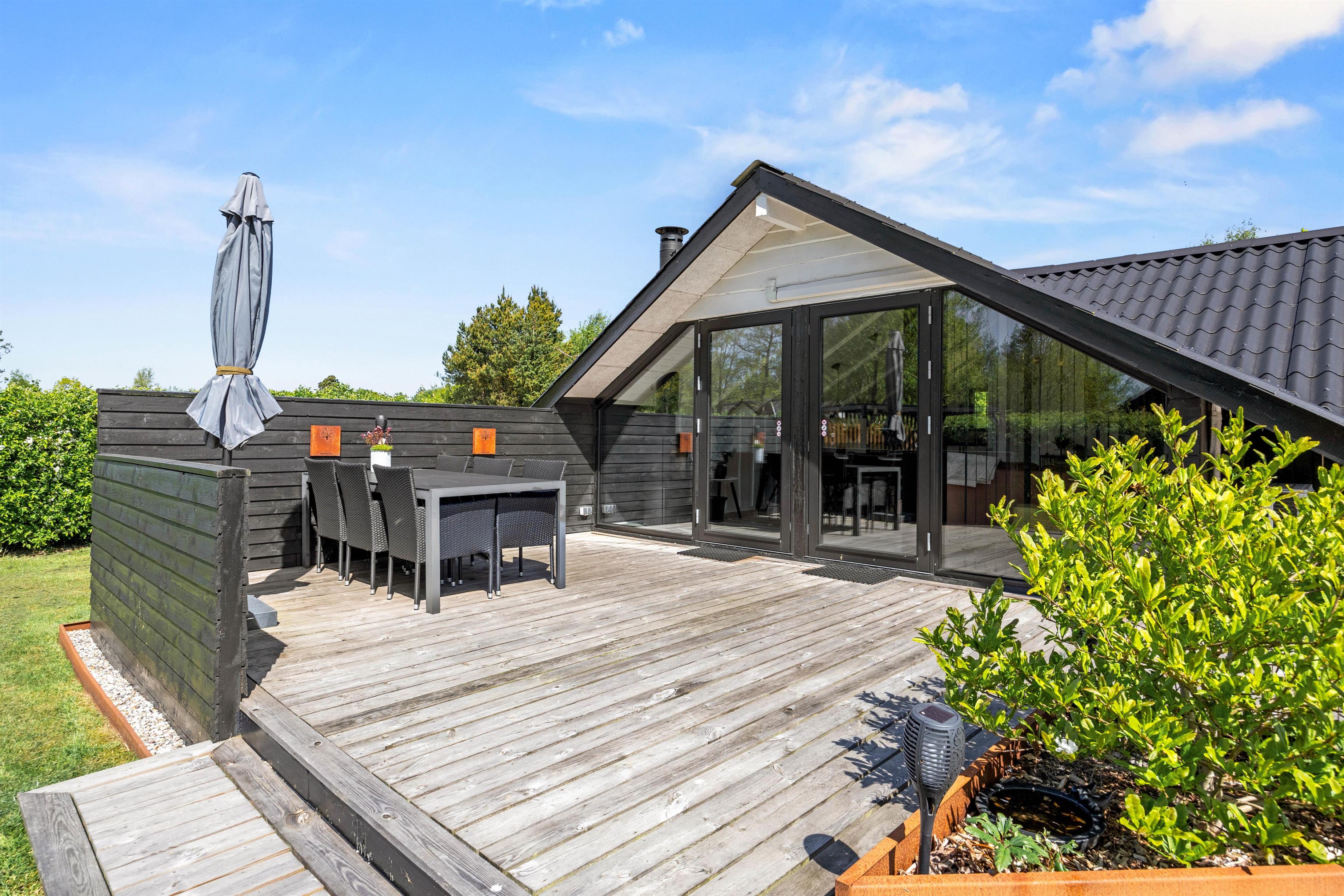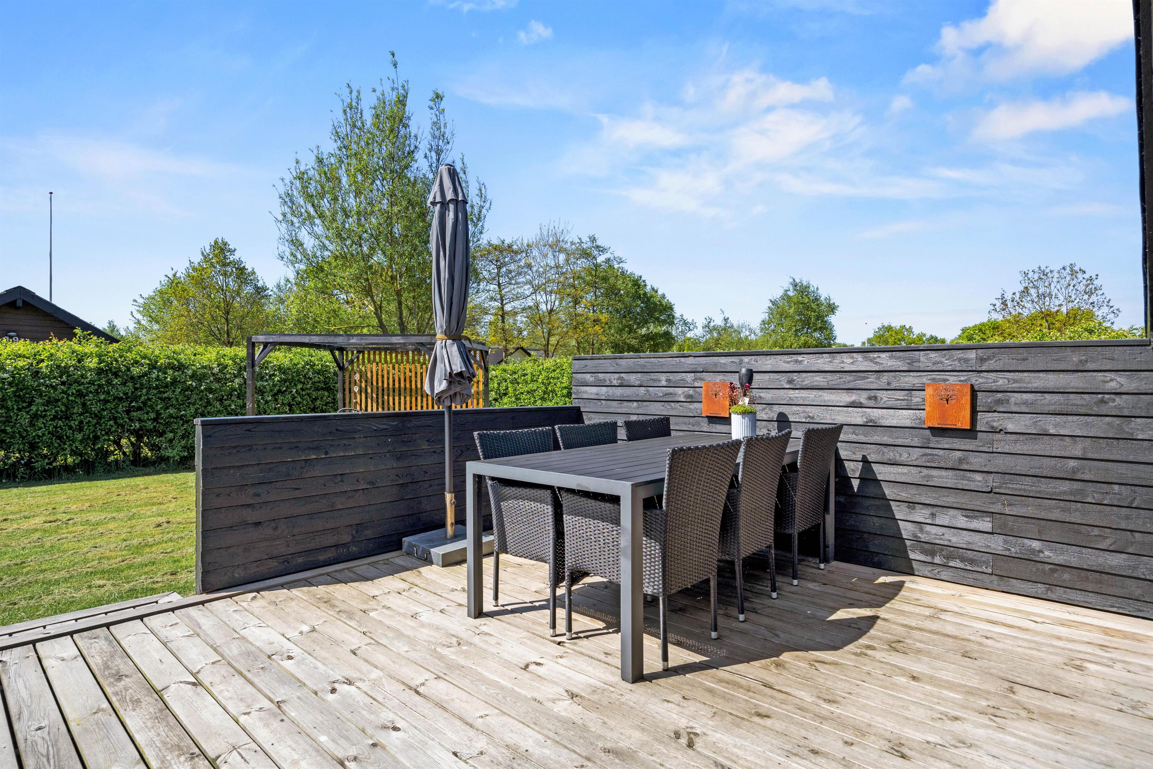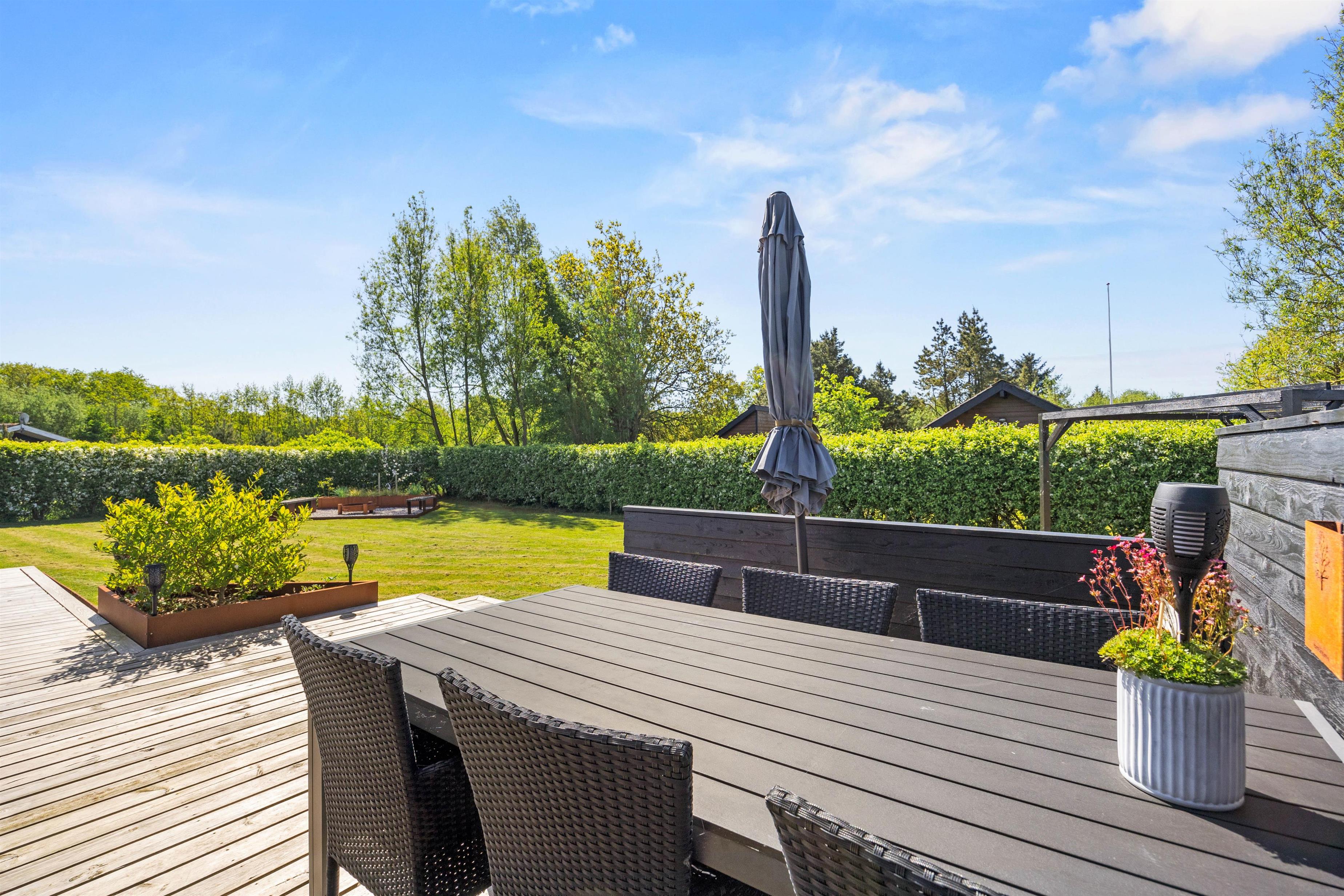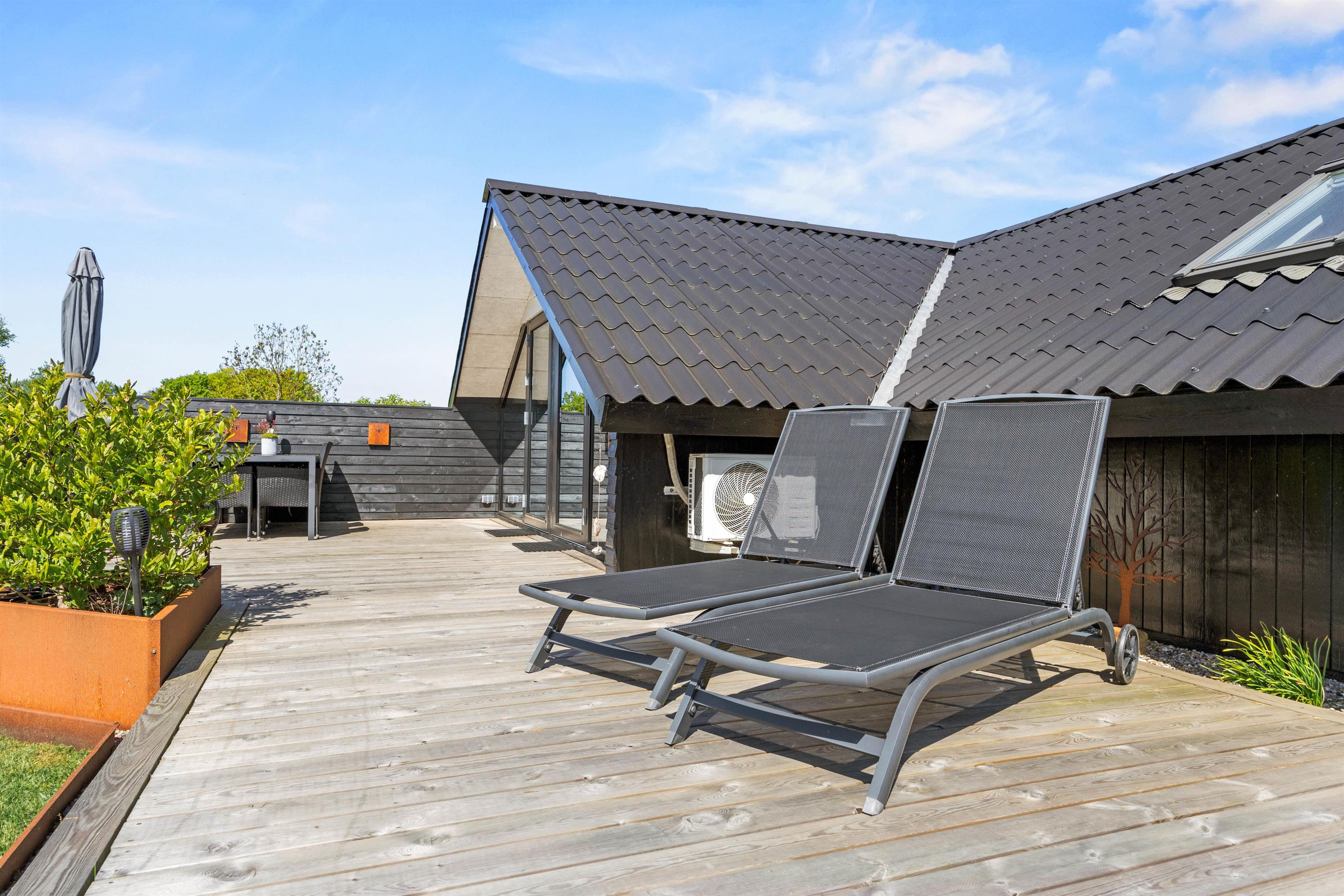 Udendørs venter jer et dejligt udeområde, hvor I både har en have og flere skønne terrasser, I kan tilbringe de solrige dage af jeres ferie på. På terrasserne har I havemøbler og liggestole, som I kan finde jer til rette i på en god plads i solen. I har desuden en grill til rådighed, og på de lune ferieaftener kan I tænde op i grillen på terrassen og stege nogle lækre bøffer, som I kan nyde med et glas vin til. Her kan I samtidig nyde den rolige atmosfære og lytte til naturens lyde, mens solen går ned over horisonten.