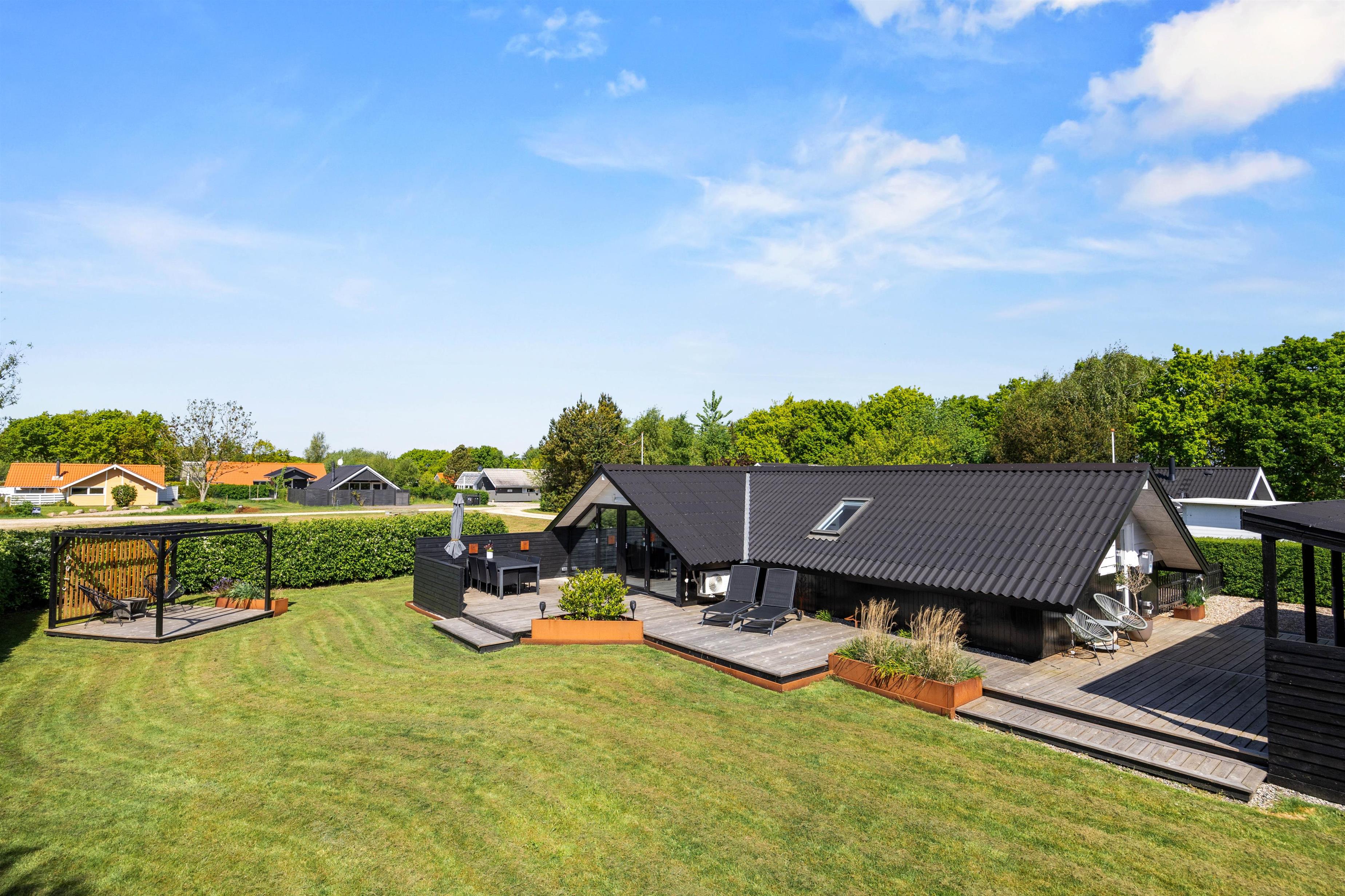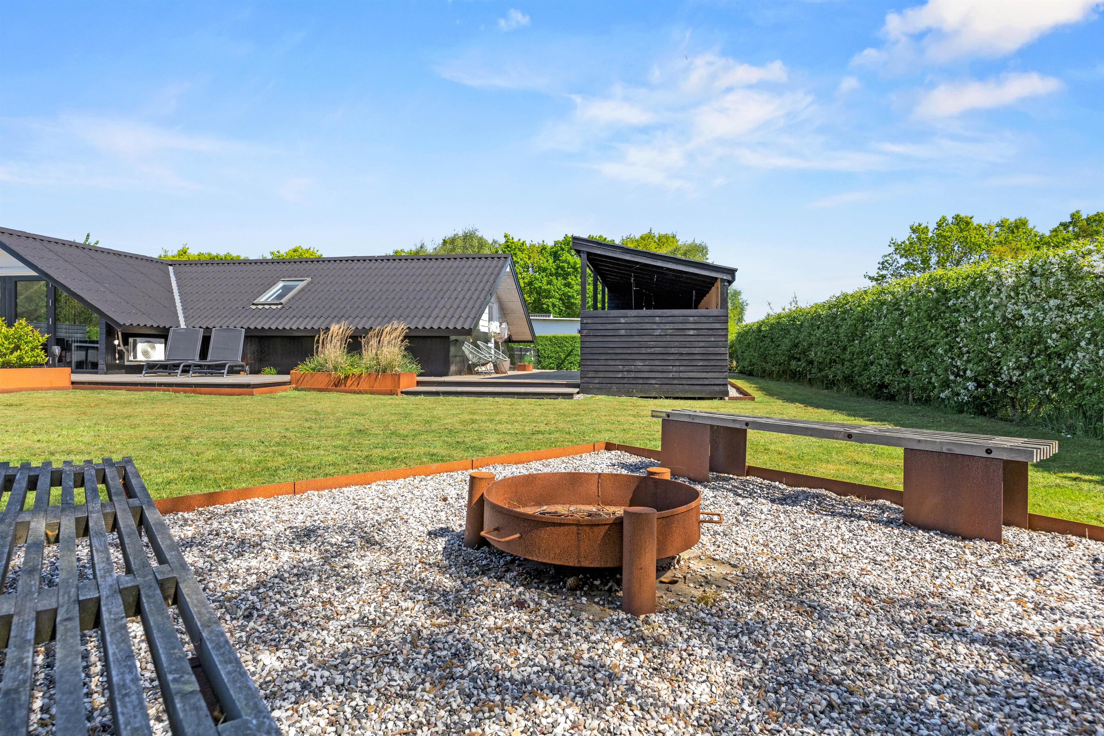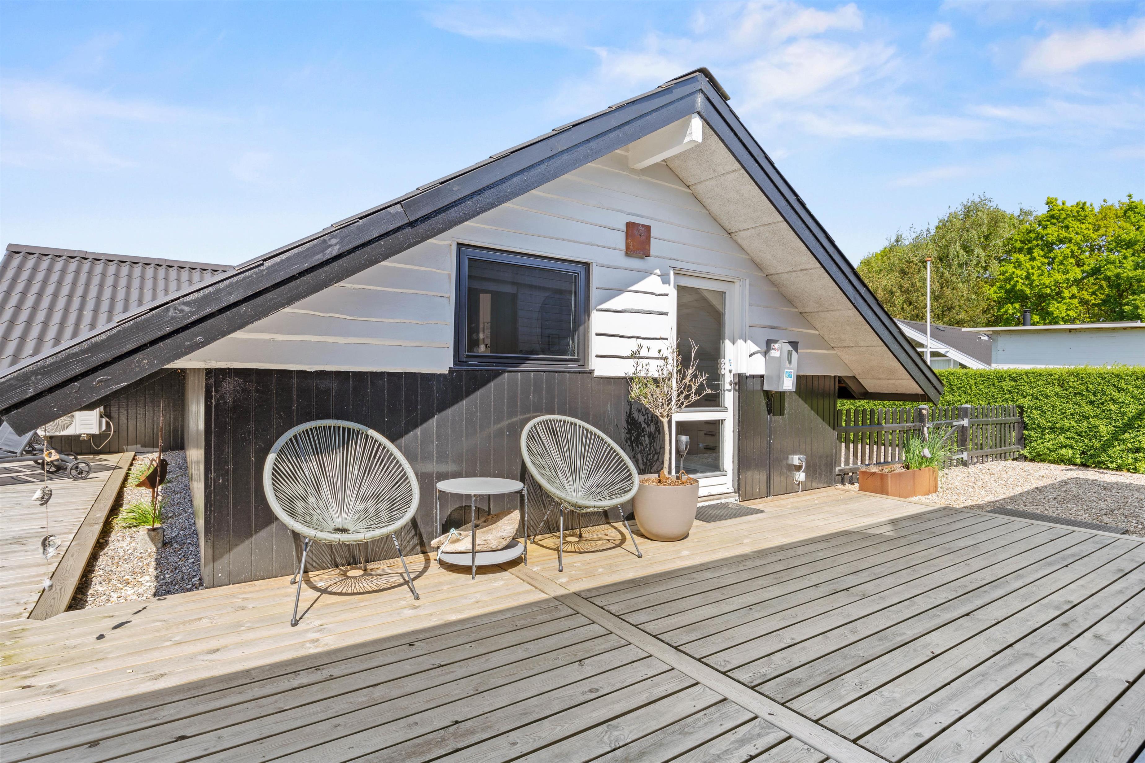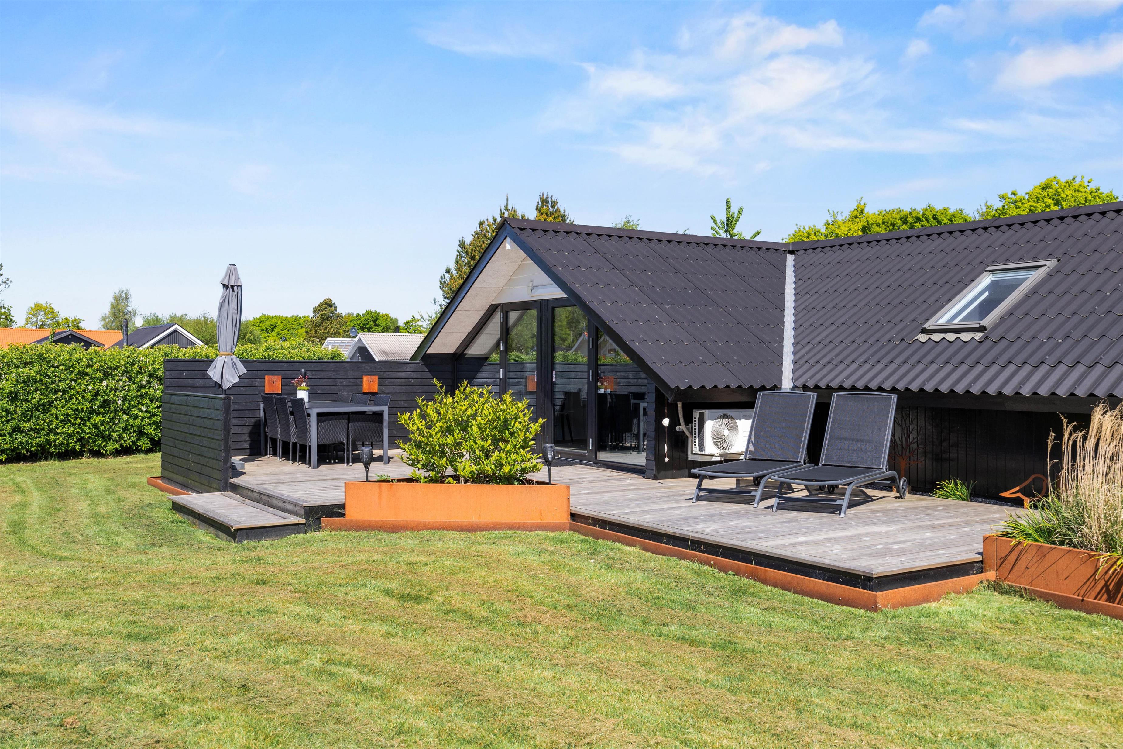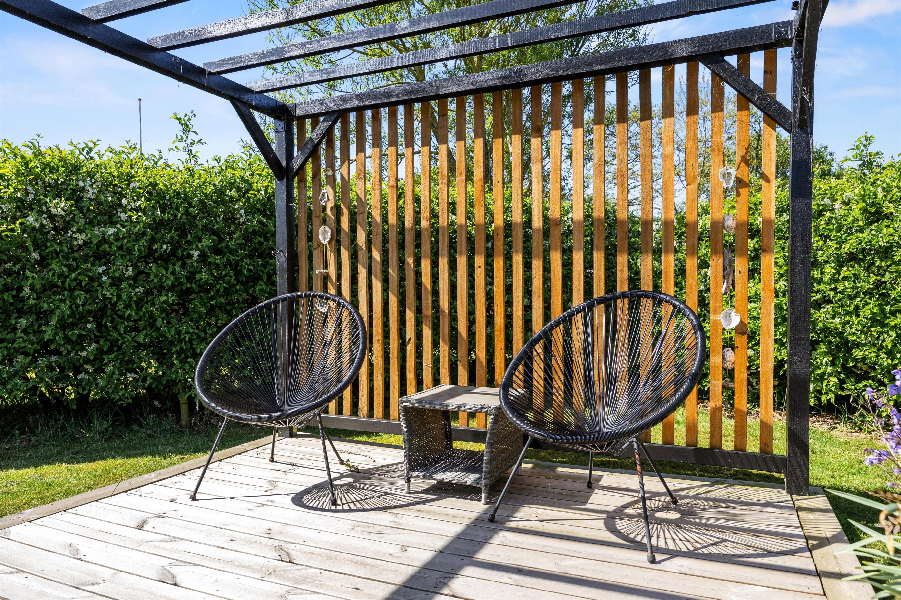 Udendørs venter jer et dejligt udeområde, hvor I både har en have og flere skønne terrasser, I kan tilbringe de solrige dage af jeres ferie på. På terrasserne har I havemøbler og liggestole, som I kan finde jer til rette i på en god plads i solen. I har desuden en grill til rådighed, og på de lune ferieaftener kan I tænde op i grillen på terrassen og stege nogle lækre bøffer, som I kan nyde med et glas vin til. Her kan I samtidig nyde den rolige atmosfære og lytte til naturens lyde, mens solen går ned over horisonten.