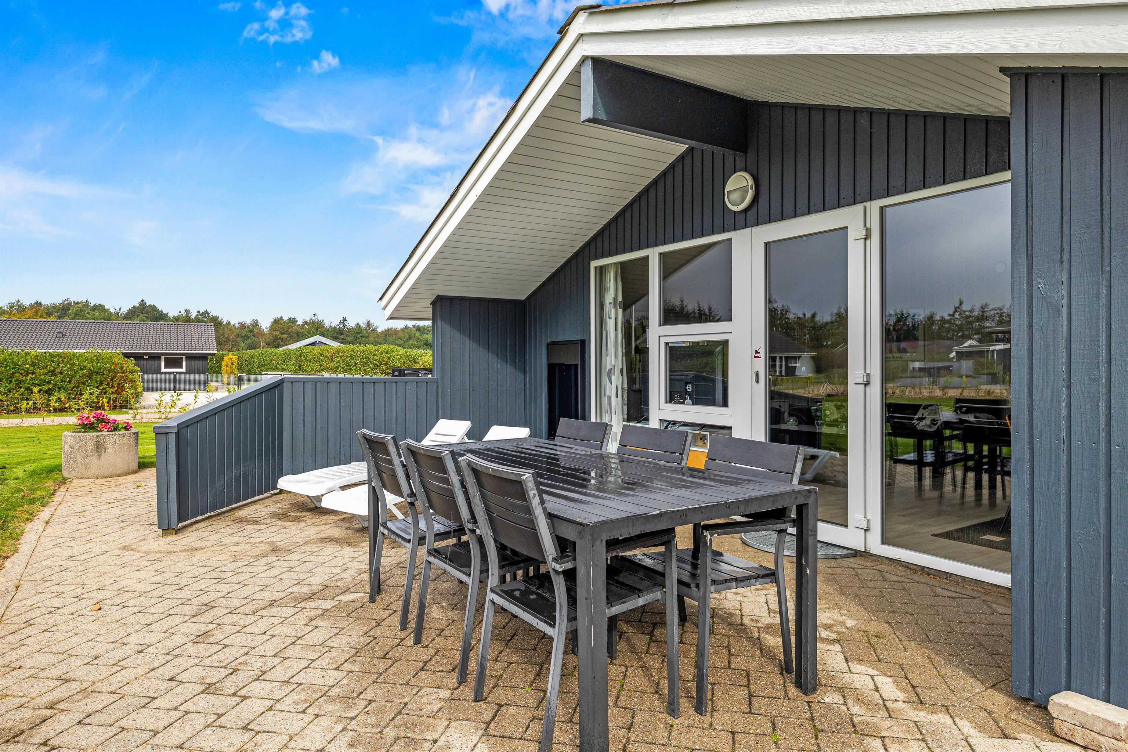 Når I trænger til frisk luft, kan I gå direkte ud på den sydvendte terrasse fra stuen. Her står havemøblerne klar. På terrassen og i haven er I lovet mange dejlige stunder med alt fra solbadning til kongespil mm. på græsplænen.