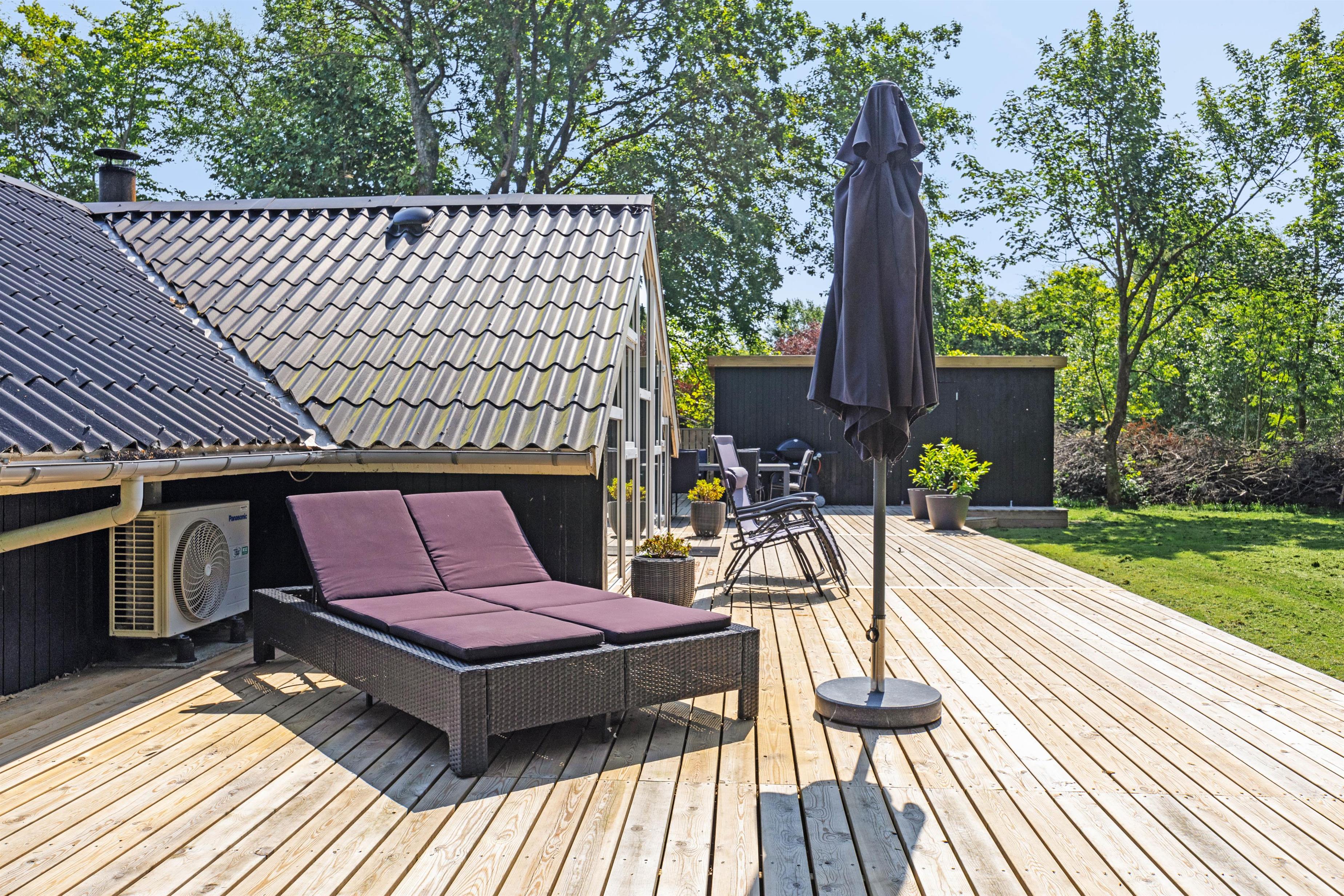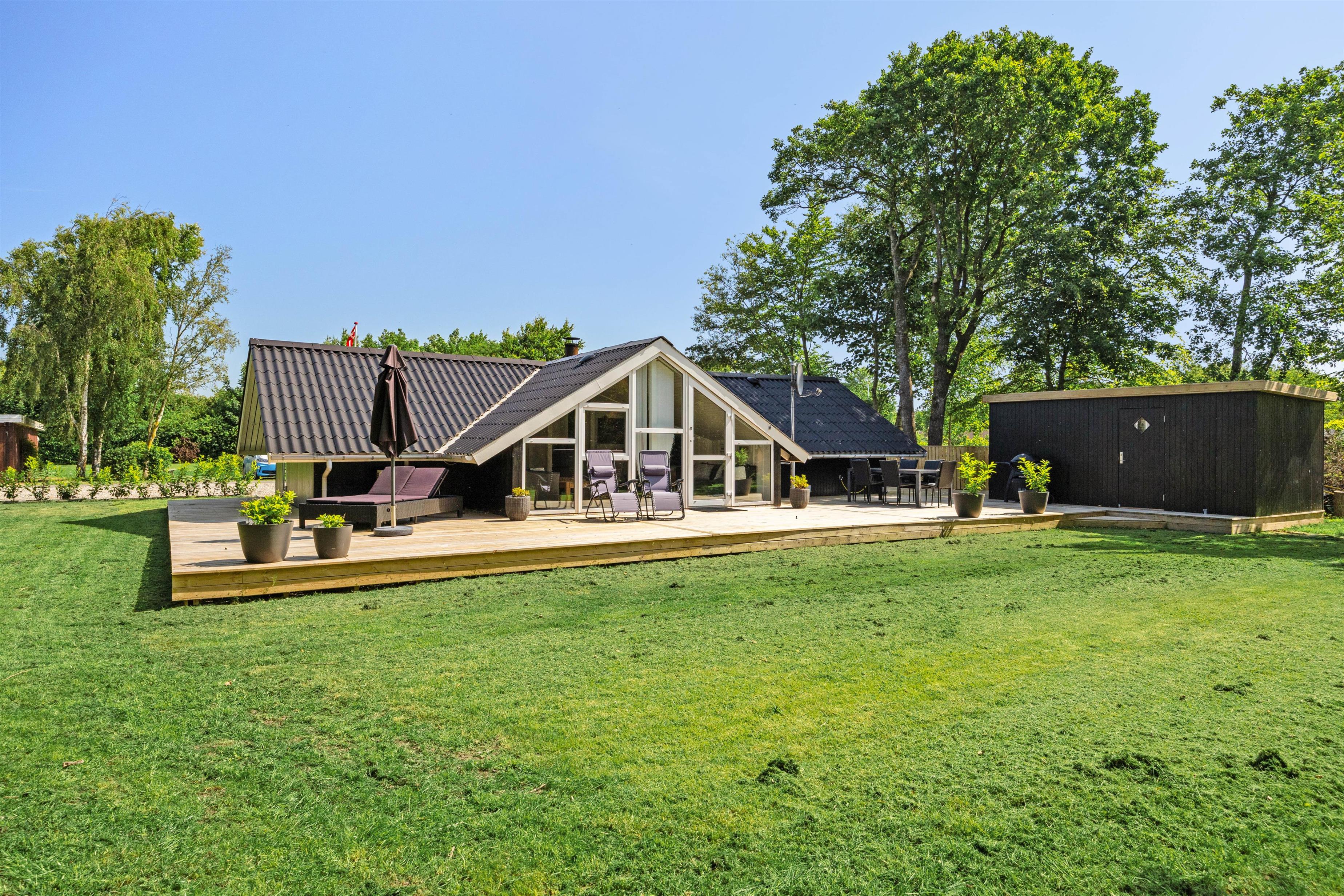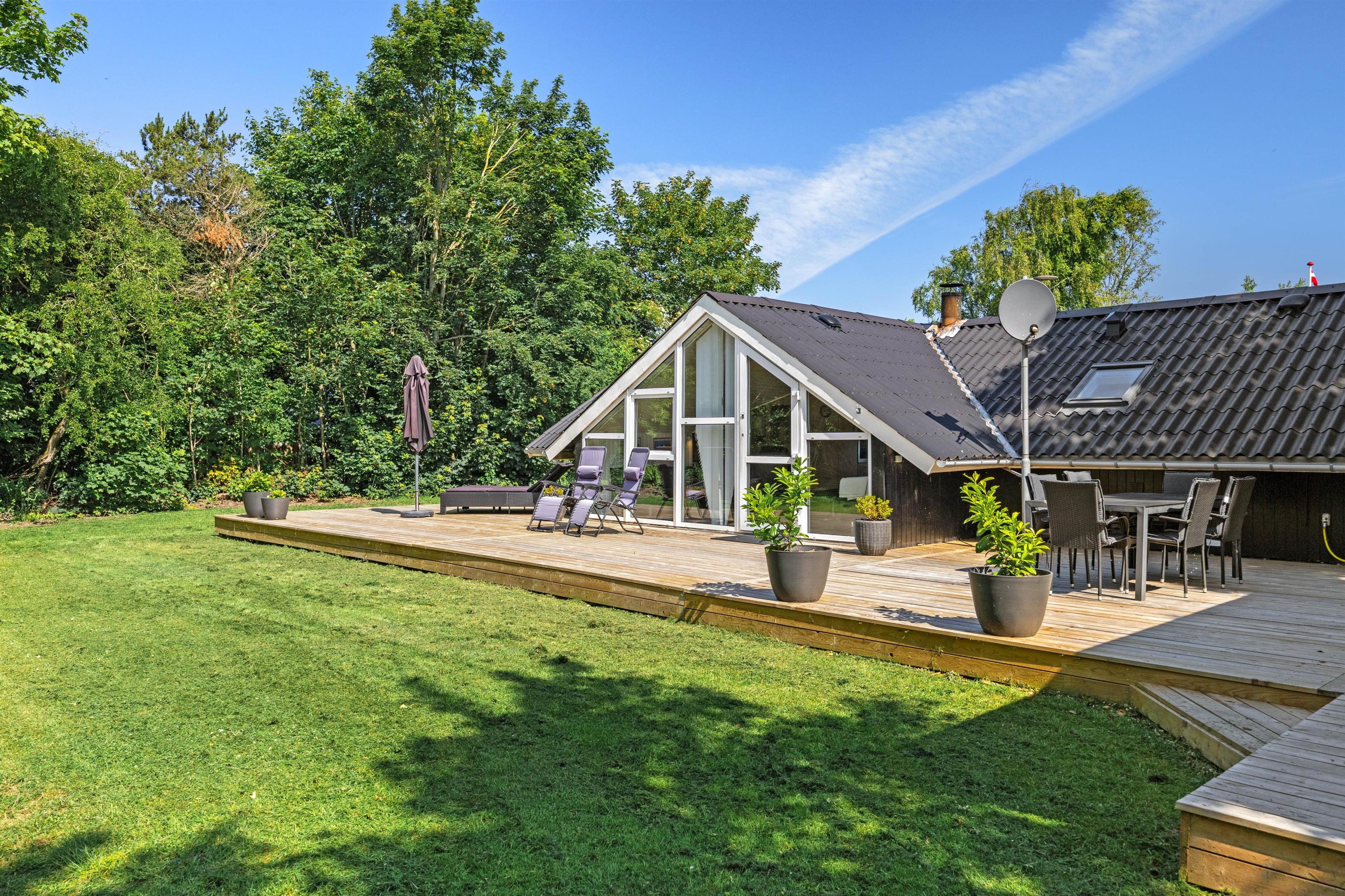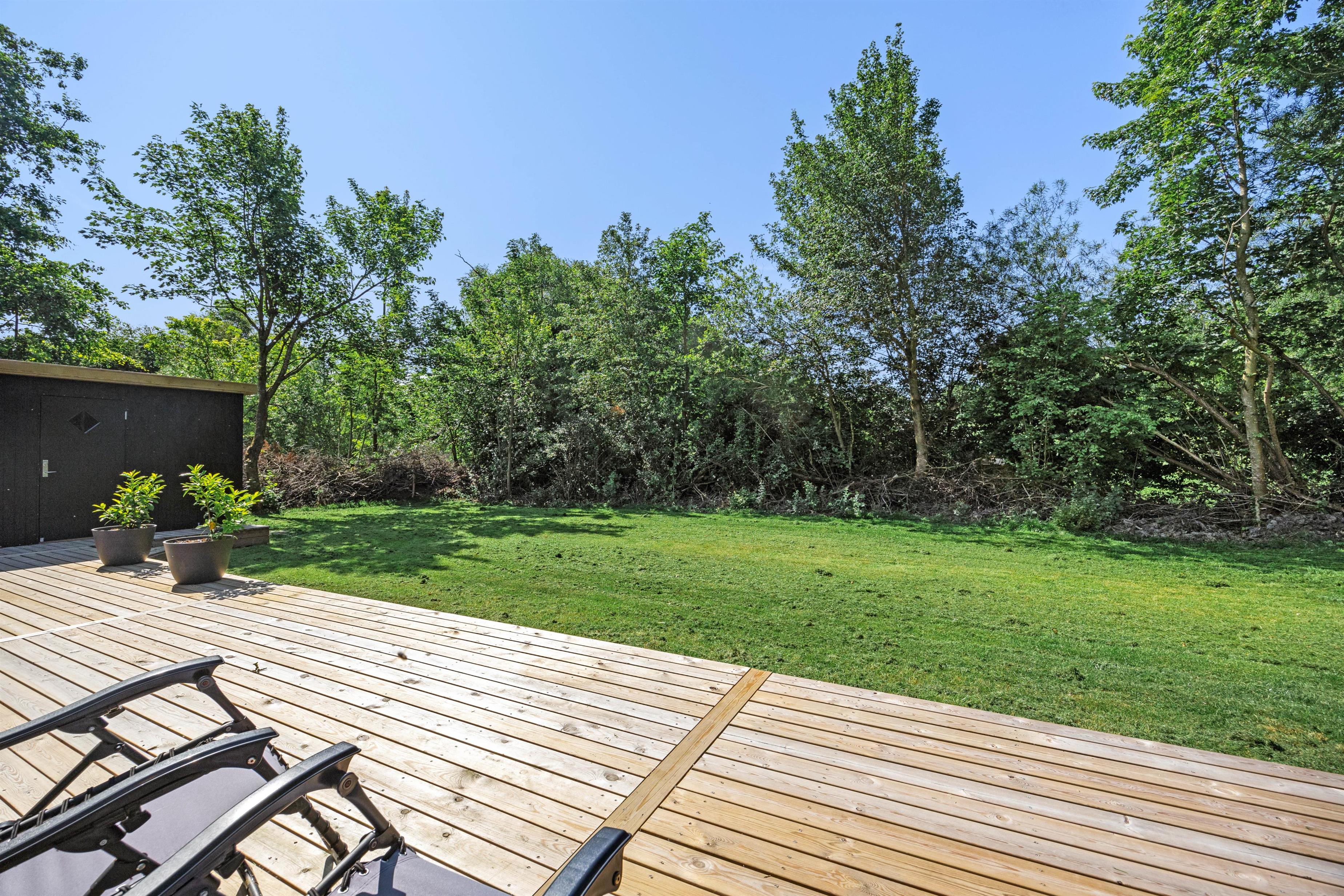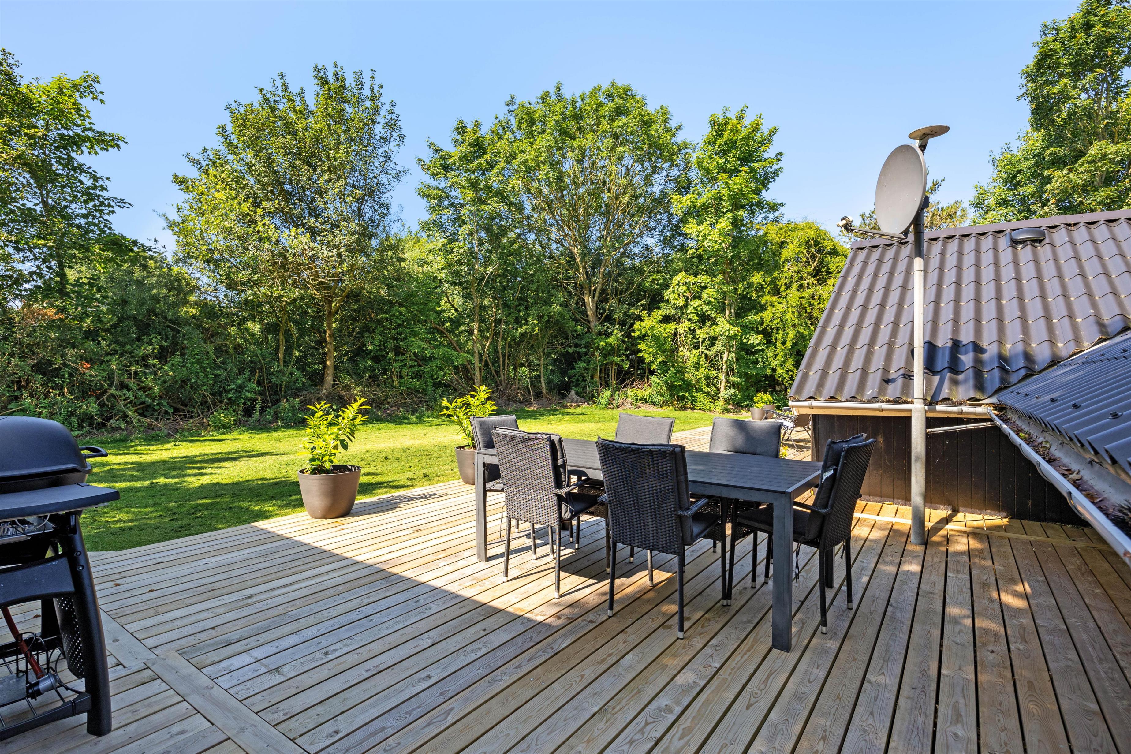 Feriehuset ligger på en plænegrund med buske og træer, der giver god beskyttelse mod vind og vejr. Dermed kan du også nyde solen på terrassen, mens børnene leger i haven. Her er god plads til, at børnene kan have det sjovt.