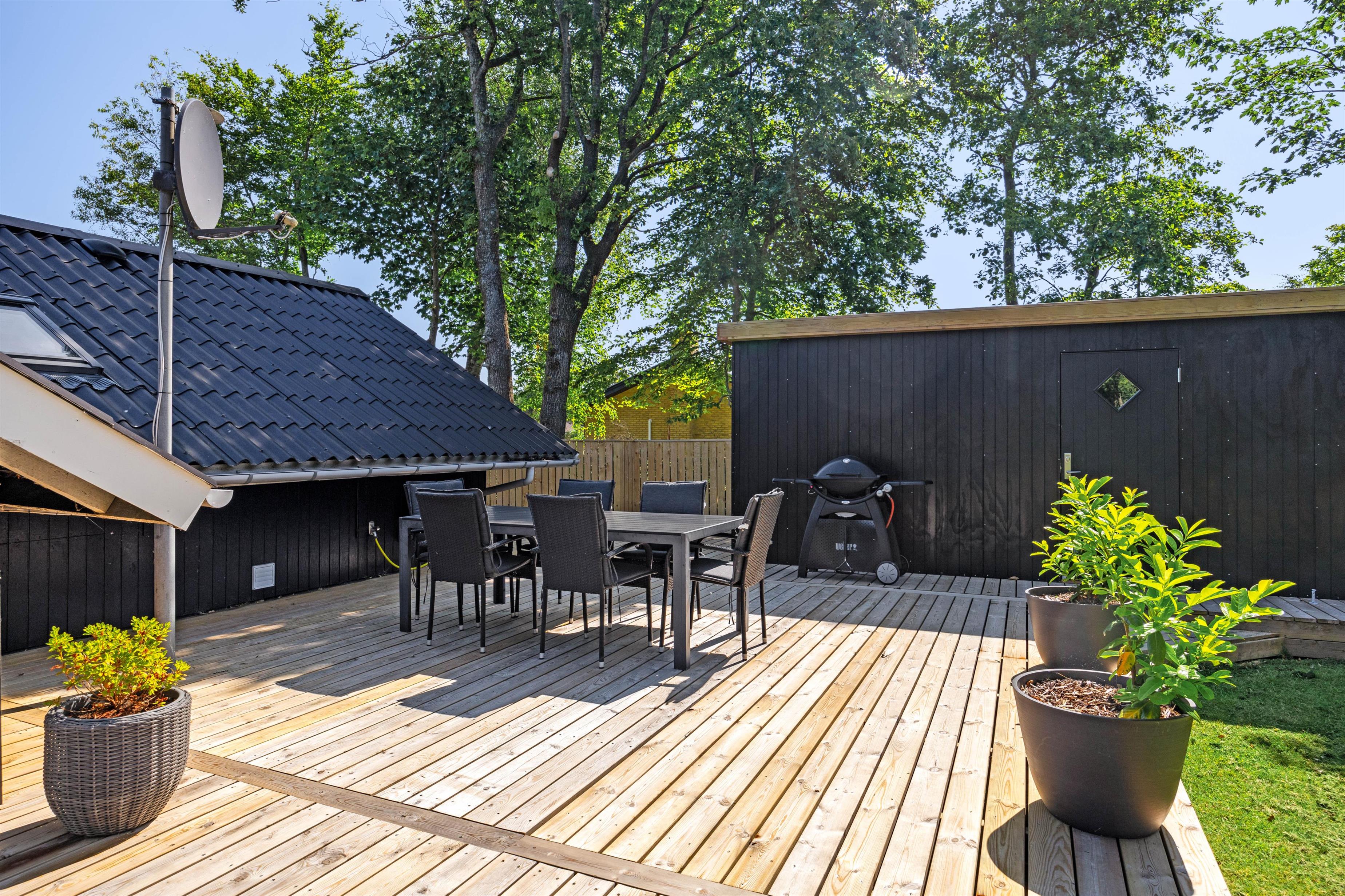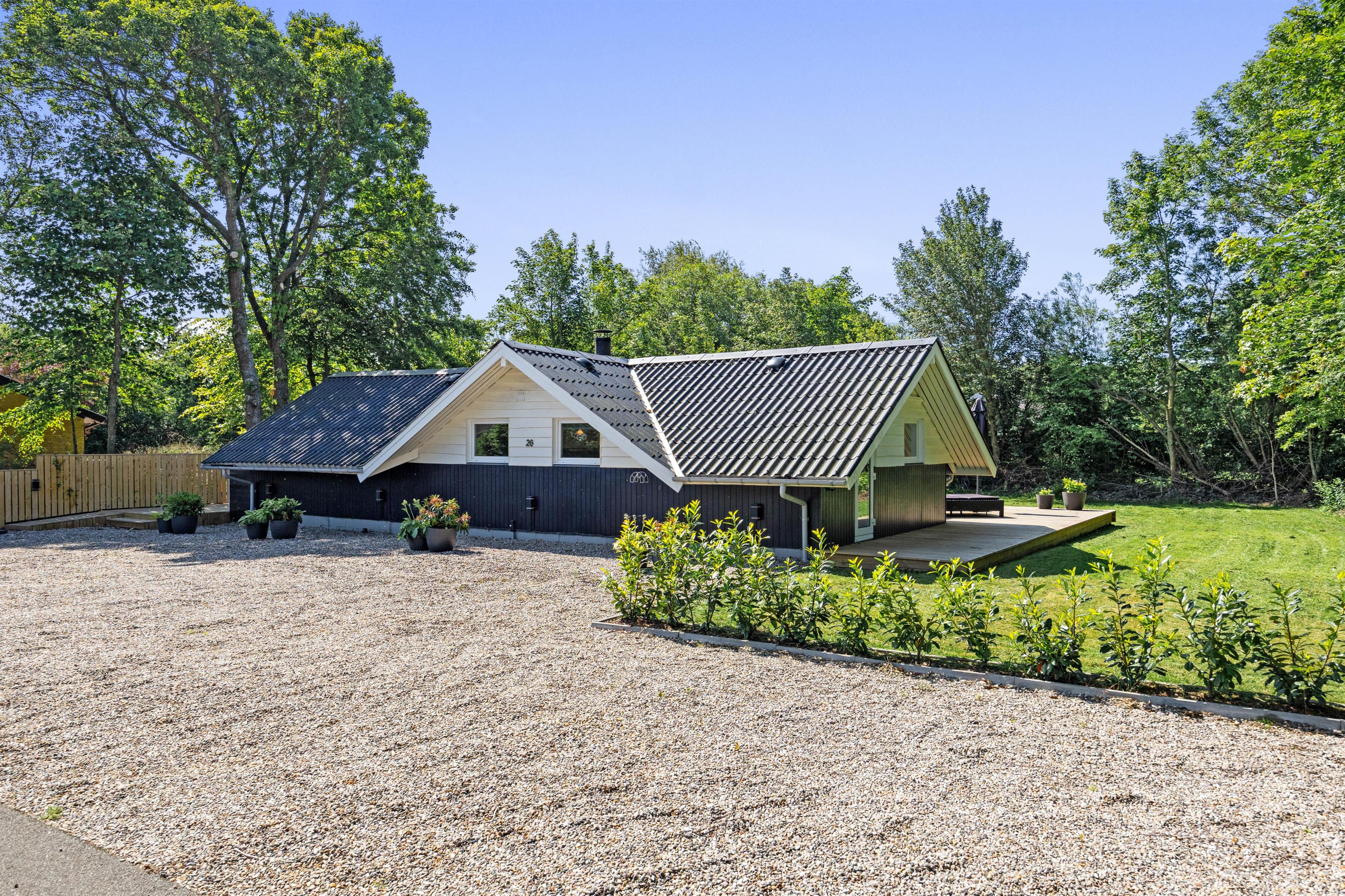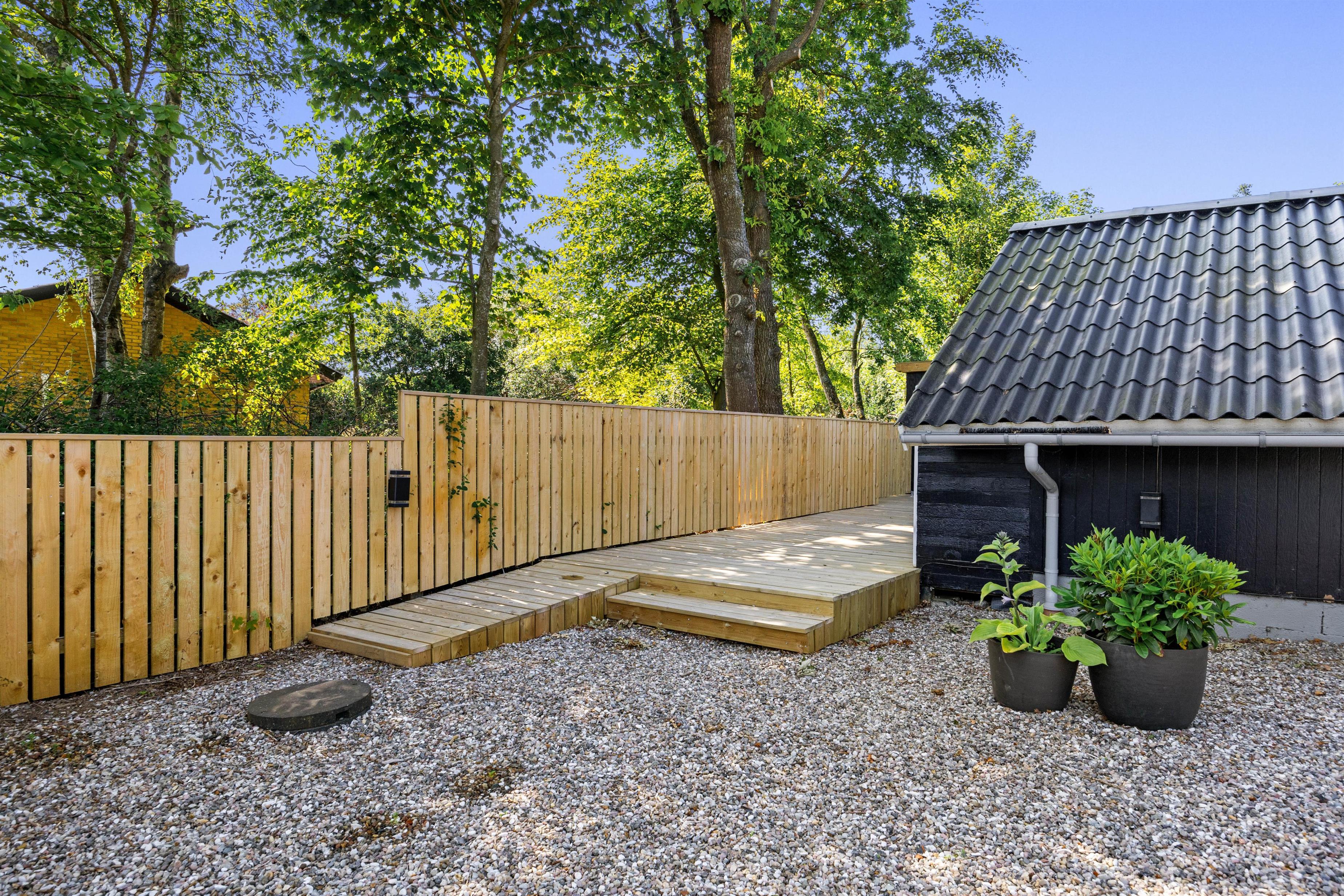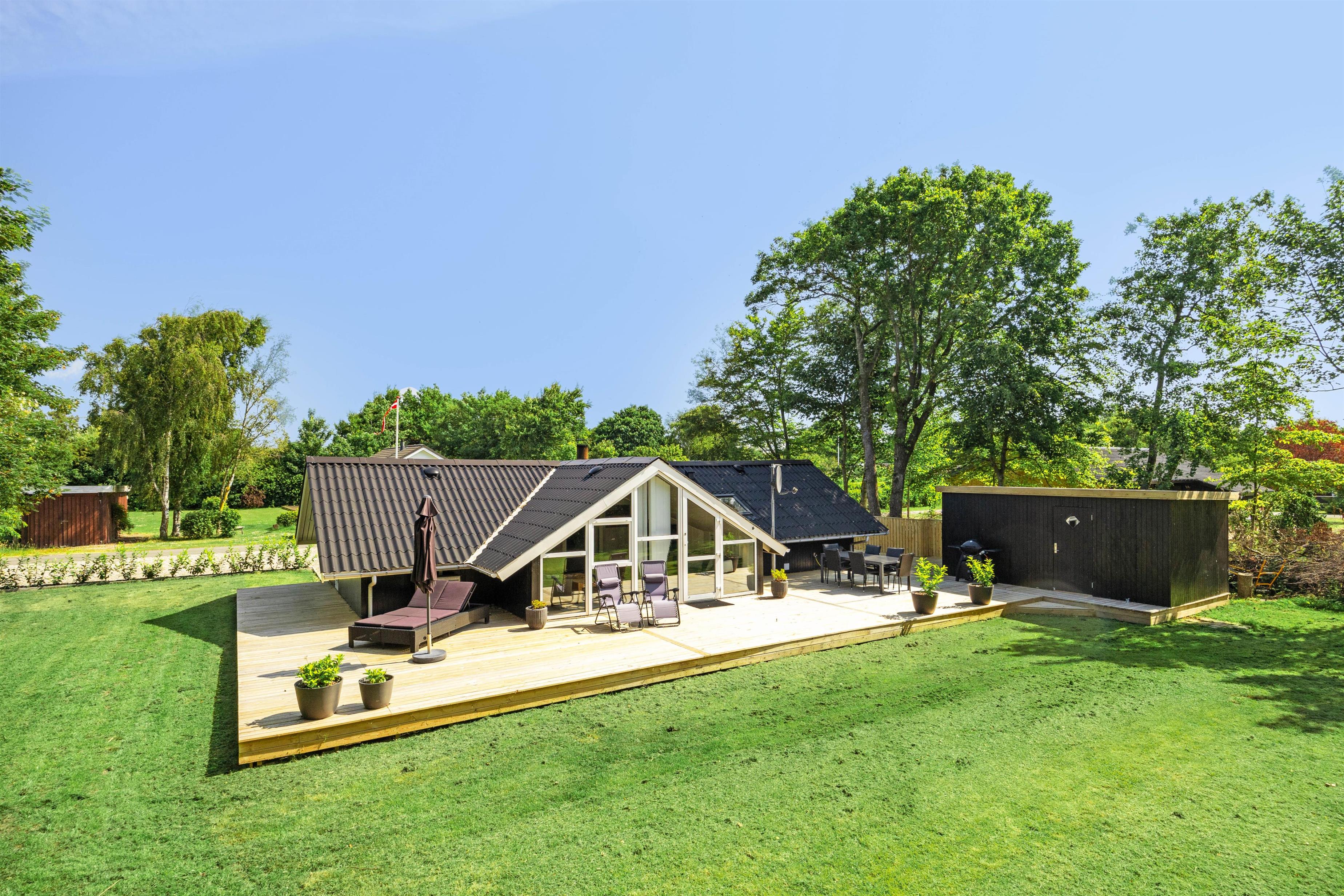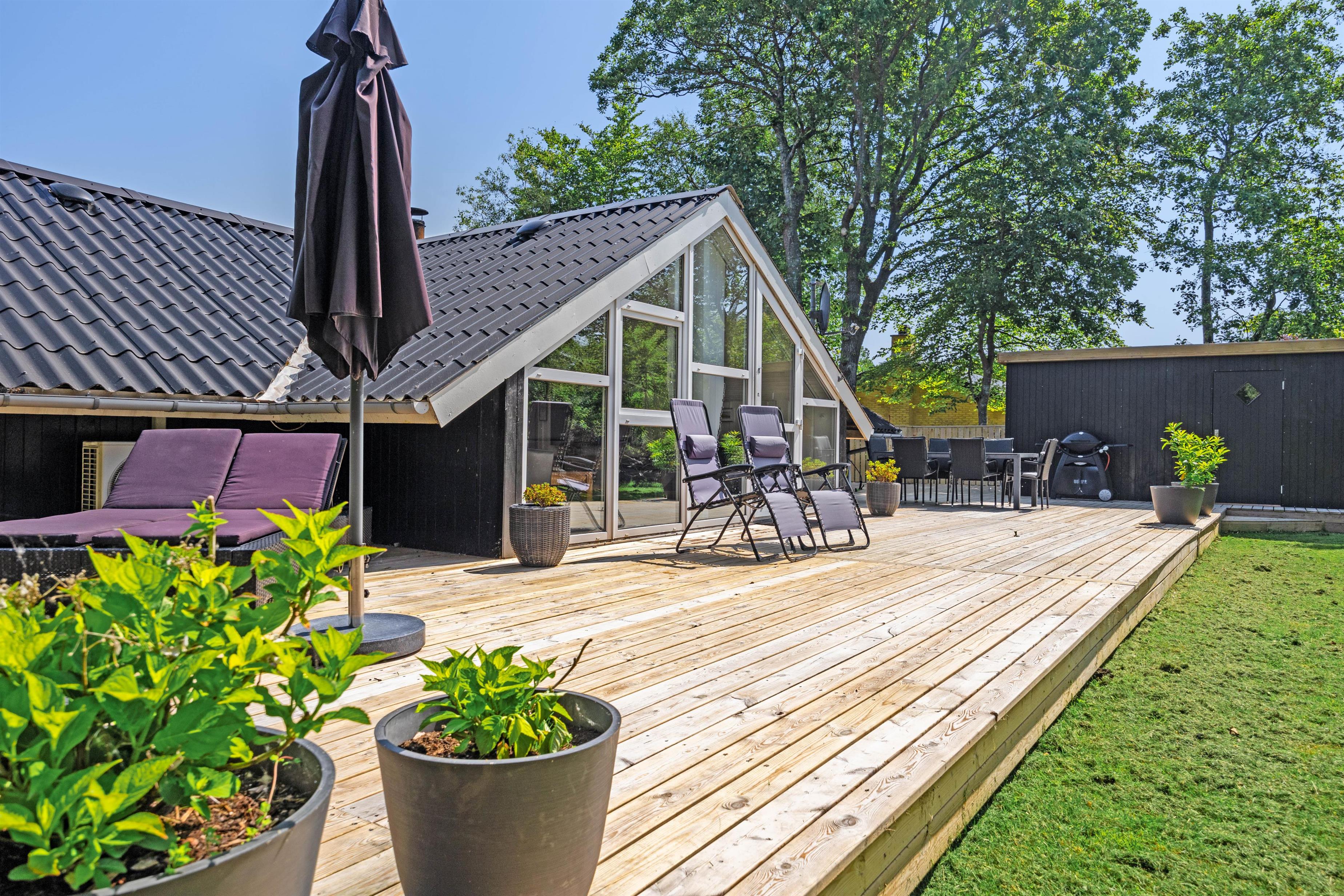 Feriehuset ligger på en plænegrund med buske og træer, der giver god beskyttelse mod vind og vejr. Dermed kan du også nyde solen på terrassen, mens børnene leger i haven. Her er god plads til, at børnene kan have det sjovt.