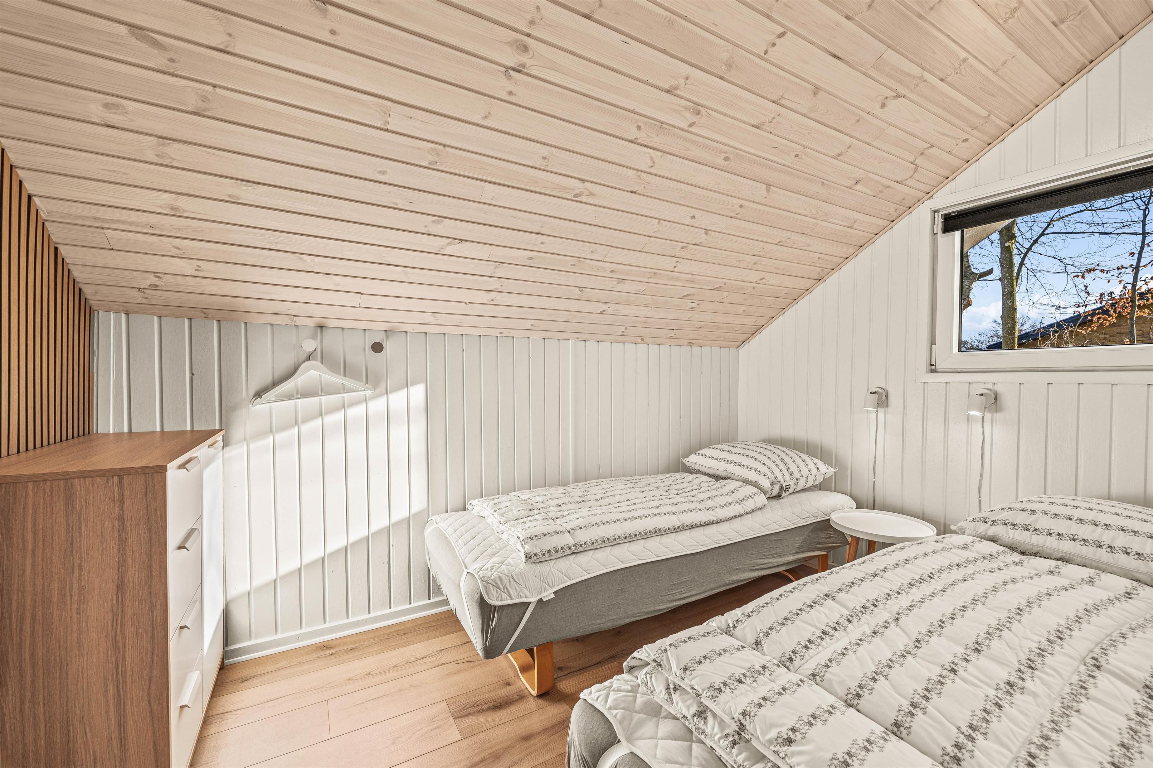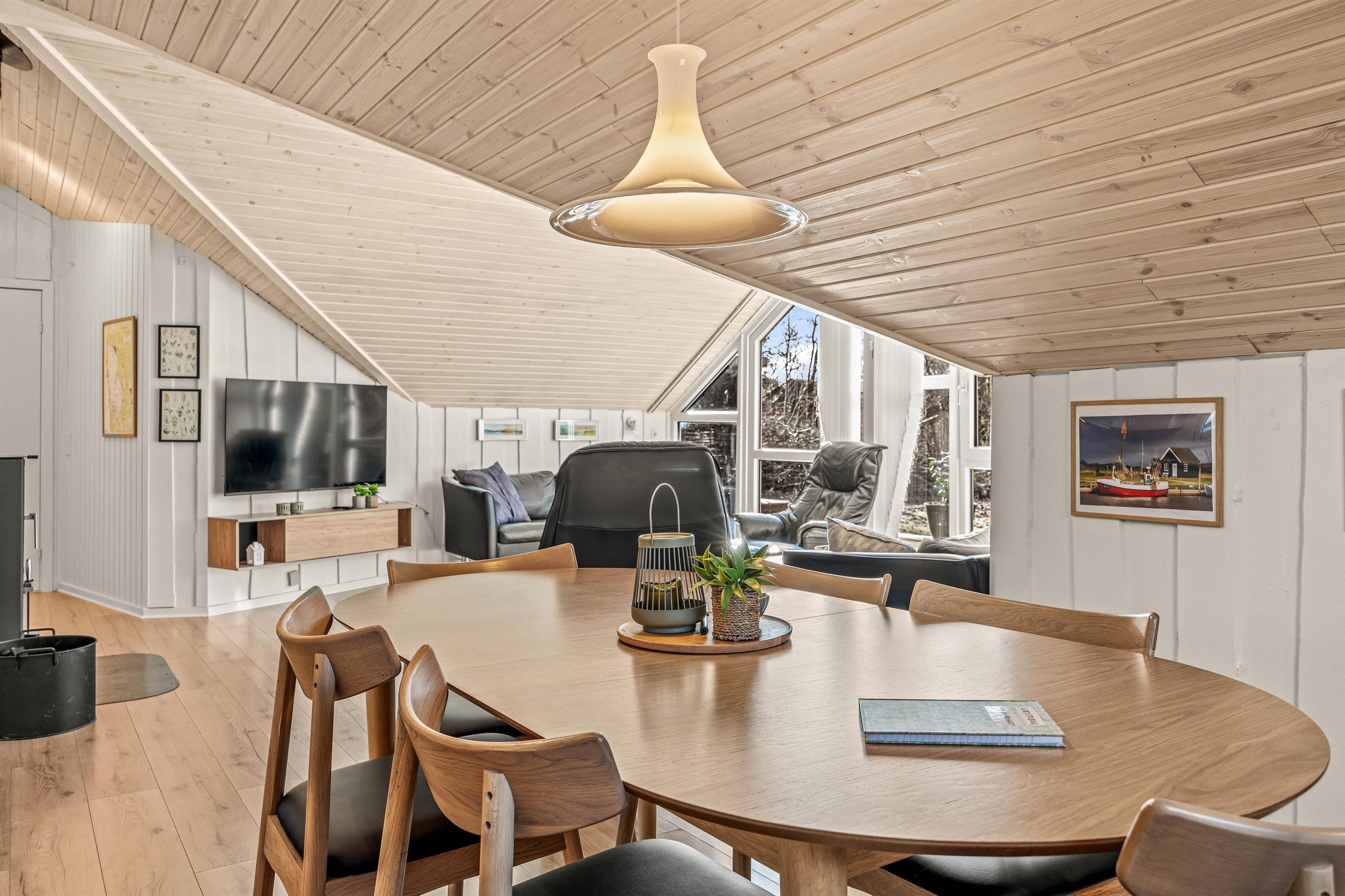 I vil hurtigt komme i feriestemning, når I ankommer til sommerhuset. De skrå lofter og lyse træfarver gør det hyggeligt og bidrager til en afslappet atmosfære. I stuen kan I sætte jer godt til rette, tænde op i brændeovnen og lytte til træets knitren. I kan med fordel også benytte jer af den energibesparende varmepumpe til opvarmning af rummet.