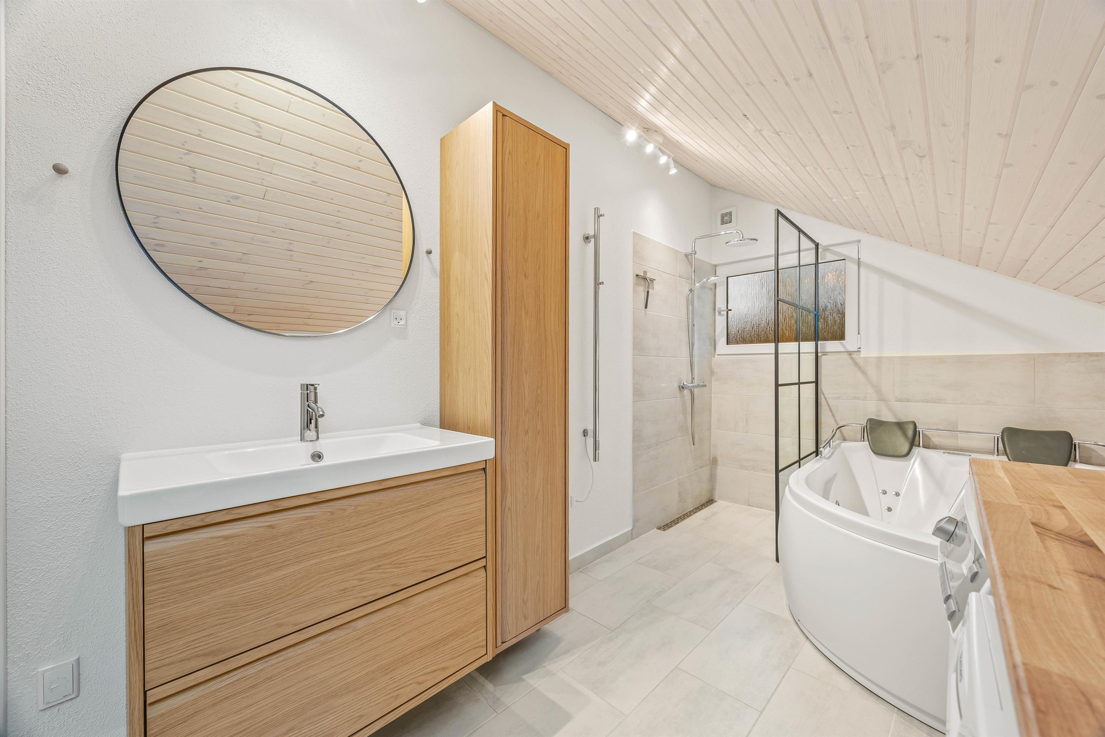 Afslapningen kan eventuelt foregå på sommerhusets badeværelse, hvor I både finder spabad og sauna. Badeværelset har desuden gulvvarme, så I ikke kommer til at fryse fødderne.
