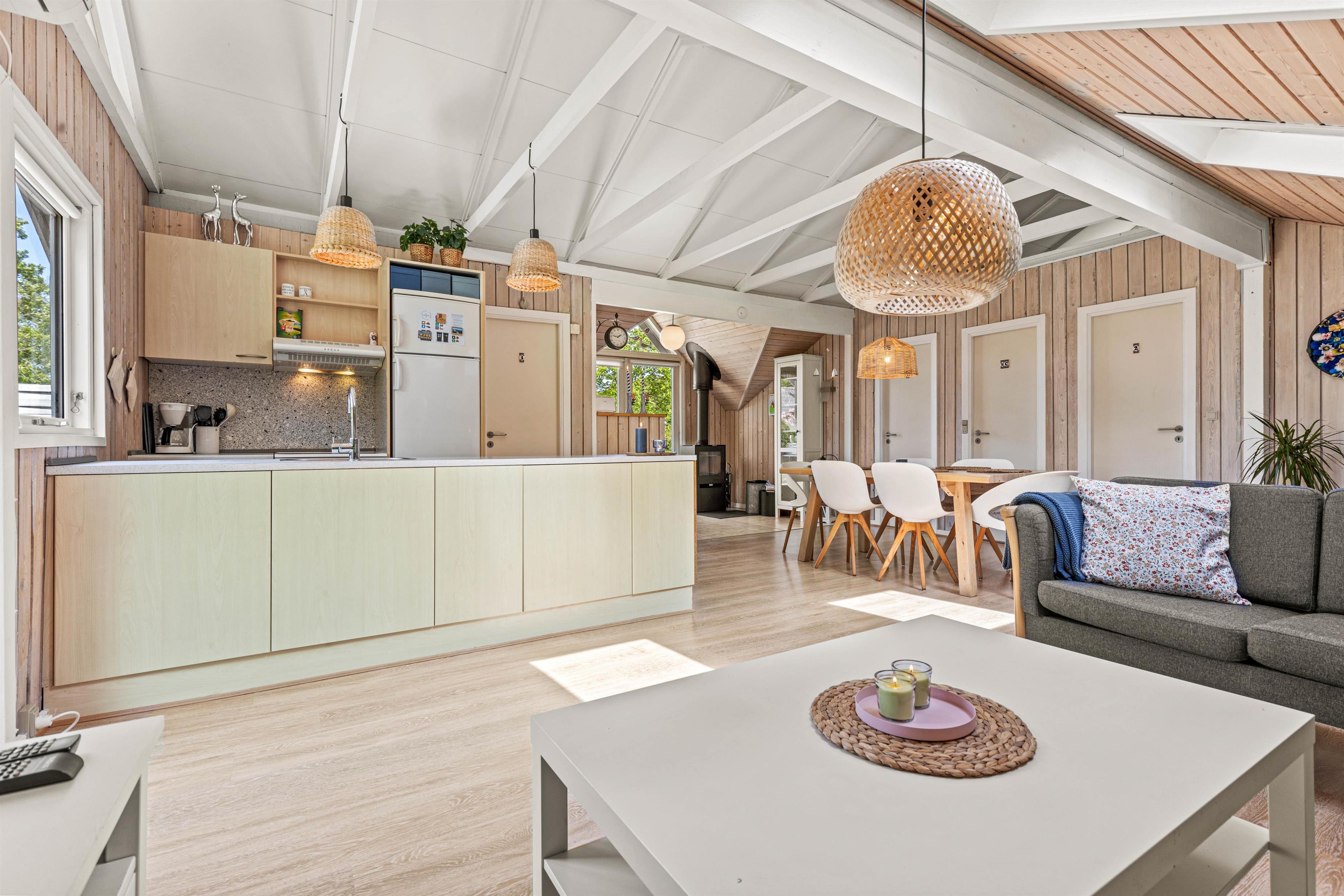 Bliv mødt af en varm og hyggelig atmosfære. Et klassisk sommerhus til 5 feriegæster med træpaneler og en knitrende brændeovn i feriehusets hjerte; køkkenalrummet.