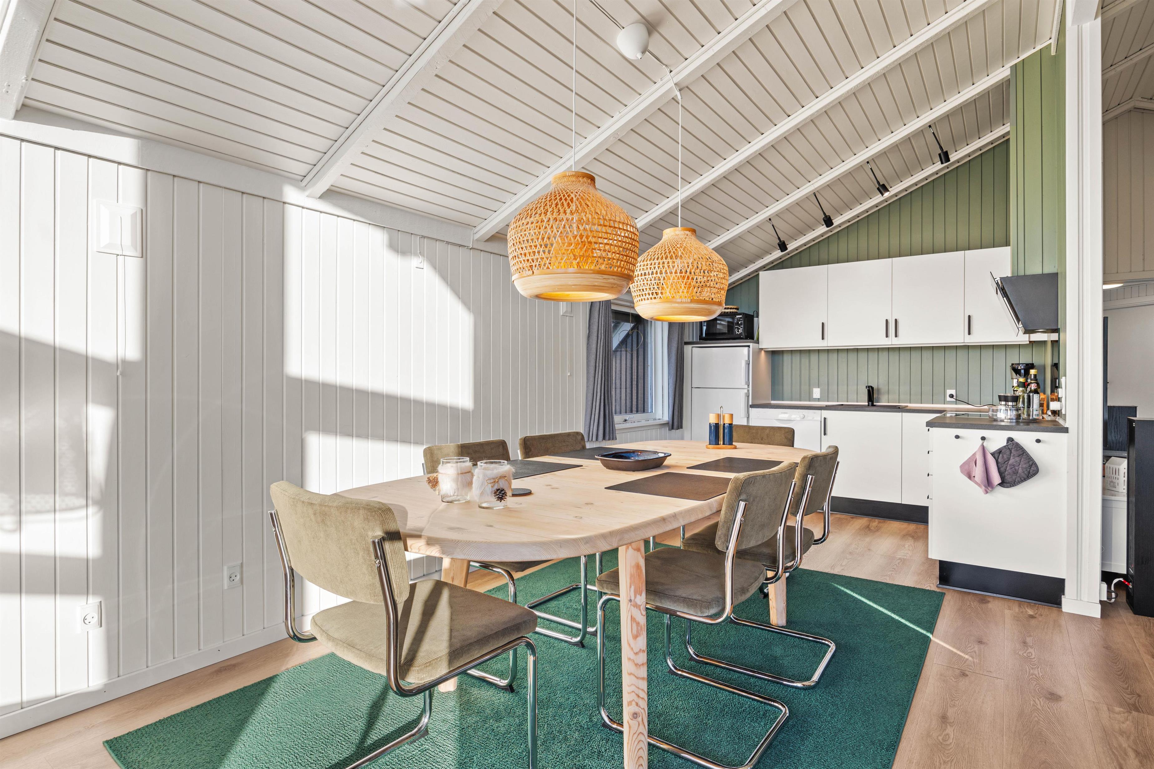 Hjertet i sommerhuset er den personligt og hyggeligt indrettede stue, som byder jer velkommen med komfortable møbler og en knitren brændeovn. Her kan I sammen se TV eller nyde jeres yndlingsmusik via Bluetooth-højttaleren. Stuen er åbent forbundet med det fuldt udstyrede køkken, der har opvaskemaskine, mikroovn, køle-fryseskab med 30 l frysekapacitet og induktionskogeplade – perfekt til fælles madlavning og hyggelige aftener.