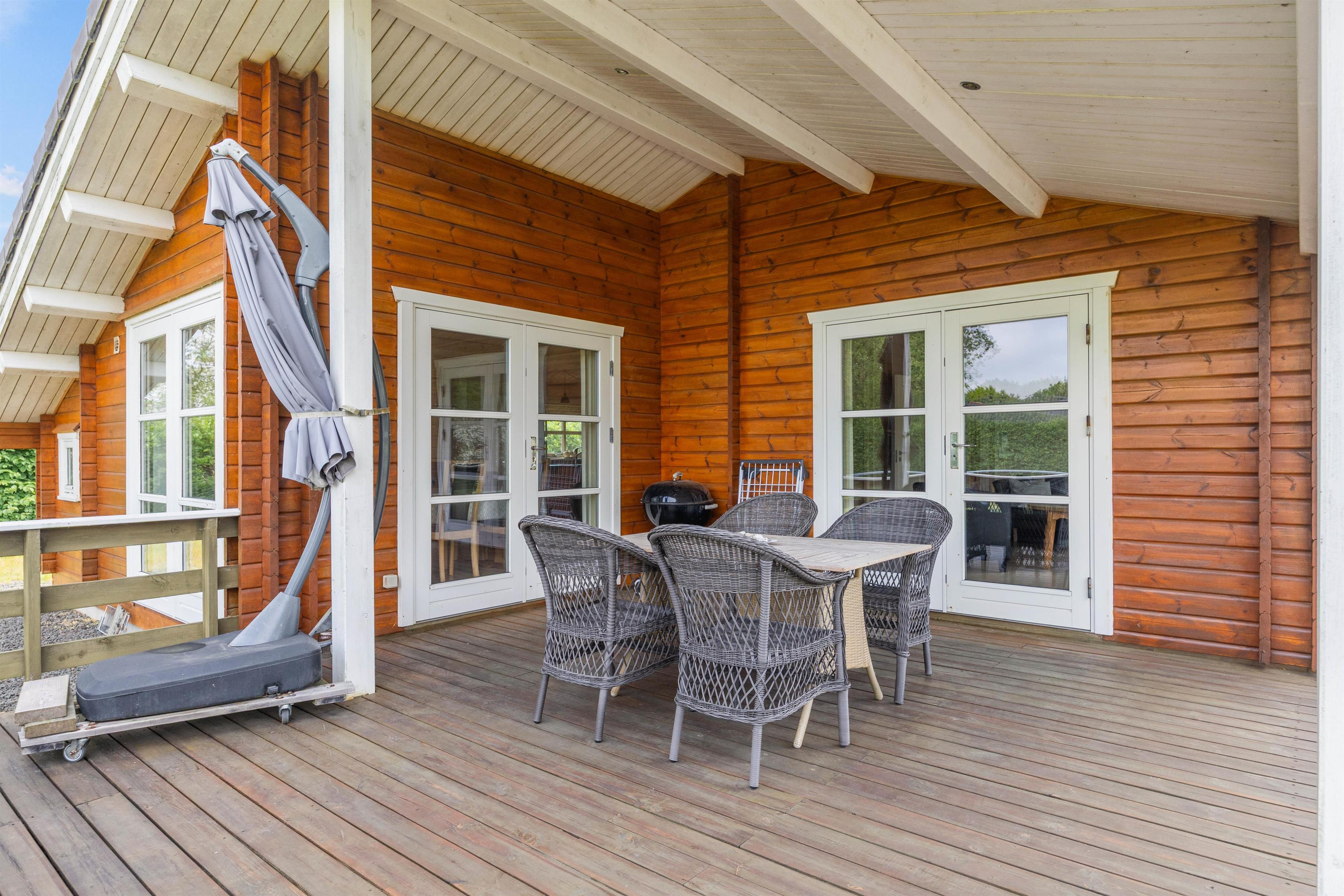 Den overdækkede terrasse er perfekt til at tilbringe tid udendørs uanset vejret; her kan I sidde med en kop kaffe om morgenen eller dele et måltid med dem I holder af. Den tilgængelige grill indbyder til hyggelige grillaftener hvor duften af grillede lækkerier fylder luften, og latter kan høres helt til solnedgang og langt ud på aftenen.