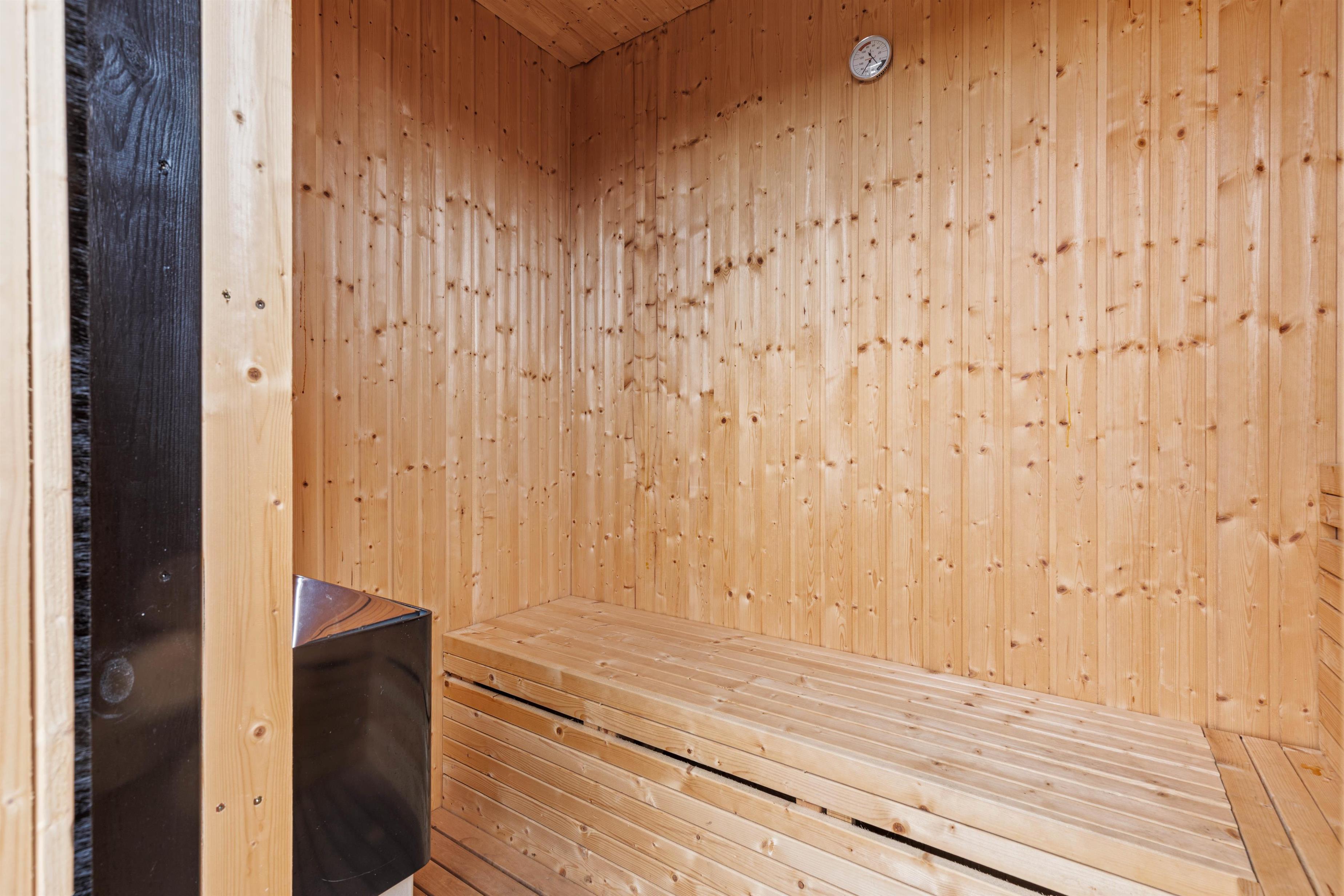 Fra køkkenalrummet kan I træde ud på den overdækkede terrasse, hvilket gør det muligt at nyde jeres måltider i alt slags vejr. Udsigten til den omkringliggende natur og lyden af fuglekvidder skaber den perfekte ramme for afslapning og gode samtaler. Højdepunktet udendørs er helt sikkert den afskærmede terrasse, hvor I både finder en behagelig spa, udebruser og sauna. Udebruseren kan benyttes fra april til november, hvilket giver jer mulighed for at nyde de forfriskende faciliteter i lang tid af året.