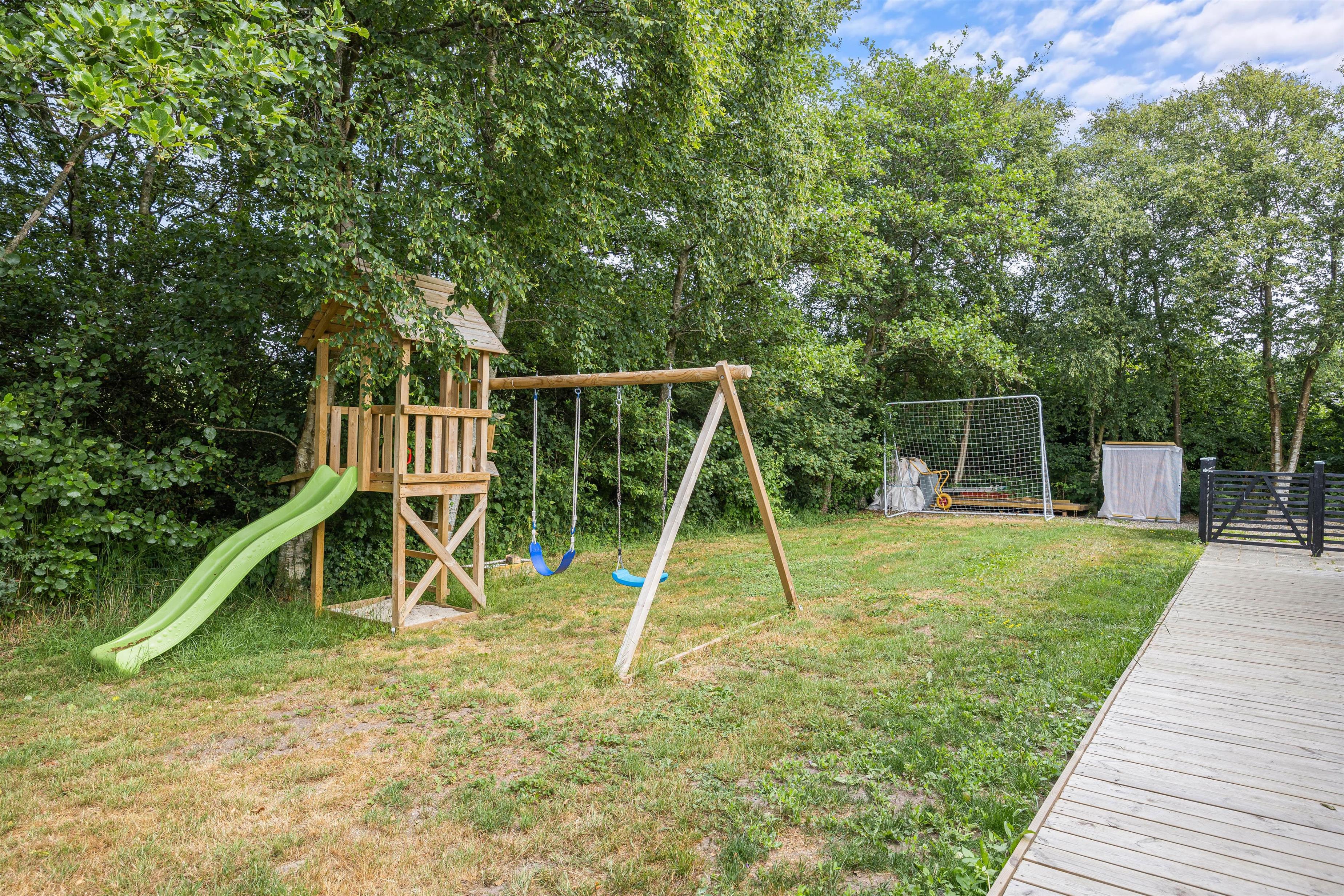 Grunden er indhegnet, så I ikke behøver at bekymre jer om, at børnene tager alene på eventyr. I stedet kan børnene brænde energien af på græsplænen eller på gyngen.