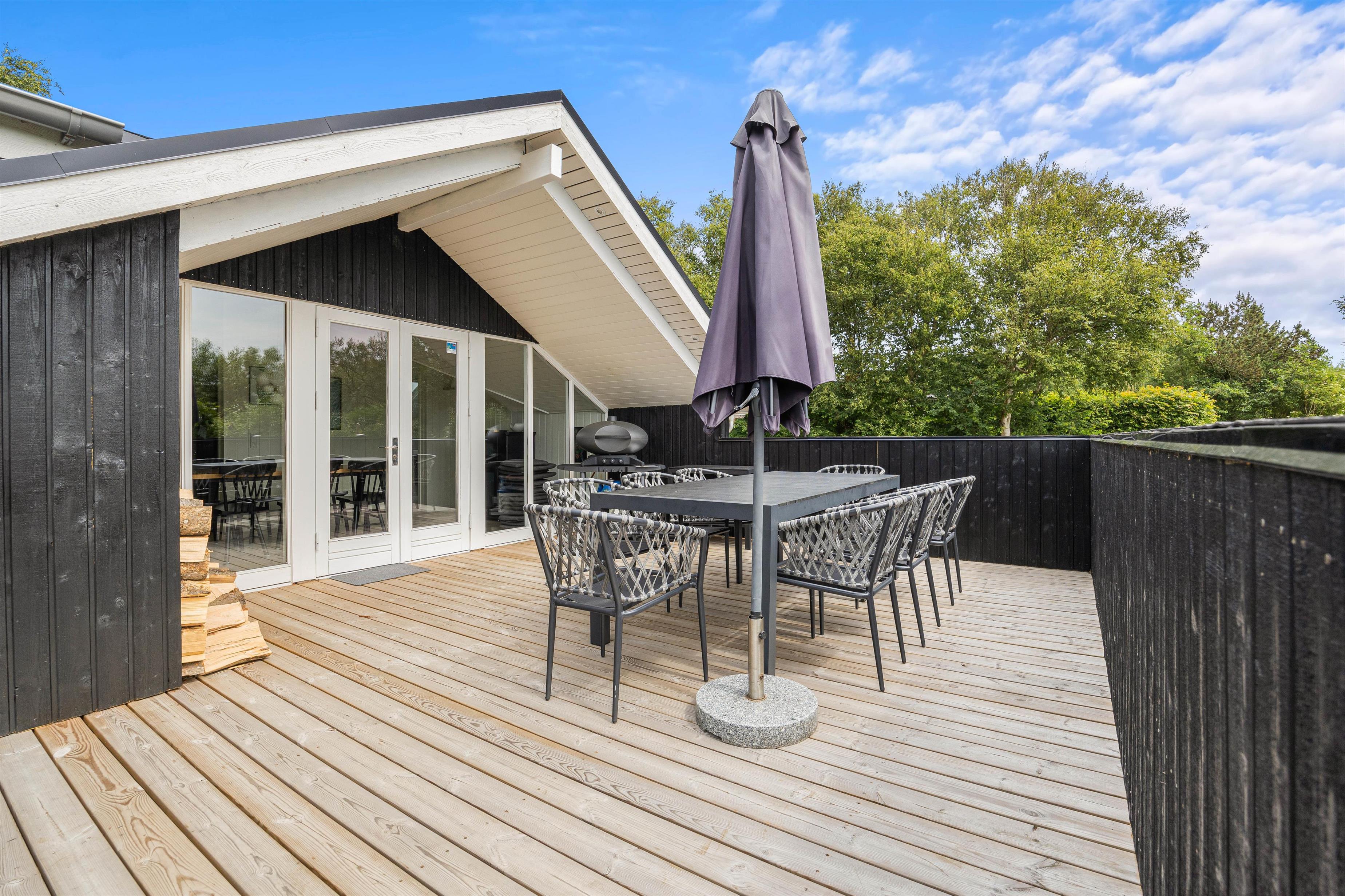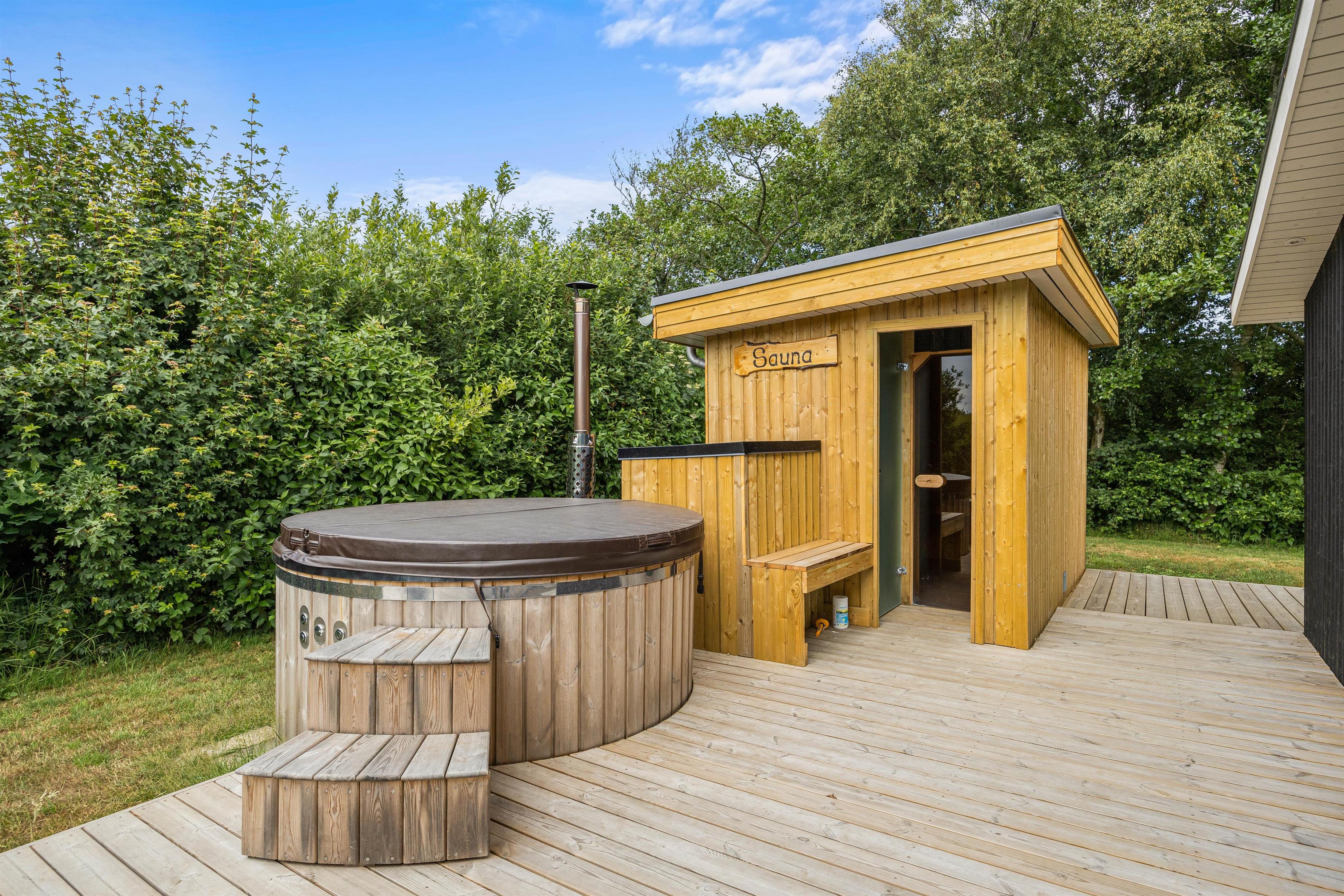 På den anden side af sommerhuset venter jer en skøn wellness-oase med et skønt vildmarksbad, en dejlig udendørs sauna og en praktisk udebruser, der kan benyttes fra april til november. Denne samling giver jer mulighed for at nyde en afslappende pause omgivet af naturen, hvor I kan lade hverdagens stress smelte væk i sæsonens varme måneder.