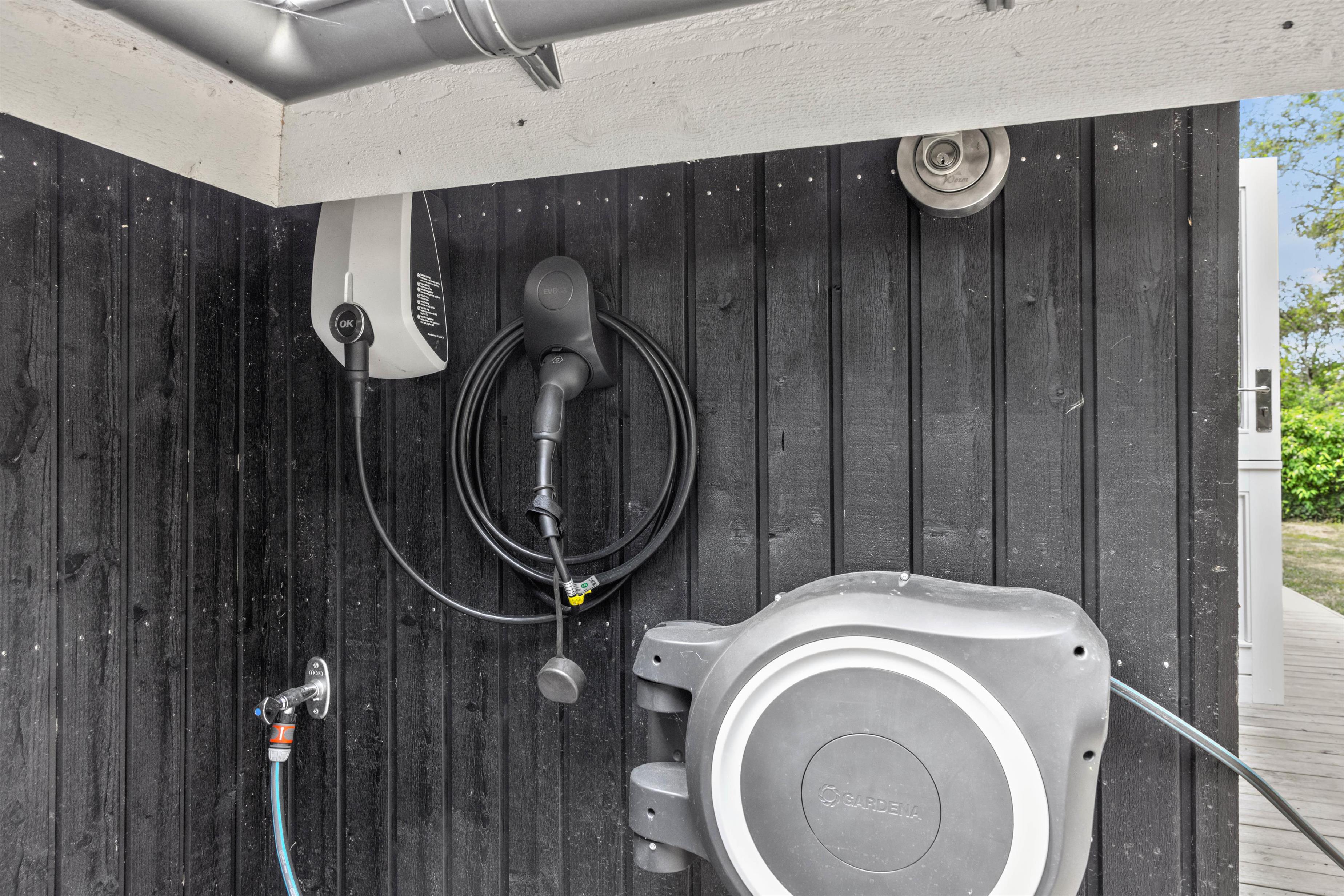 Hvis I er kommet i elbil, kan I lade den op ved ladestationen i sommerhuset; det eneste, I skal gøre, er at medbringe jeres ladekabel.