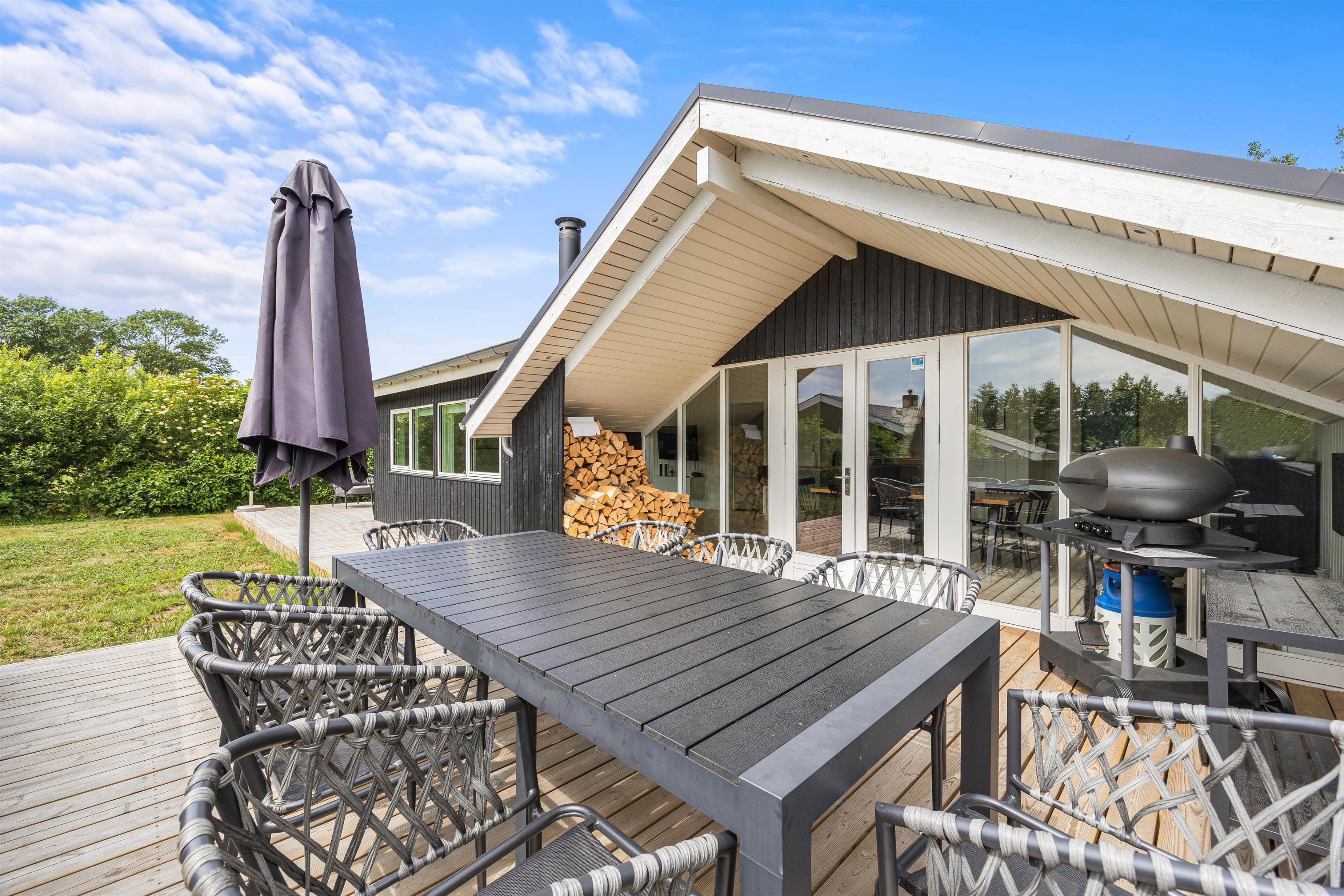 Fra stuen kan I træde ud på en stor terrasse, der er delvist overdækket, hvilket gør det muligt at nyde et måltid i det fri, uanset hvordan vejret arter sig. Terrassen er ideel til hyggelige stunder med familie og venner, og fra terrassen kan I træde ud på plænen.