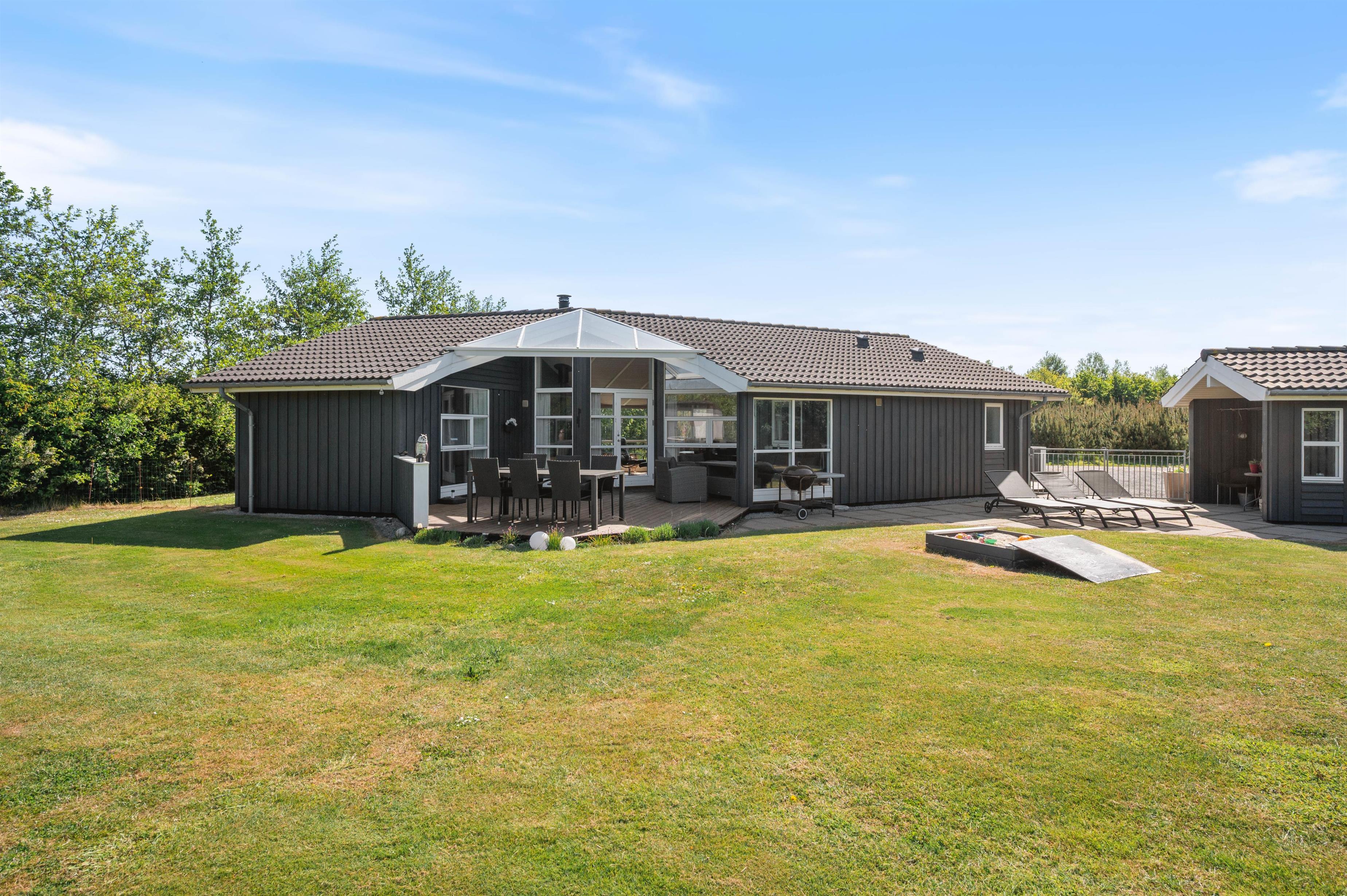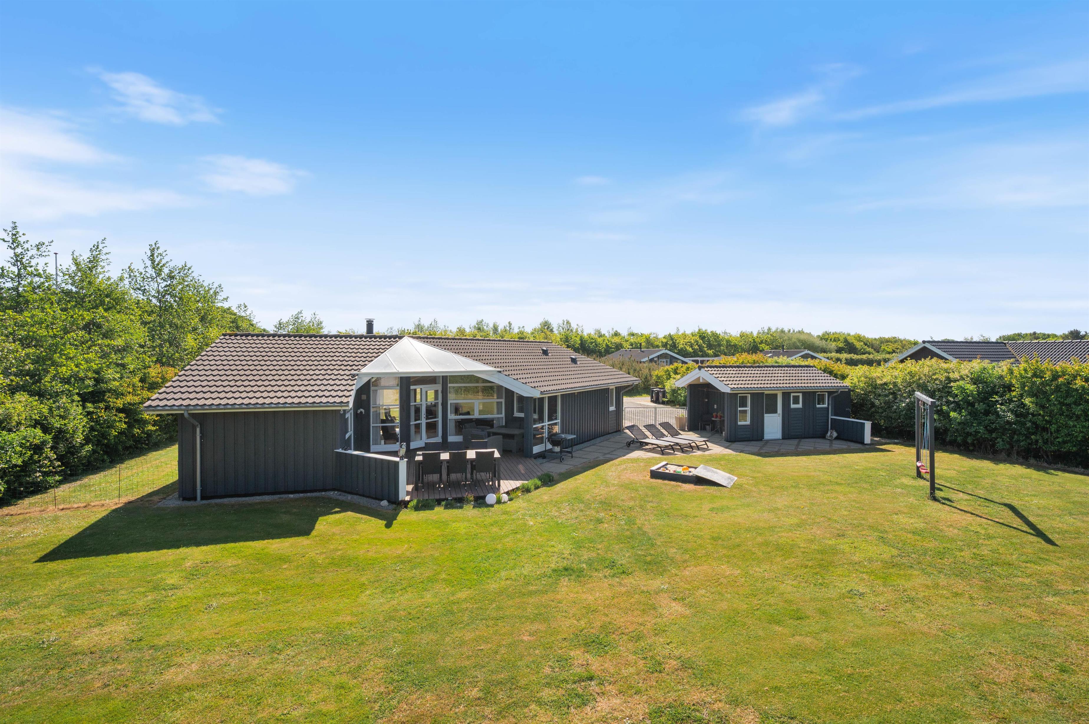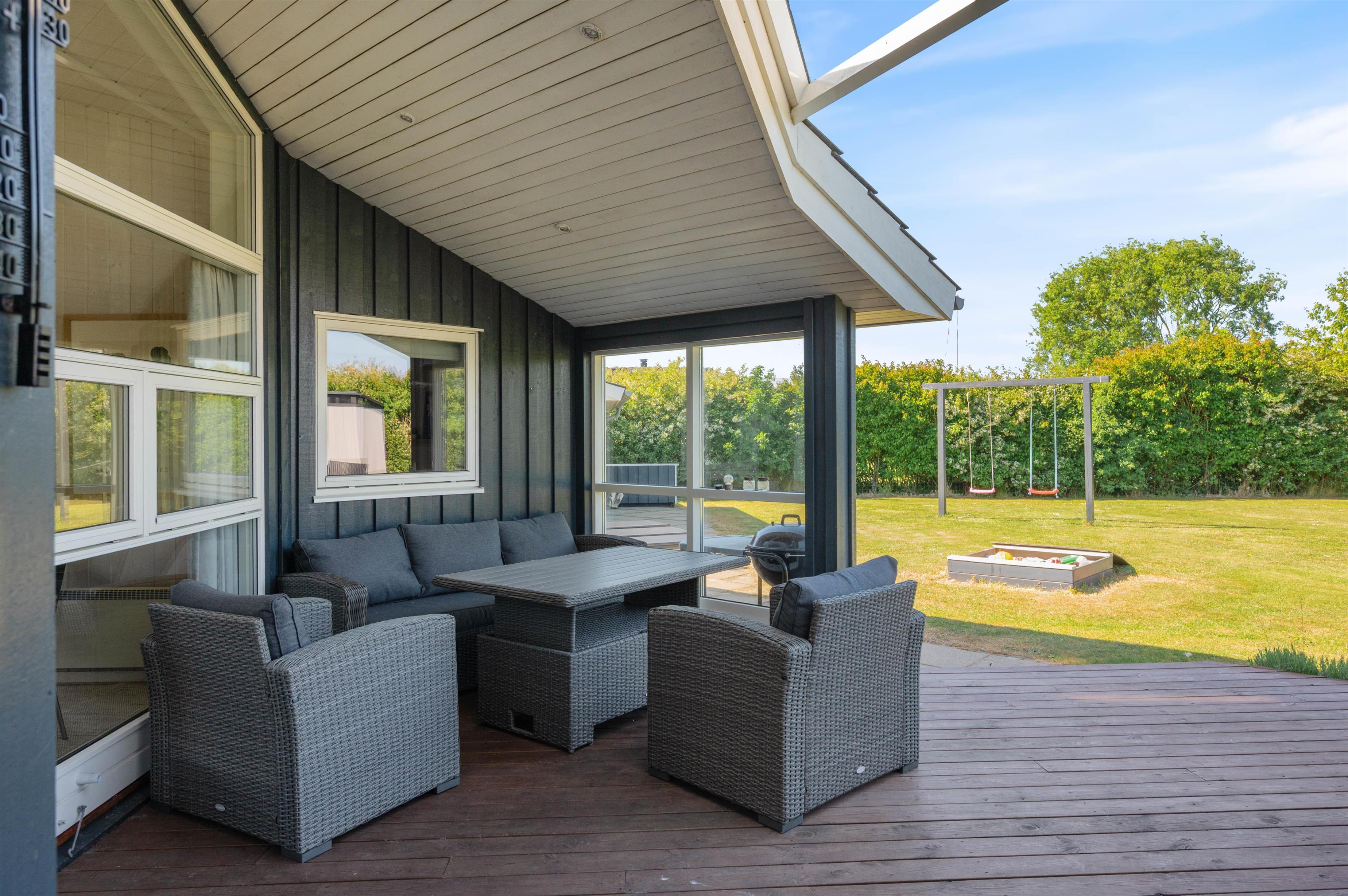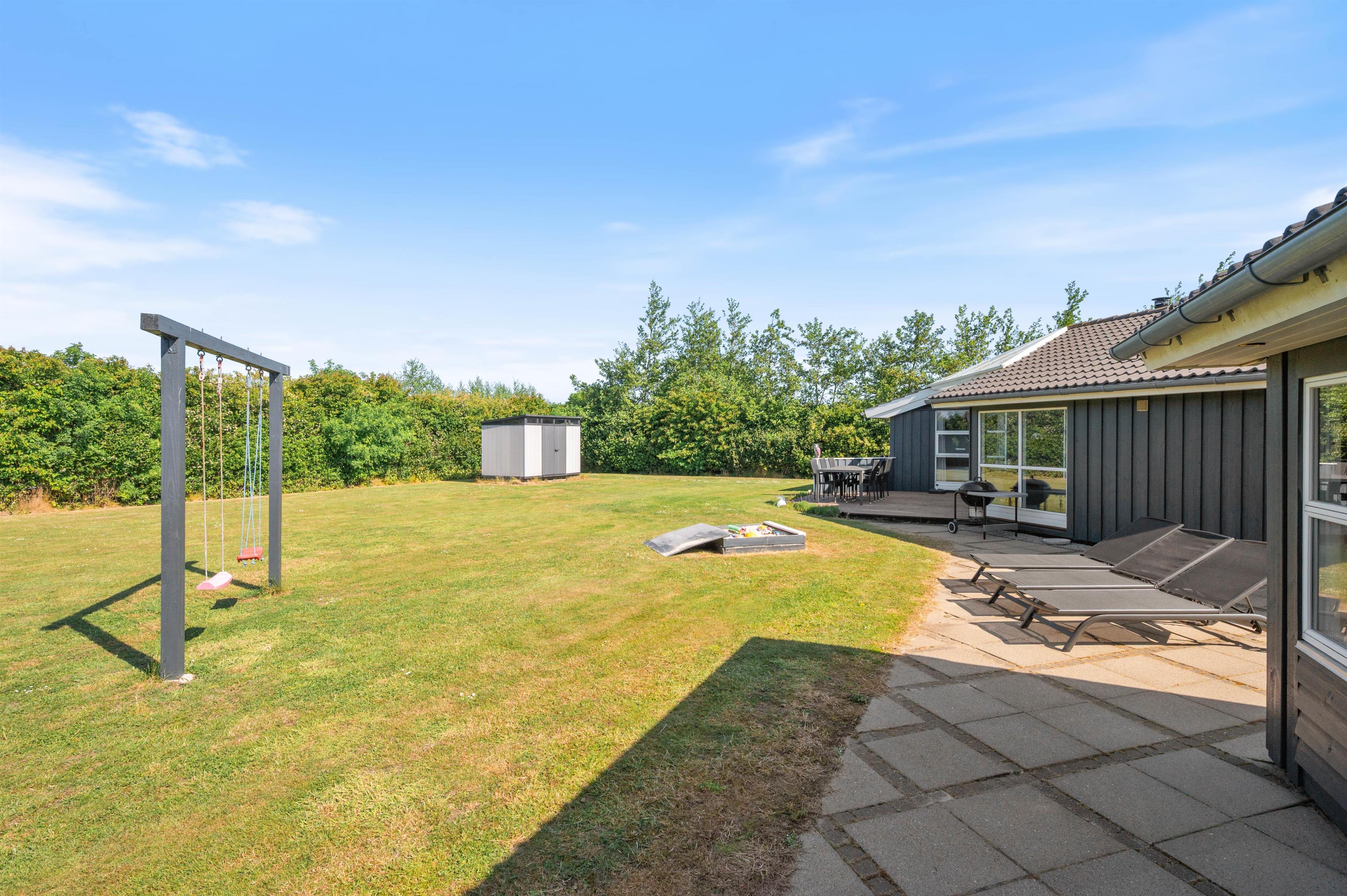 Udearealet omkring sommerhuset i Bork Havn byder på fantastiske muligheder for afslapning og leg i det fri. Med en rummelig grund på 1238 m² er der masser af plads til at nyde de lange, solrige dage. Her kan I tænde op i grillen og tilberede et lækkert måltid, som kan nydes på den afskærmede eller overdækkede terrasse – uanset vejret er her altid et behageligt sted at sidde.