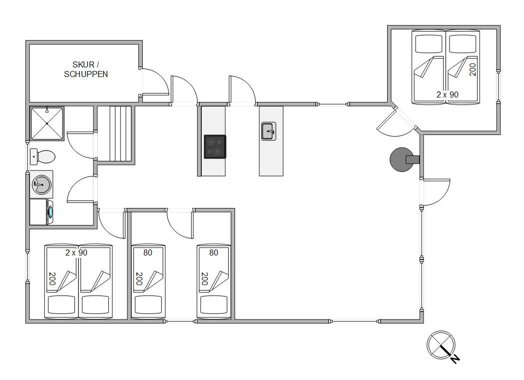 Indenfor venter en lys og åben opholdsstue med en behagelig sofa og tv, der udgør centrum i sommerhuset. Her kan I nyde hyggelige stunder i sofaen, mens I ser en film, spiller kort eller læser en god bog. Det store vinduesparti giver masser af lys og en smuk udsigt til den omkringliggende natur. Den åbne hems med tv vil især være et hit for børnene.
