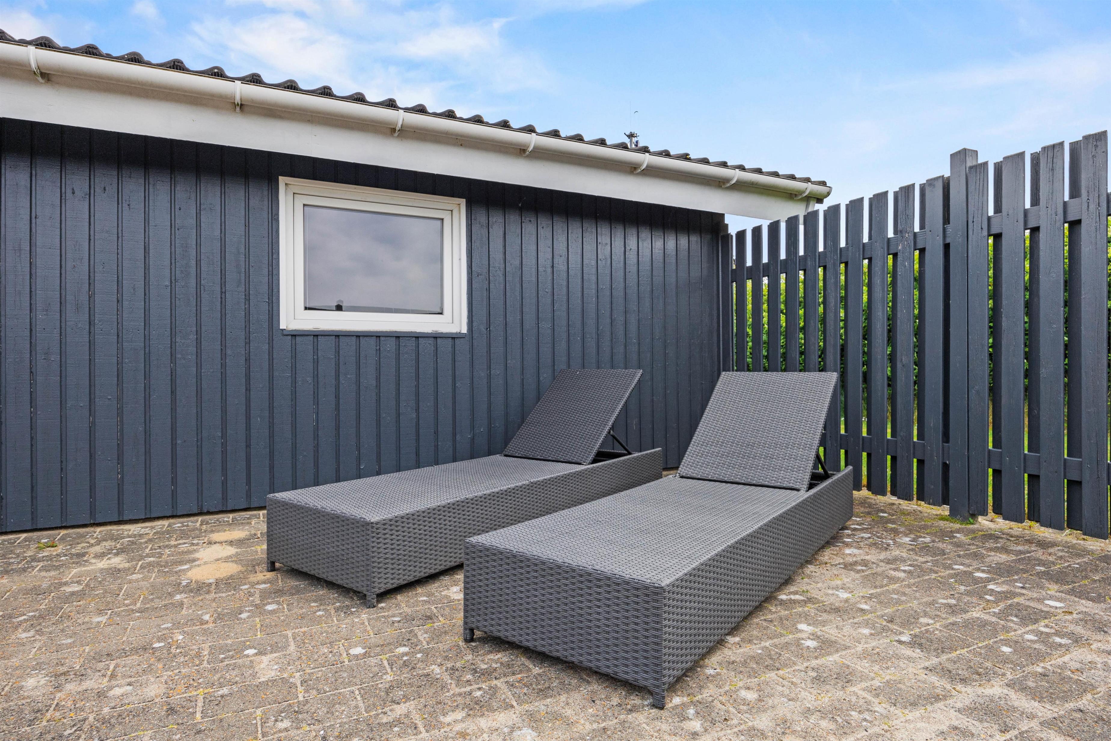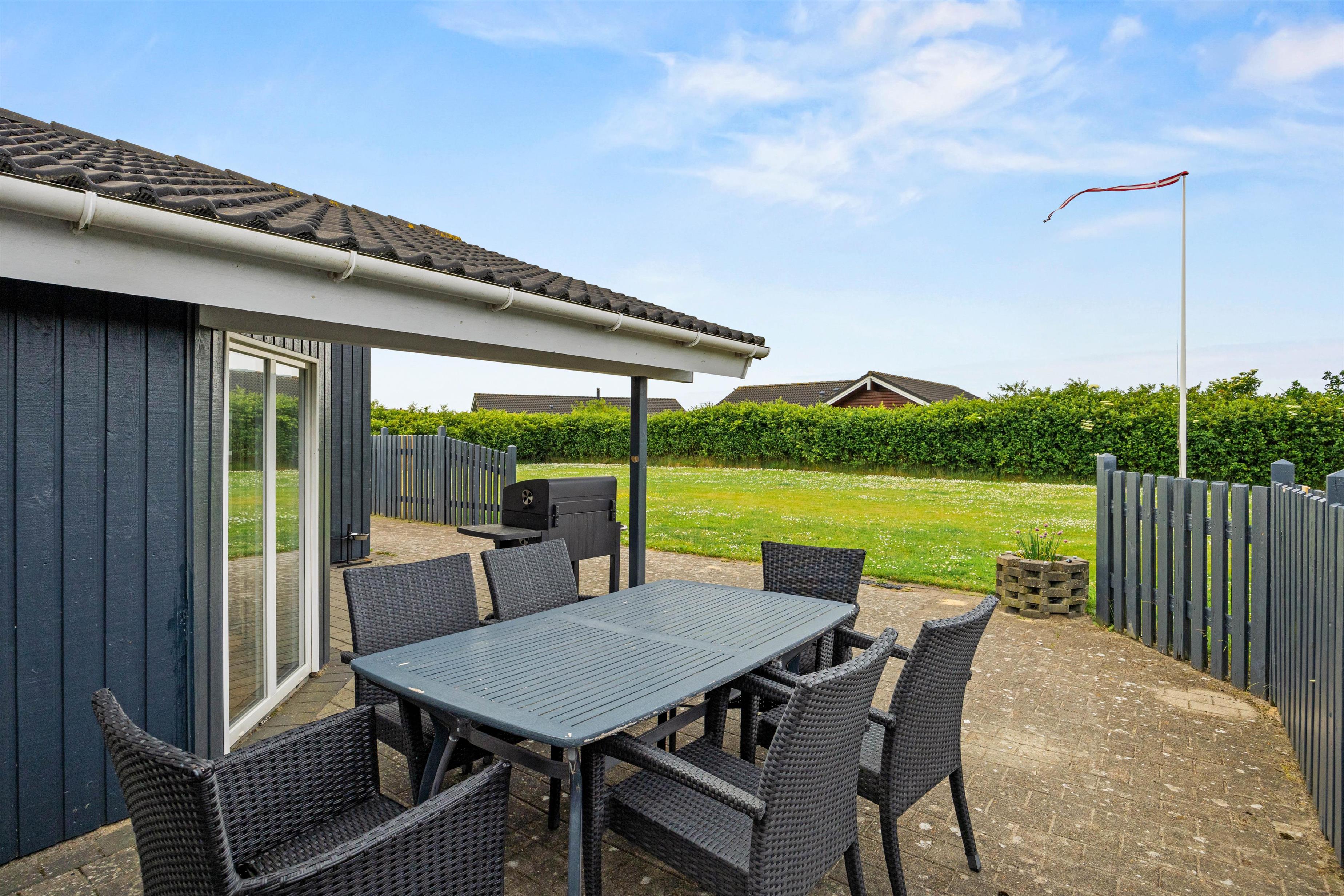 Ligegyldigt vejret er der god mulighed for udendørsopholdelse på sommerhusets alsidige terrasse, da I både finder en delvist overdækket og afskærmet terrasse, hvilke er oplagte steder at nyde et skønt måltid over grillen, mens dagens oplevelser synker ind. Terrassen er altså idéel til både afslapning under solen eller hyggelige grillaftener, hvor du kan nyde dejlige middage med familie og venner.