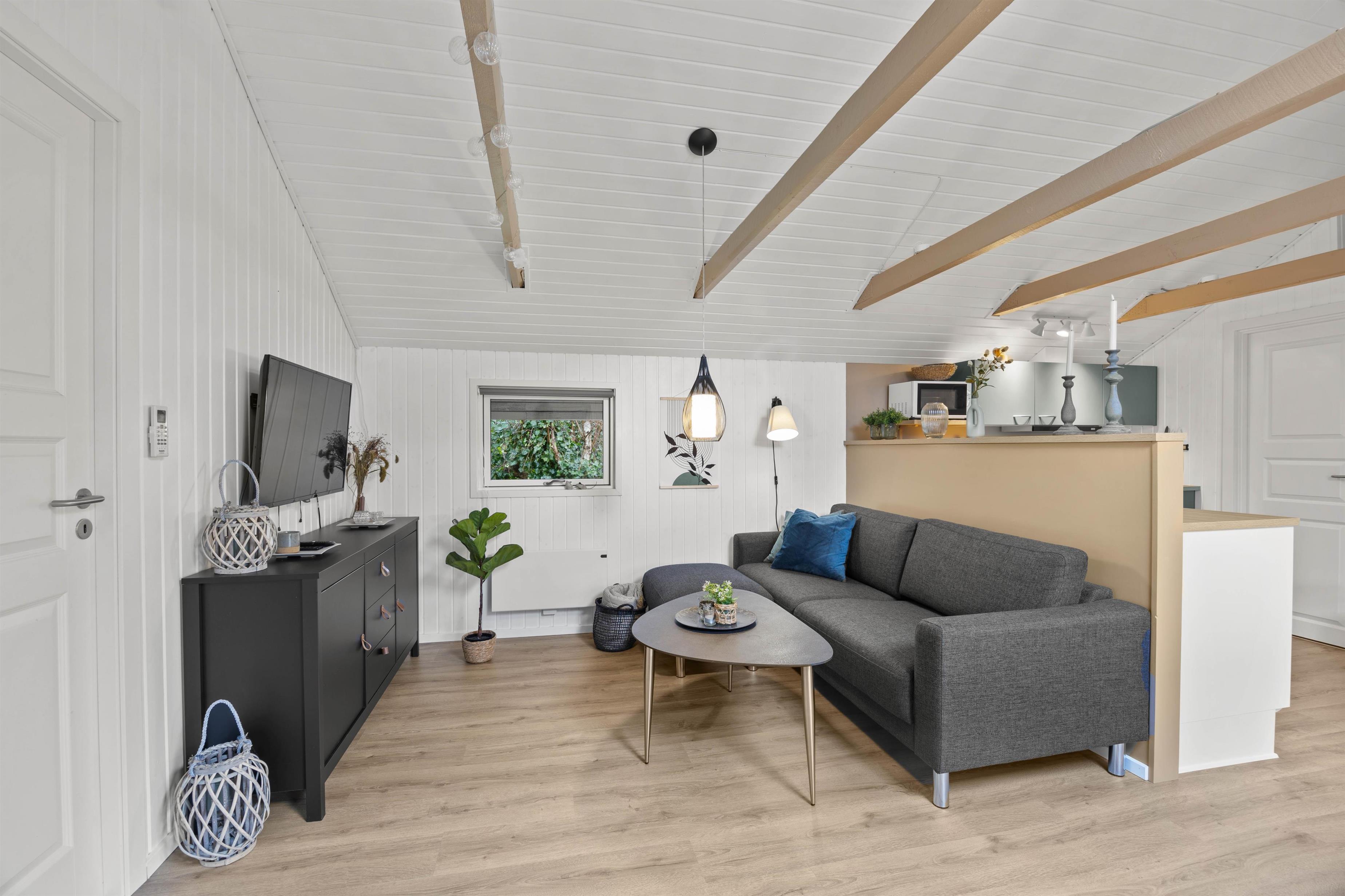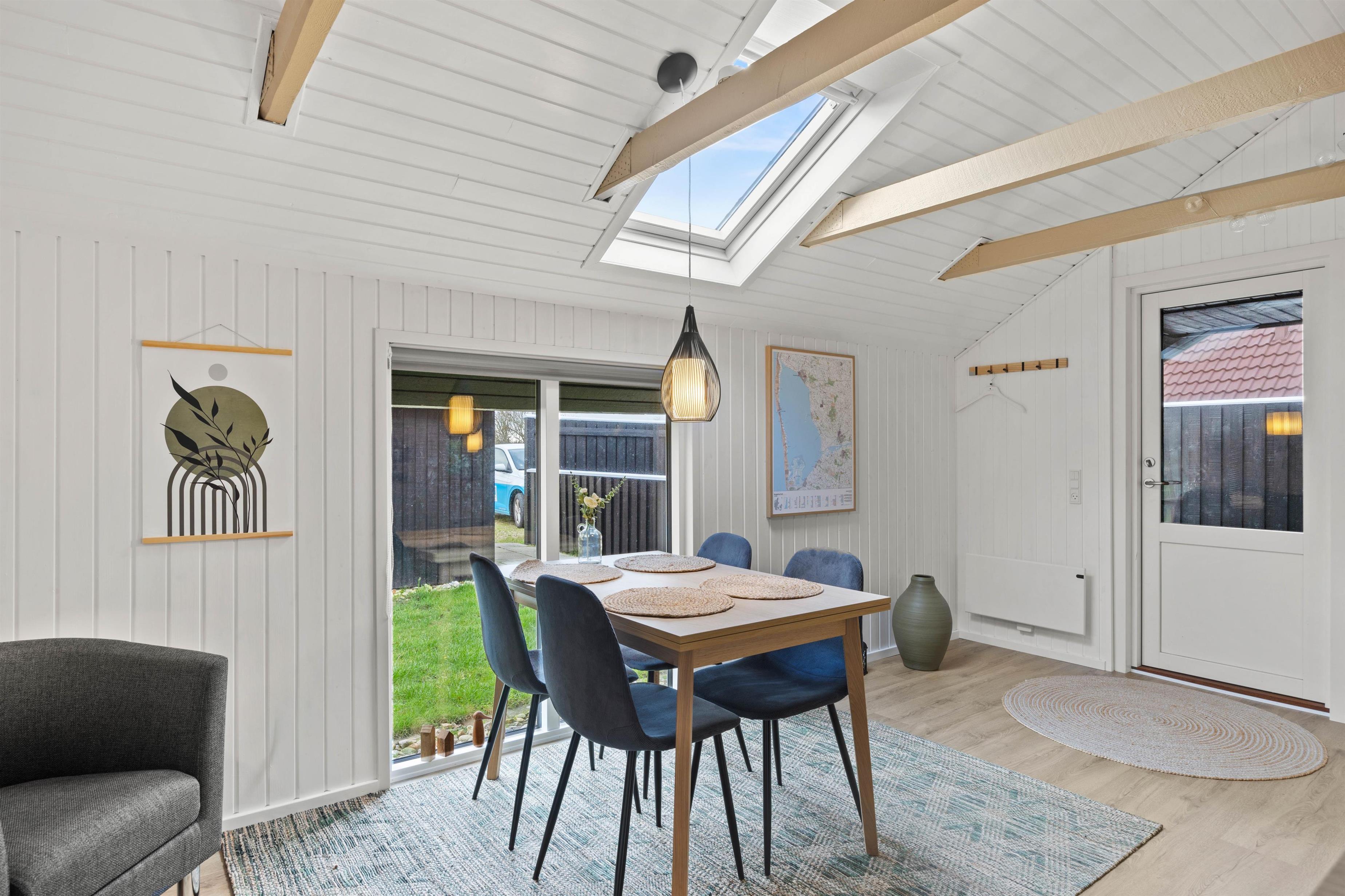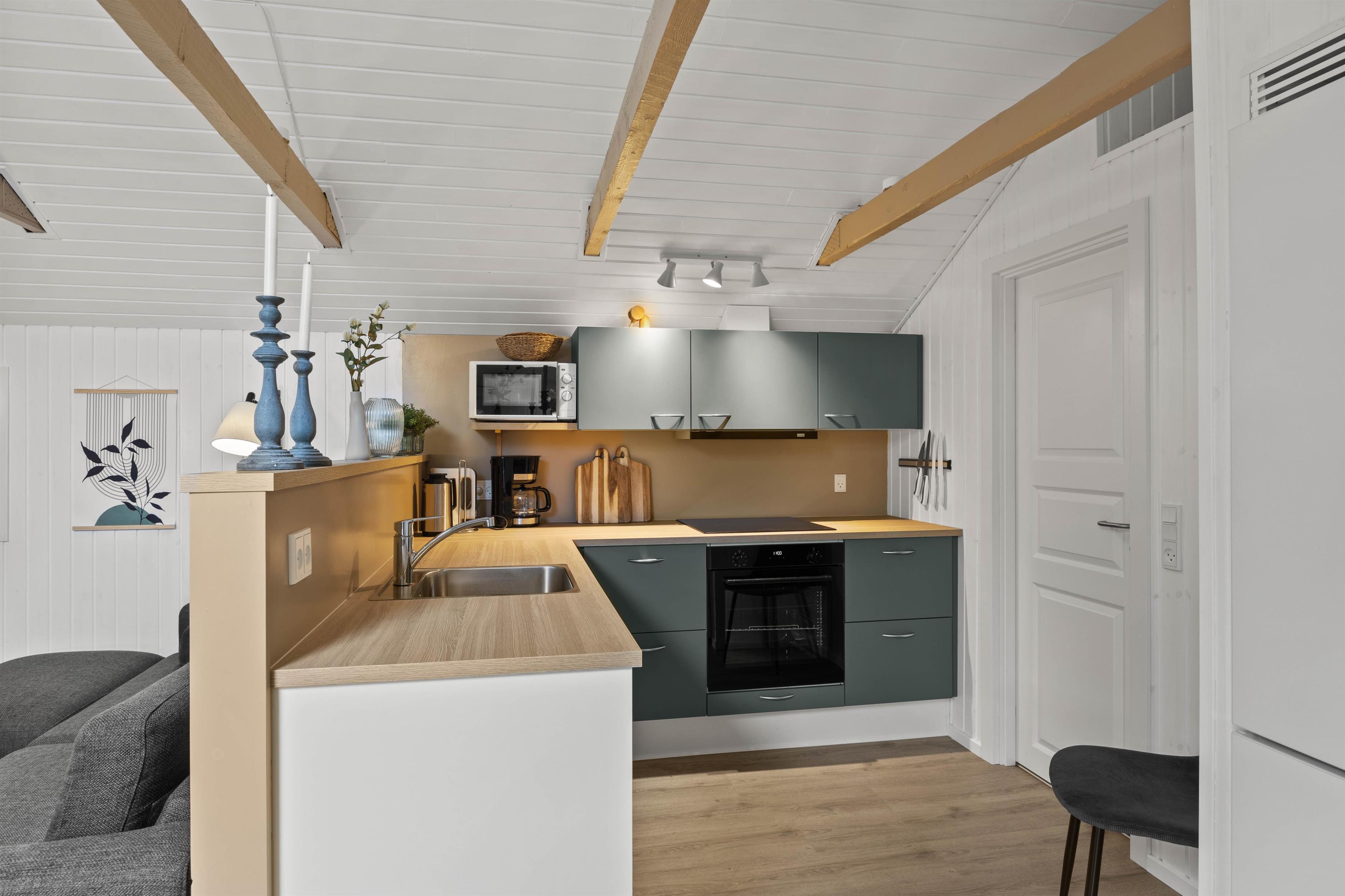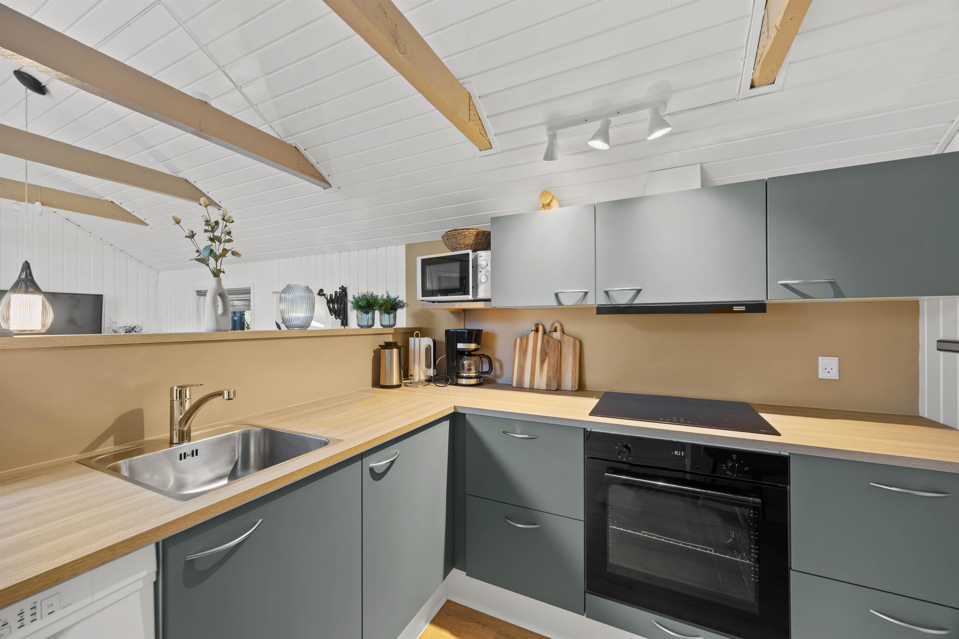 Når I træder ind i sommerhuset, omfavnes I af varmen fra det hyggelige køkkenalrum, der emmer af afslappet feriestemning efter en lang dag i det fri. Køkkenet er designet til samvær og er fuldt udstyret med både opvaskemaskine og vaskemaskine, hvilket gør daglige opgaver nemme og øger komforten under jeres ophold.