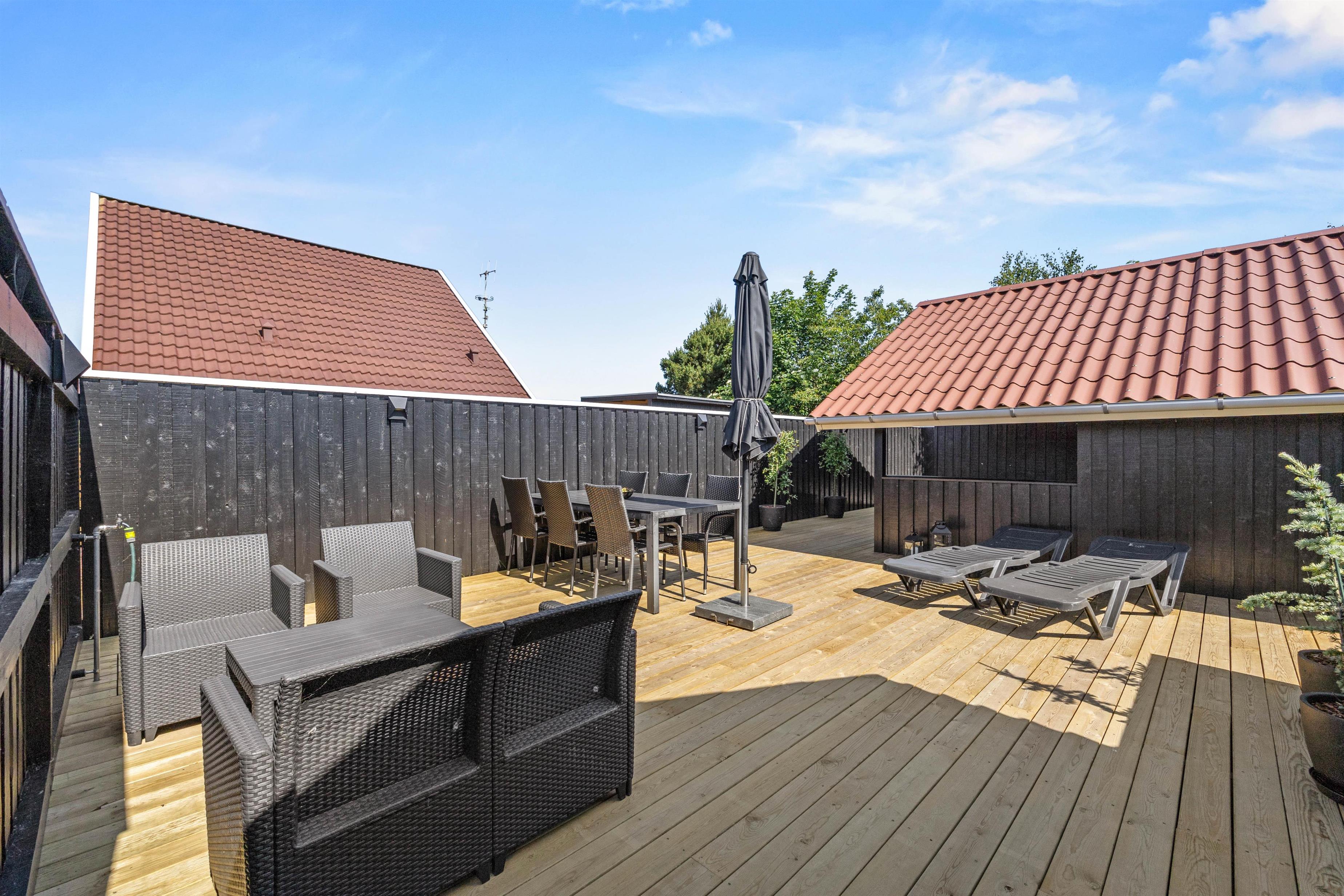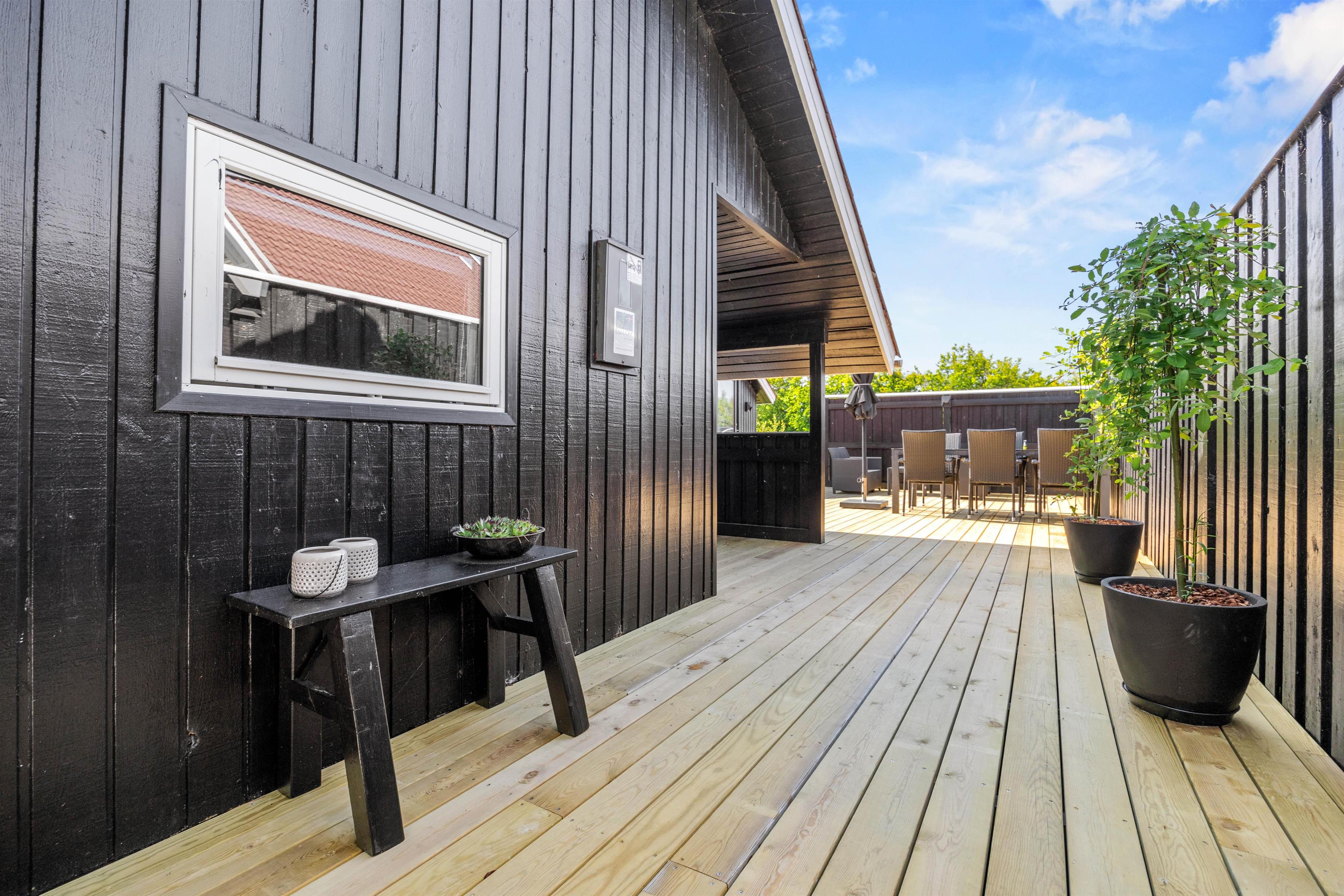 Udenfor kan I glæde jer over den rummelige, indhegnede grund på 224 m2, der tilbyder både en åben og en afskærmet terrasse. Disse områder er perfekte til både afslapning og socialt samvær, uanset om solen skinner, eller skyerne trækker ind.