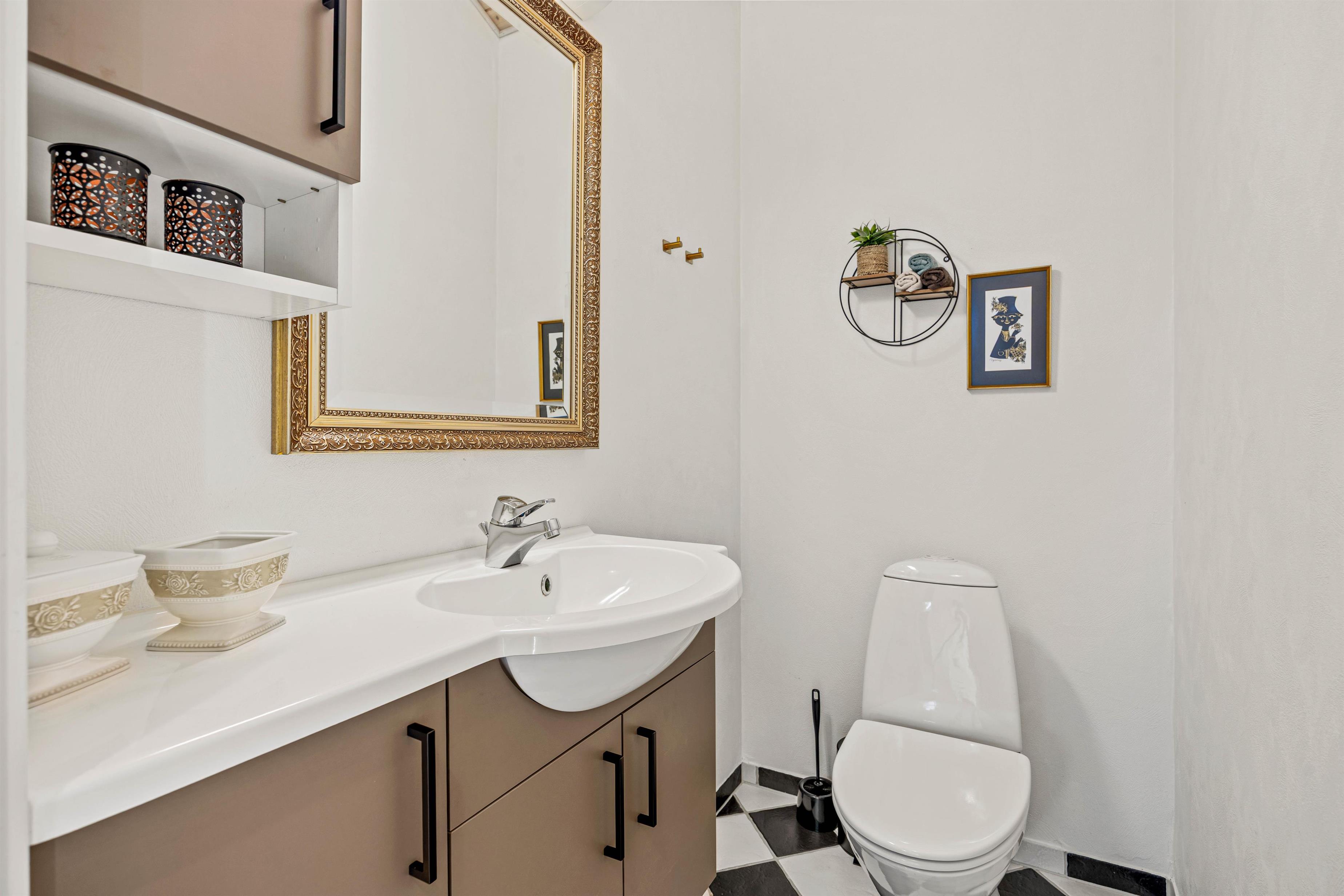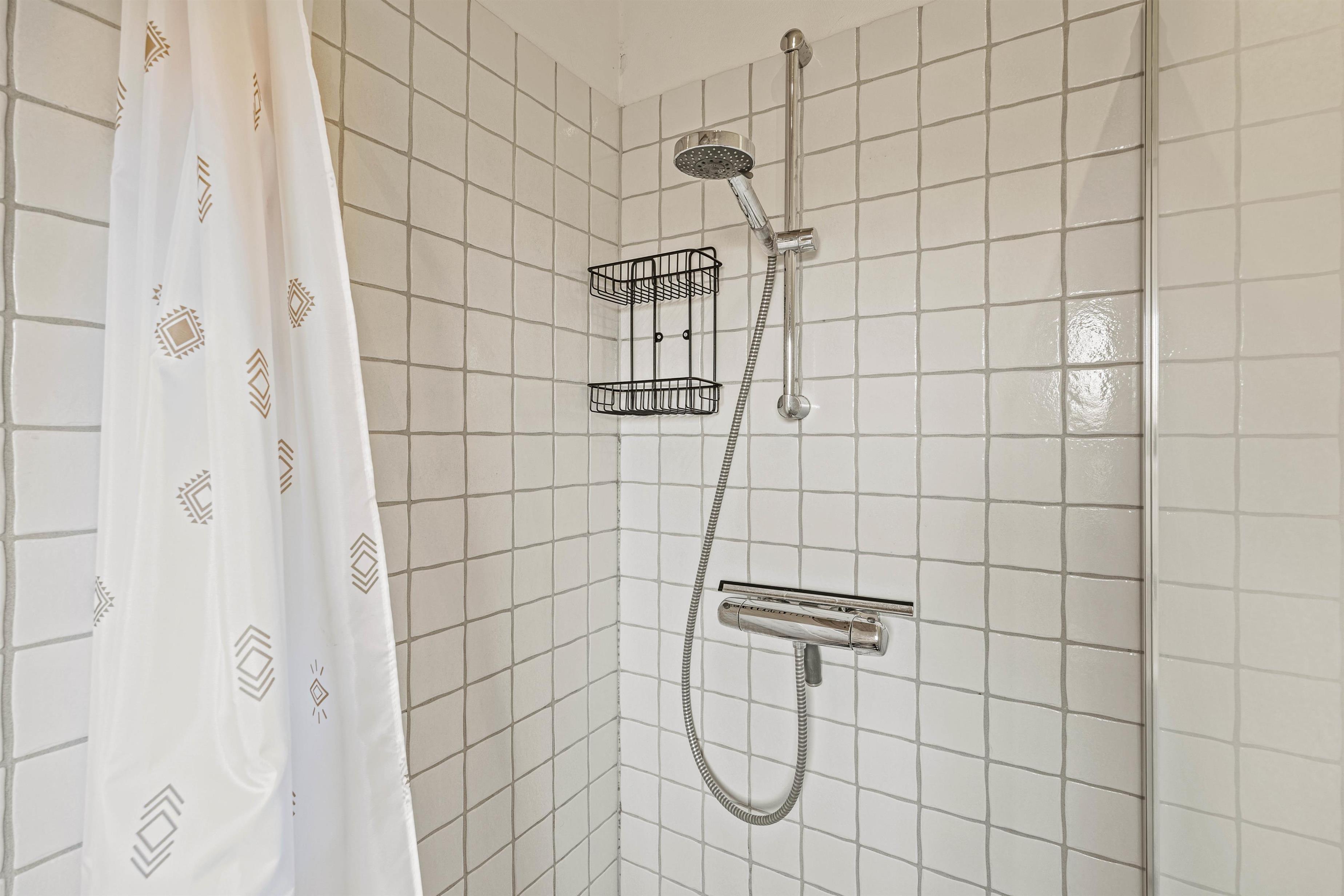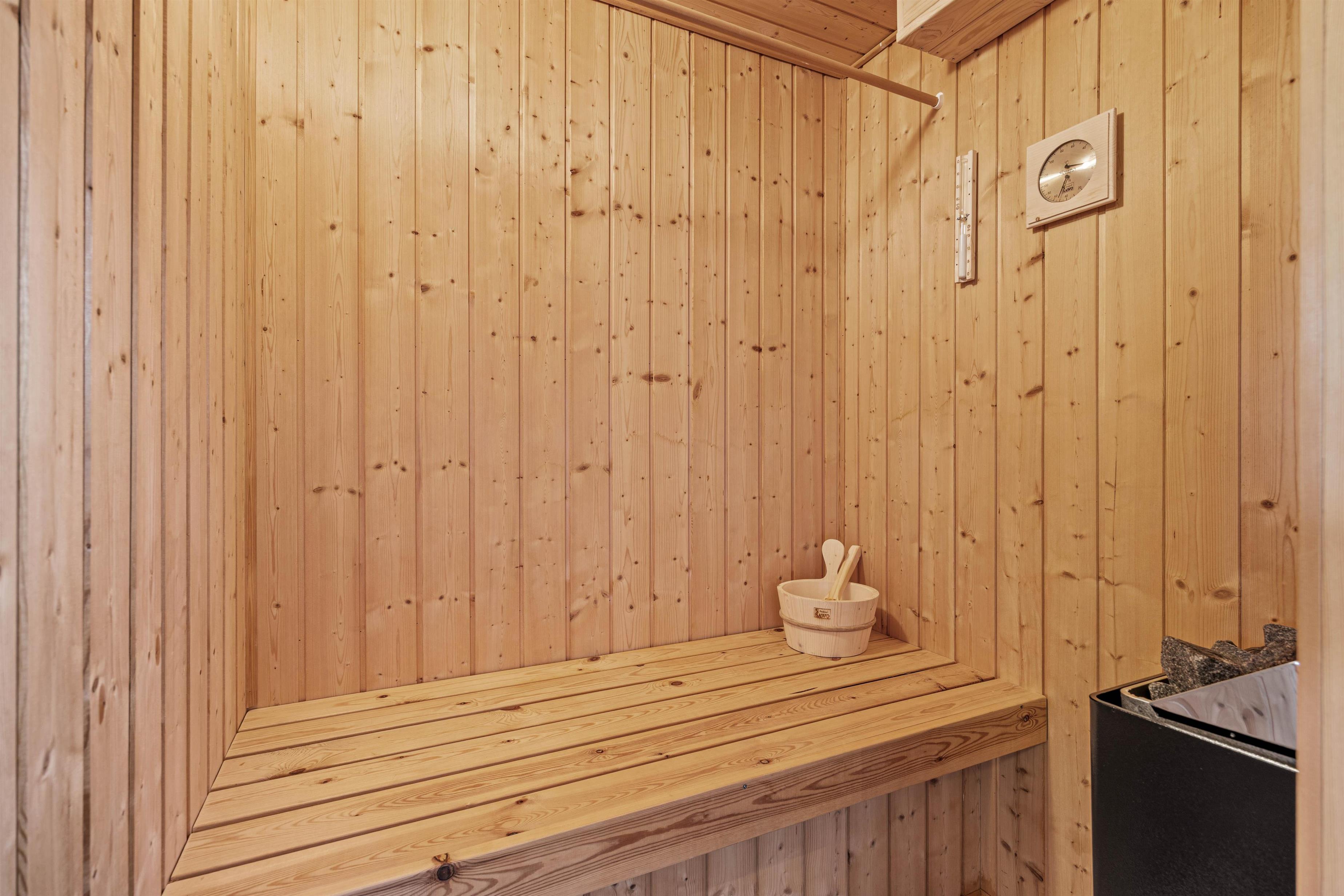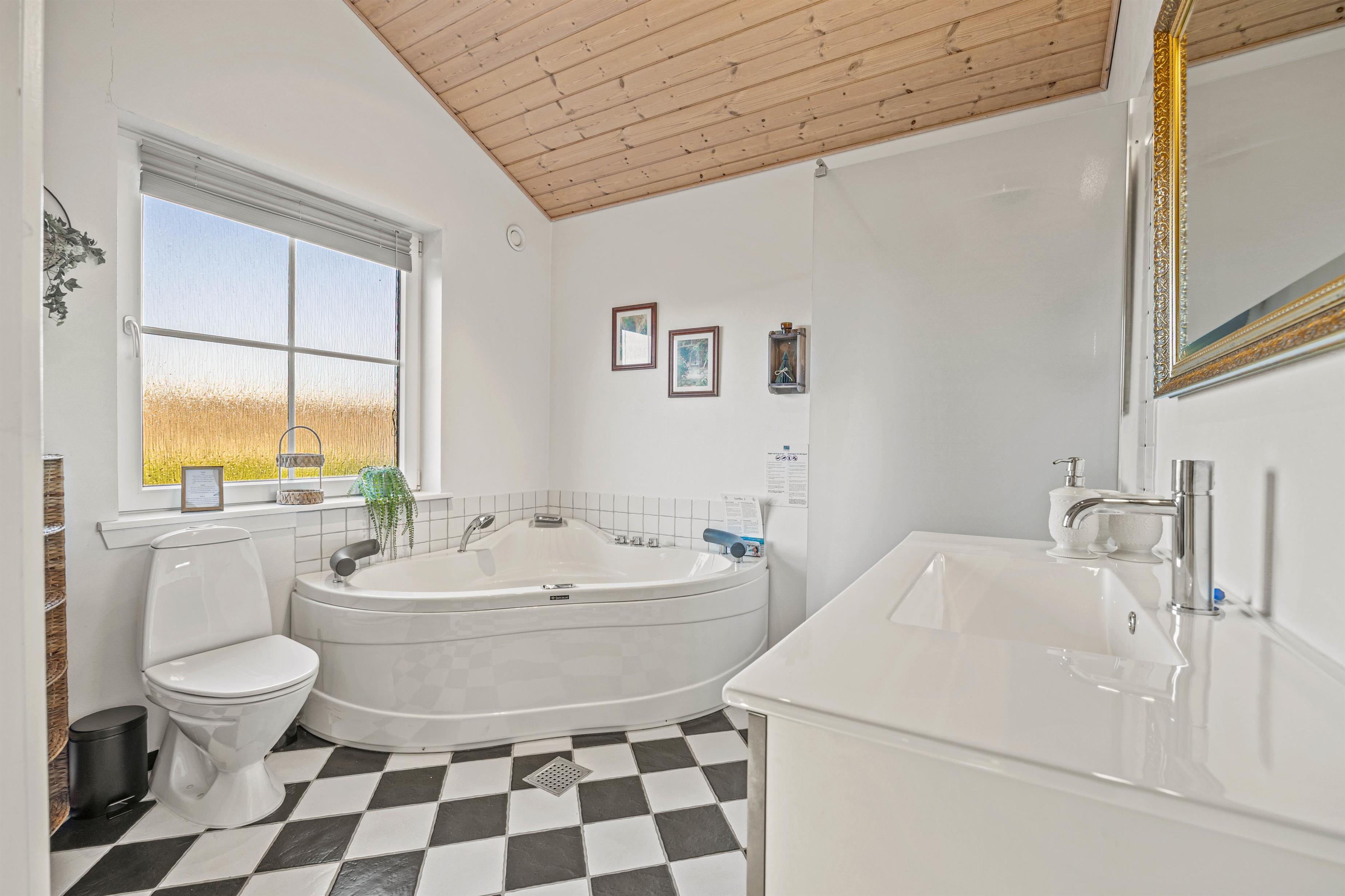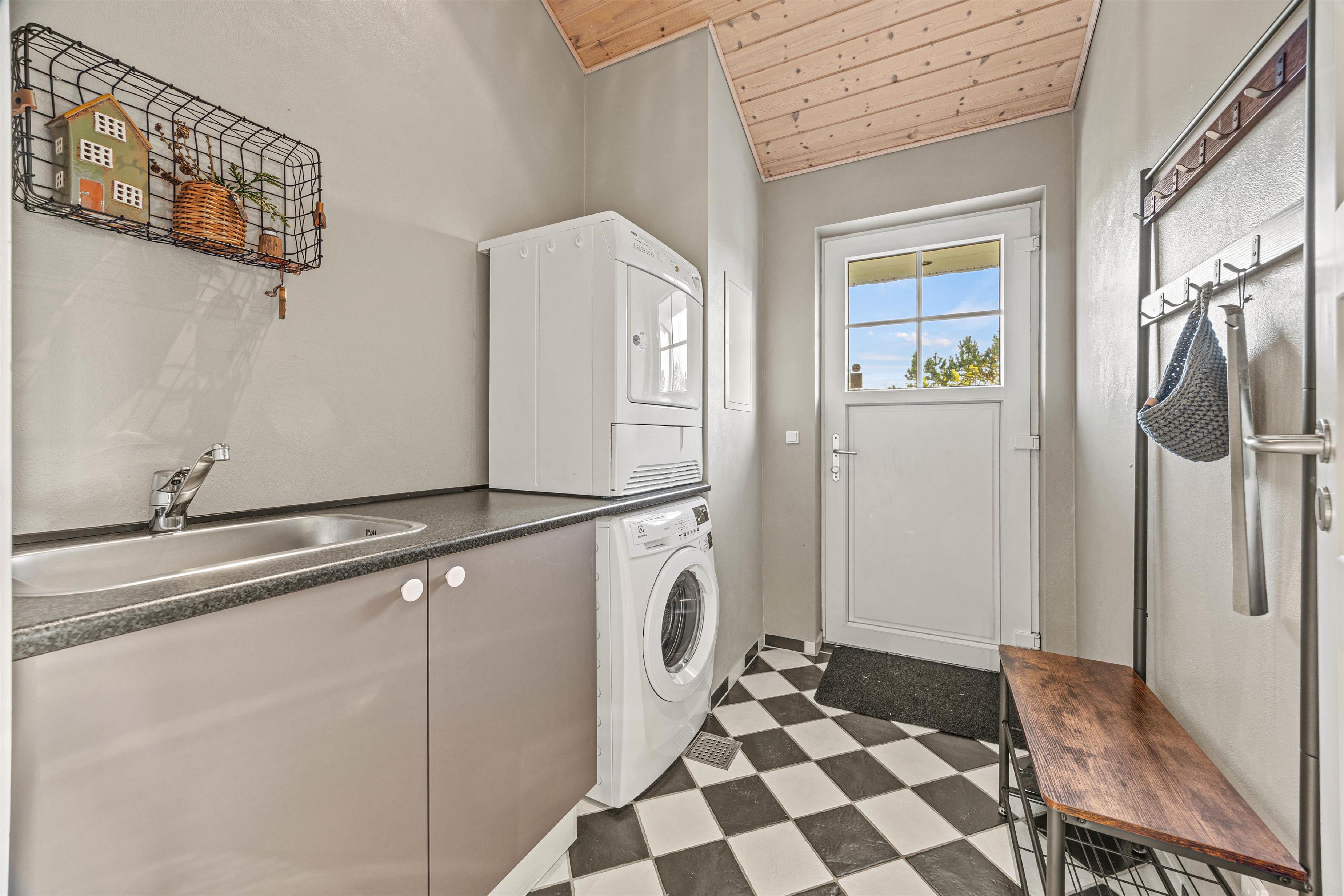 I sommerhuset kan i nyde en stund i tømmespa'en, med efterfølgende afslapning i saunaen. Det velindrettede badeværelse har gulvvarme, hvilket giver ekstra komfort, især på kolde dage. Ydermere findes der et gæstetoilet, hvilket gør sommerhuset ideelt til at modtage besøg. Vaskemaskine og tørretumbler er placeret i entreen, hvilket gør det nemt at holde styr på tøjvasken under ferien.