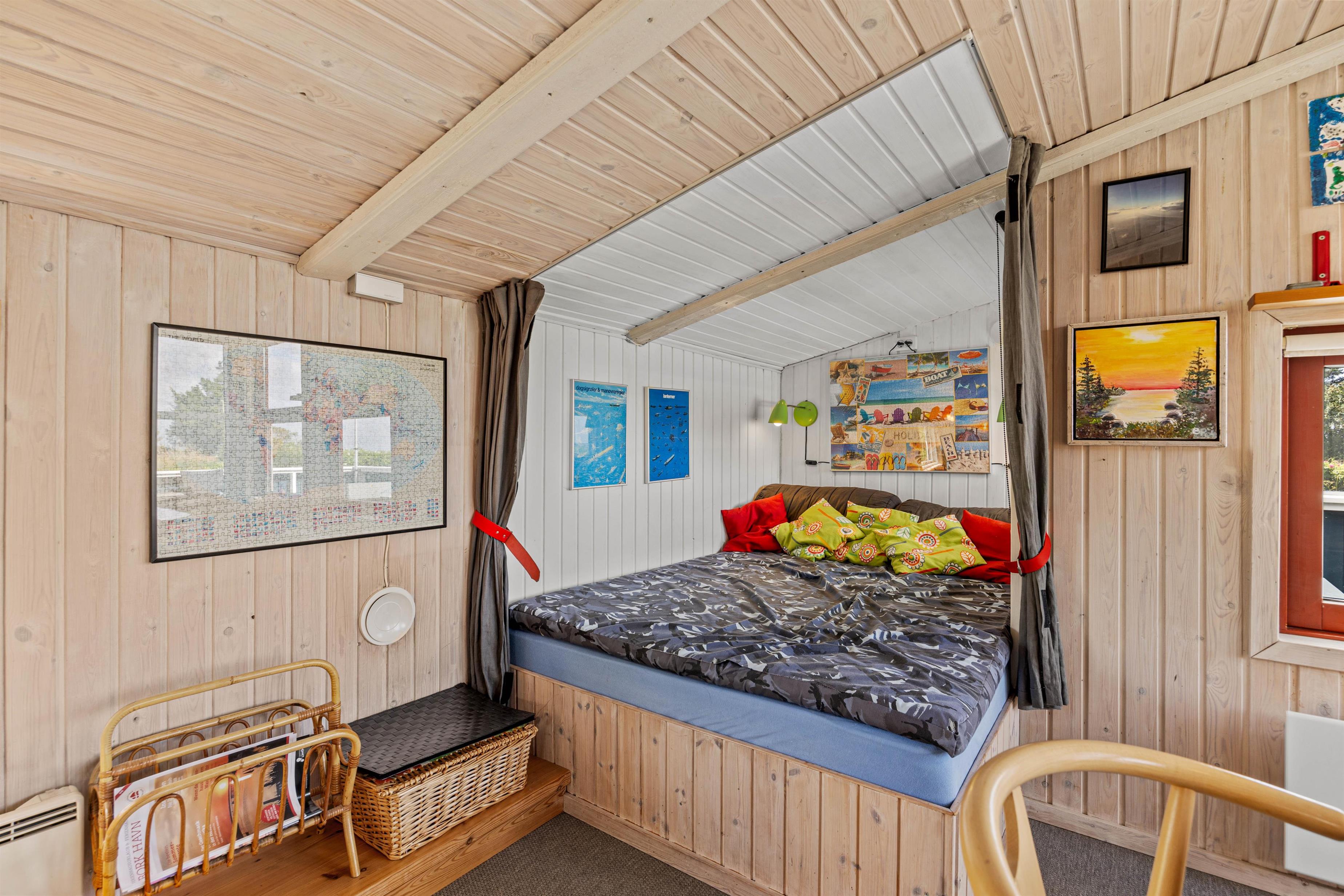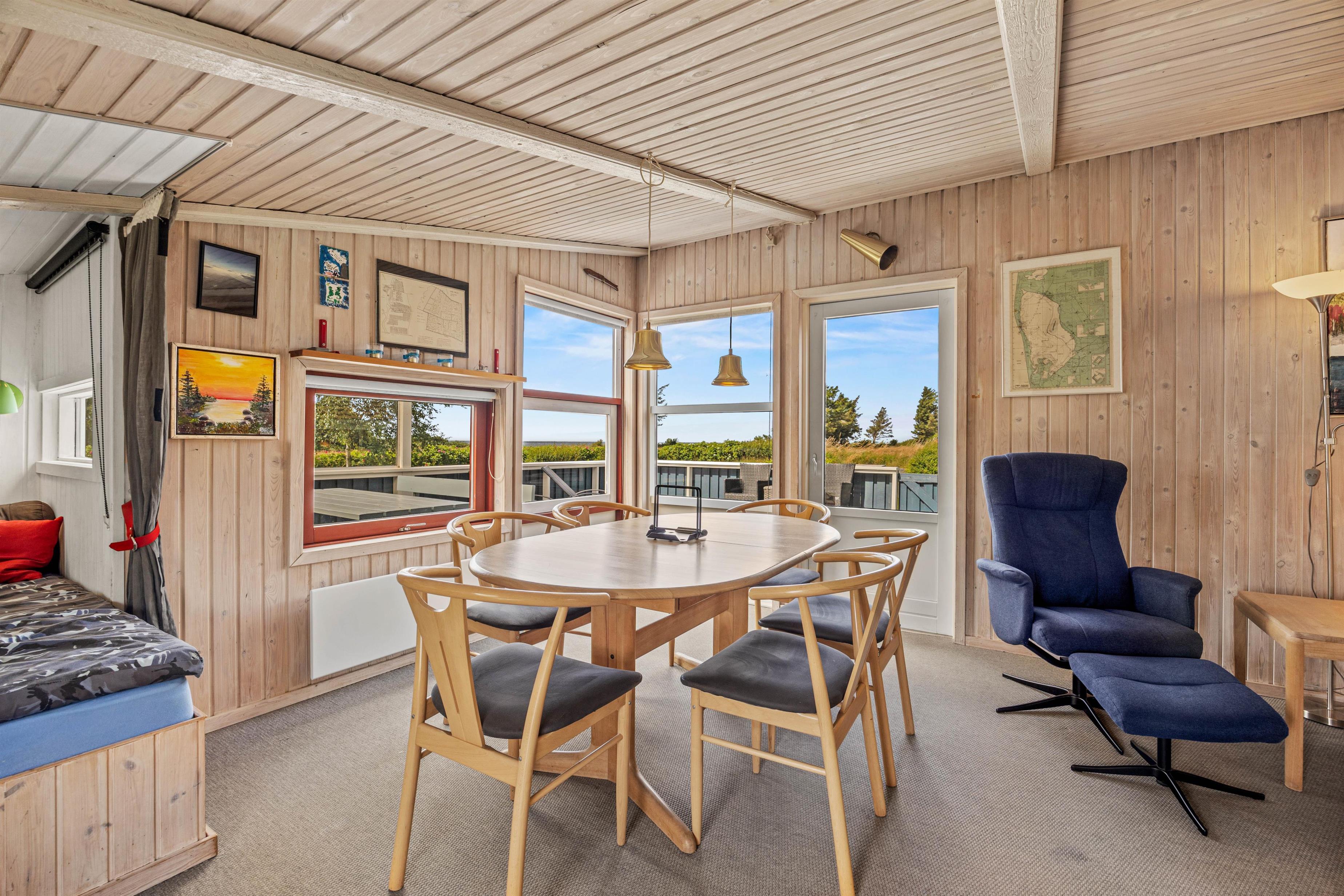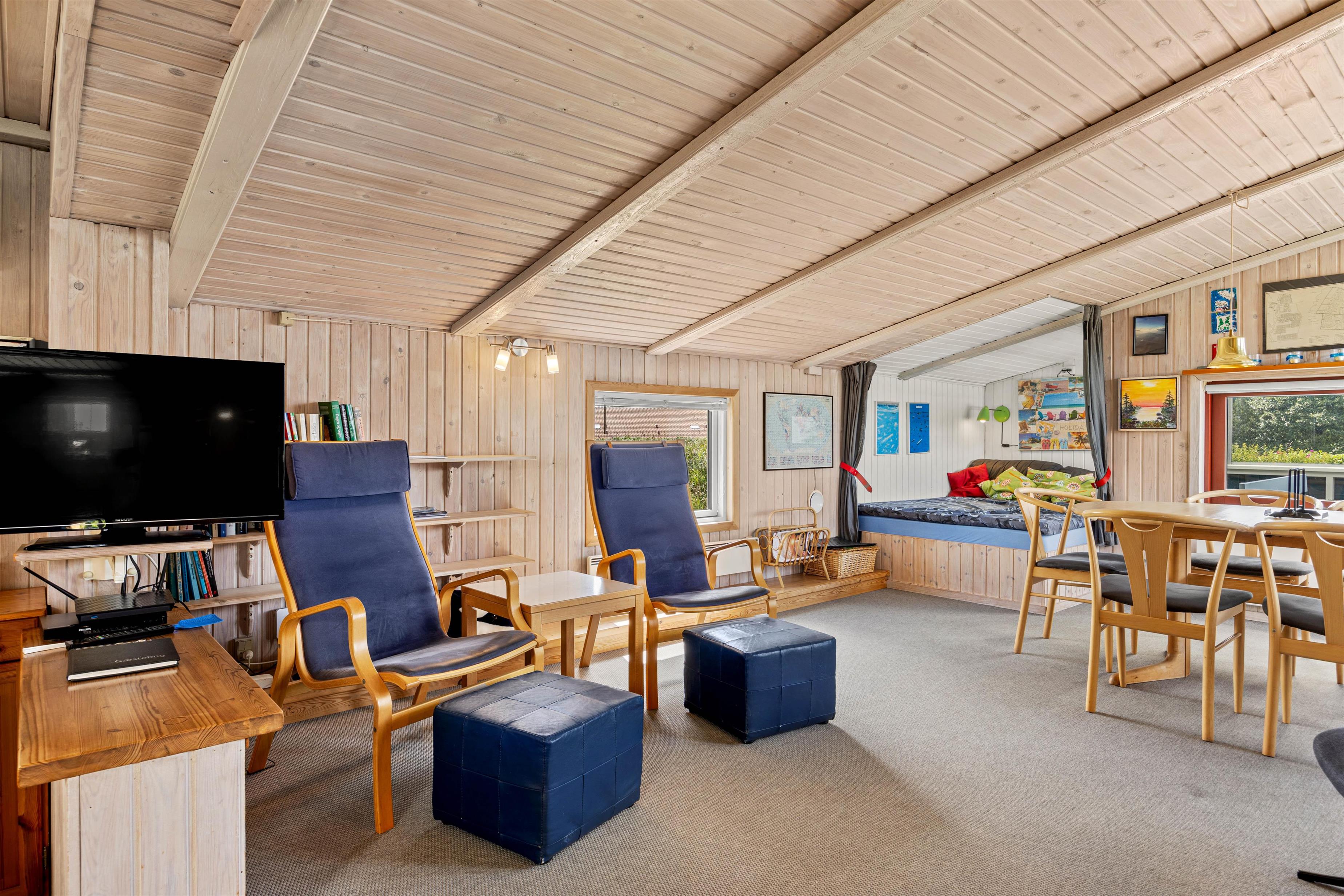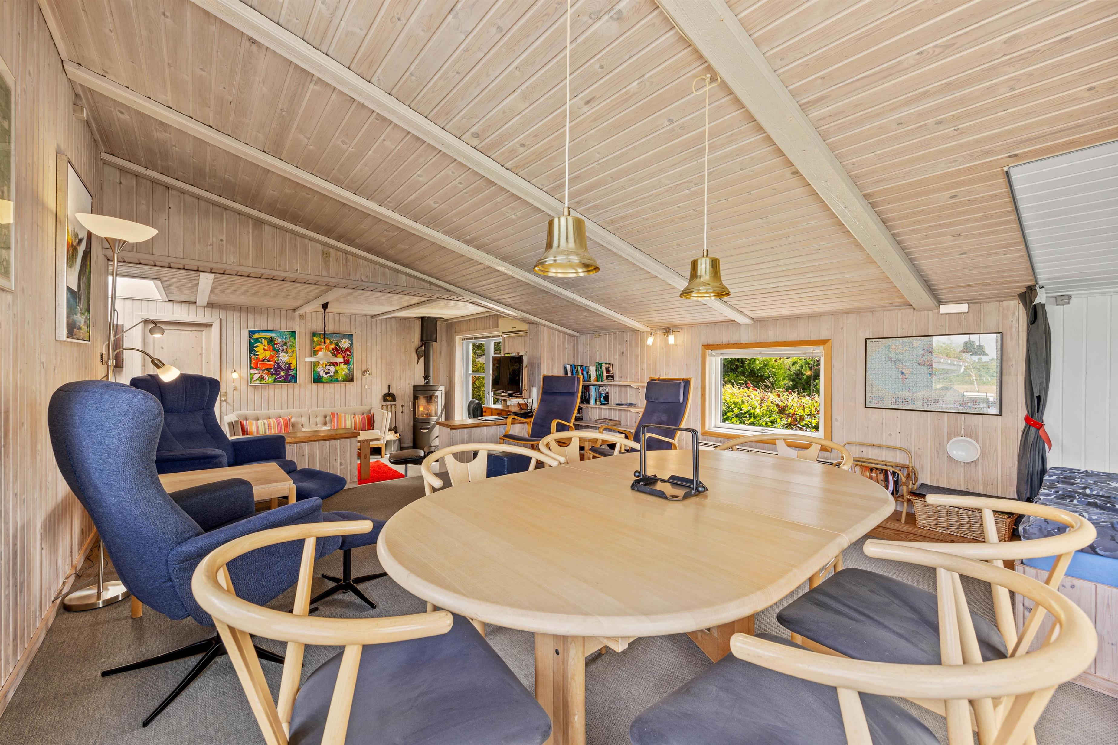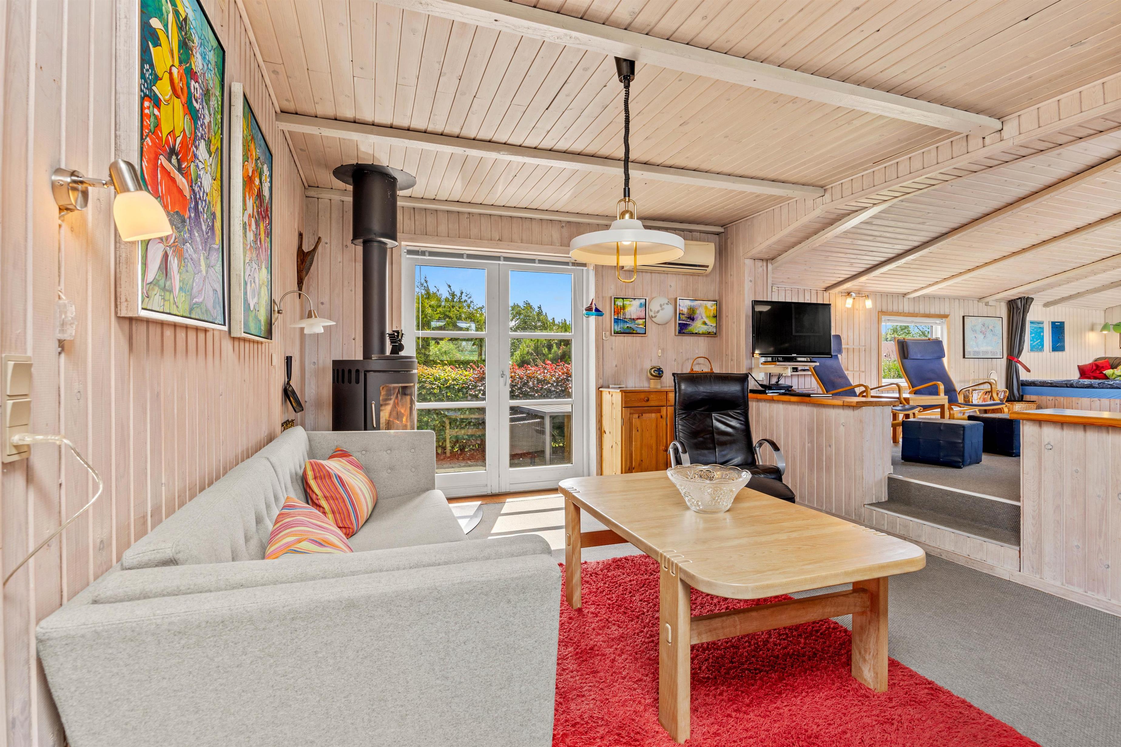 Indendørs er sommerhuset indrettet med fokus på hygge og komfort. Den hyggelige opholdsstue er udstyret med en brændeovn og en energibesparende varmepumpe, der sikrer behagelig varme hele året rundt. Her kan I slappe af foran tv'et eller læse en god bog i sofaen.
