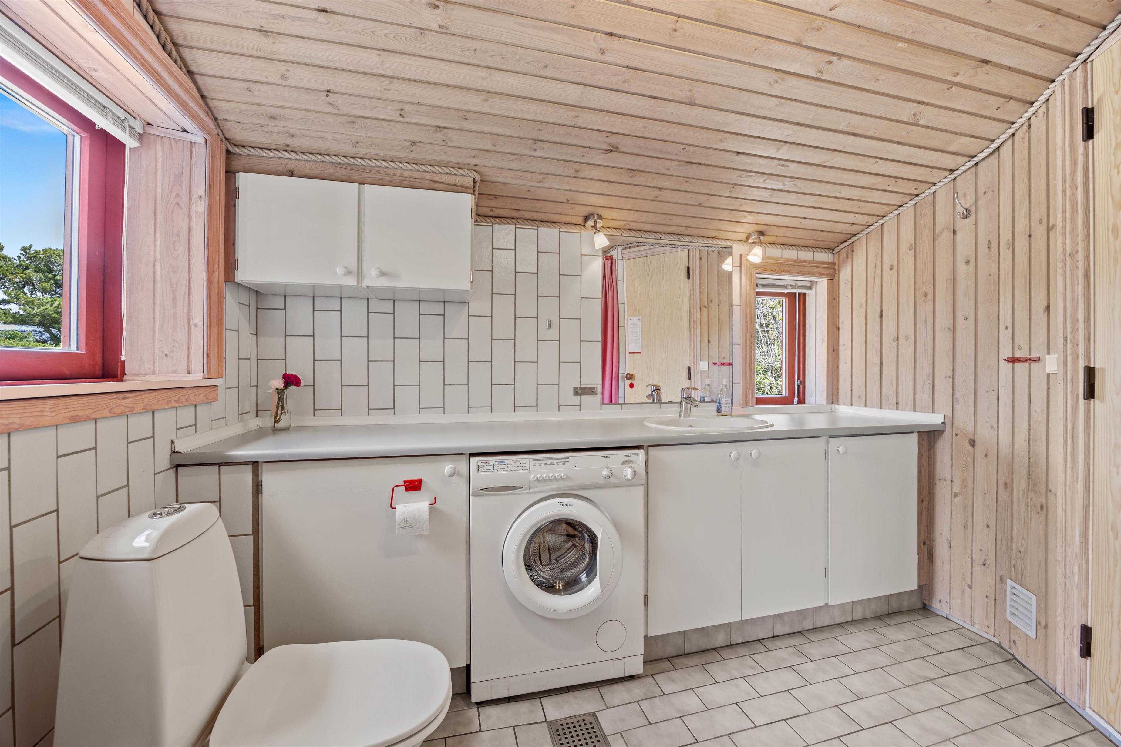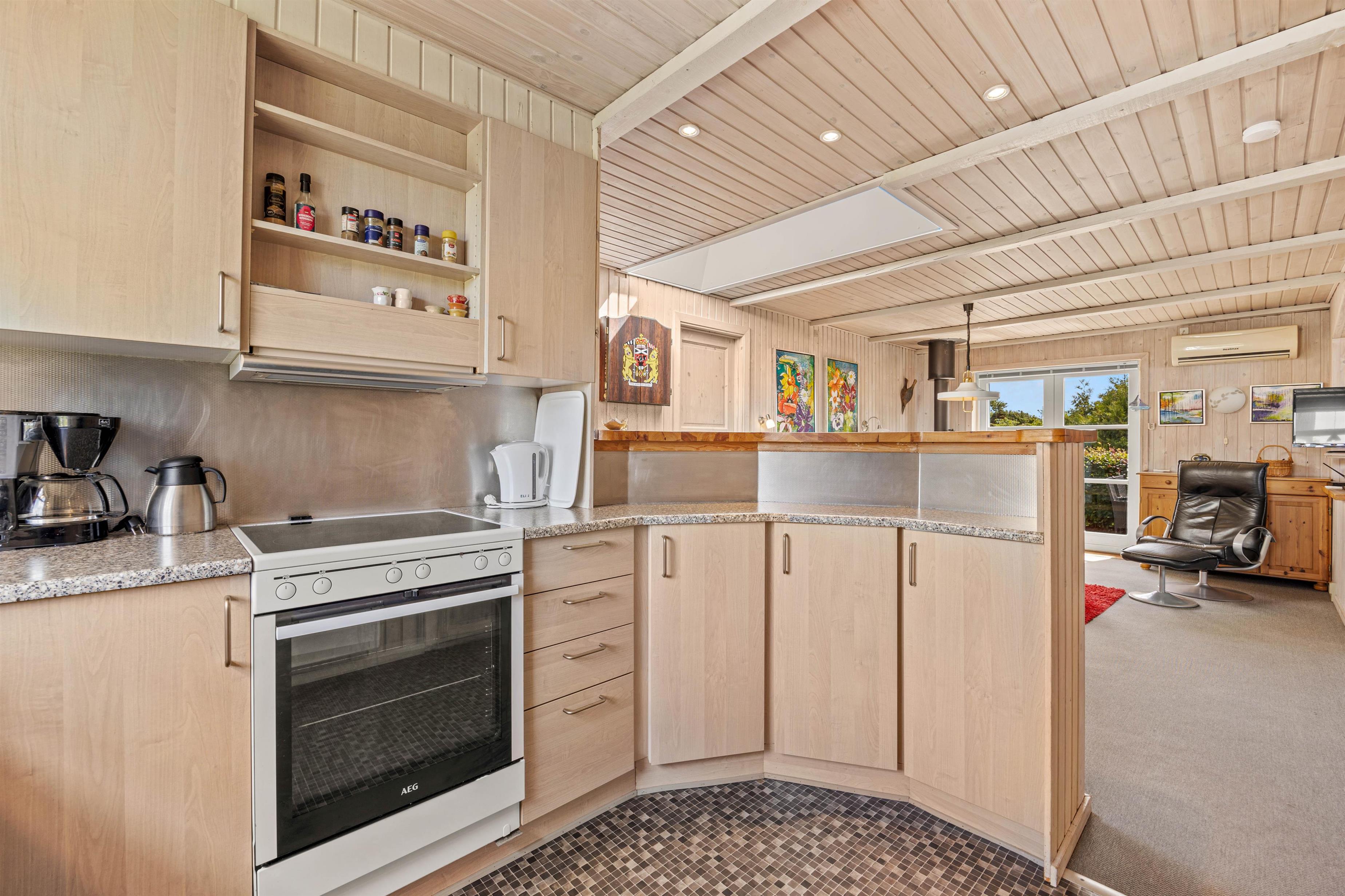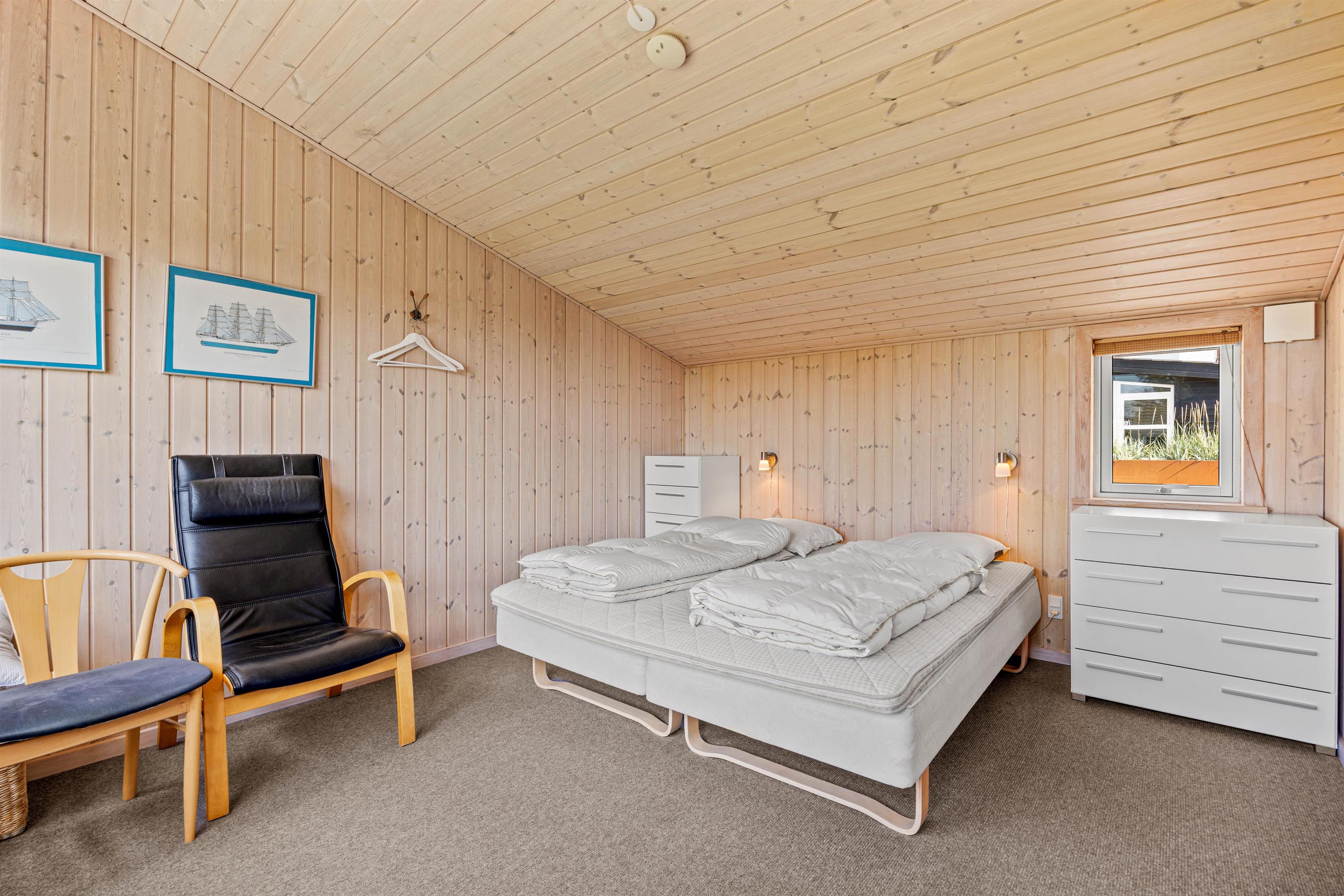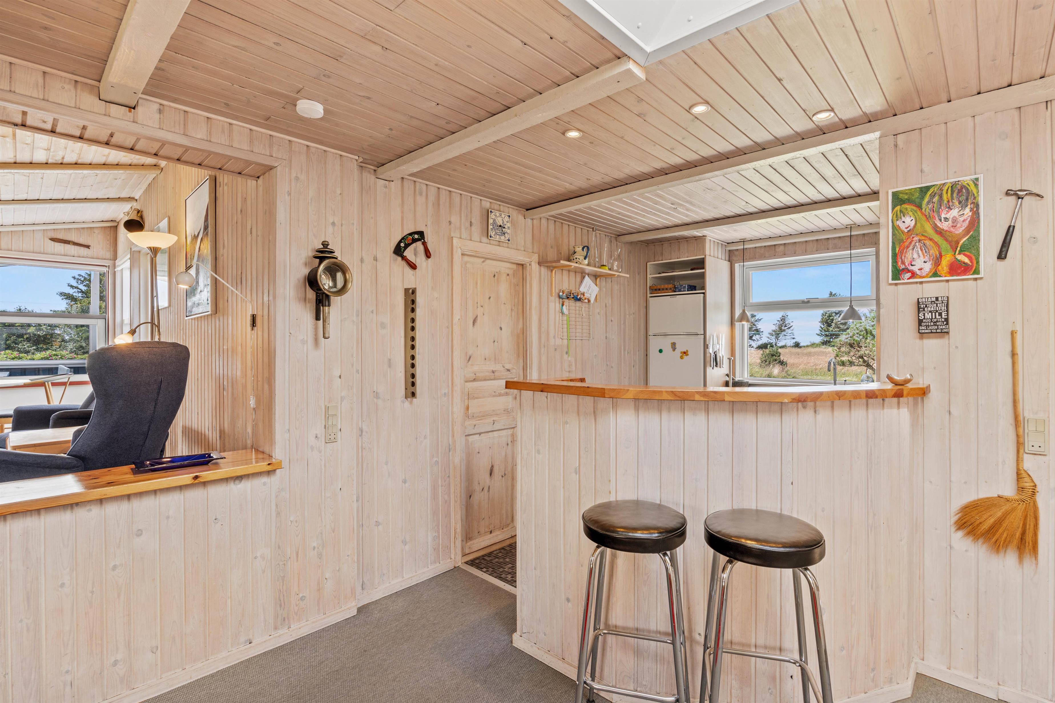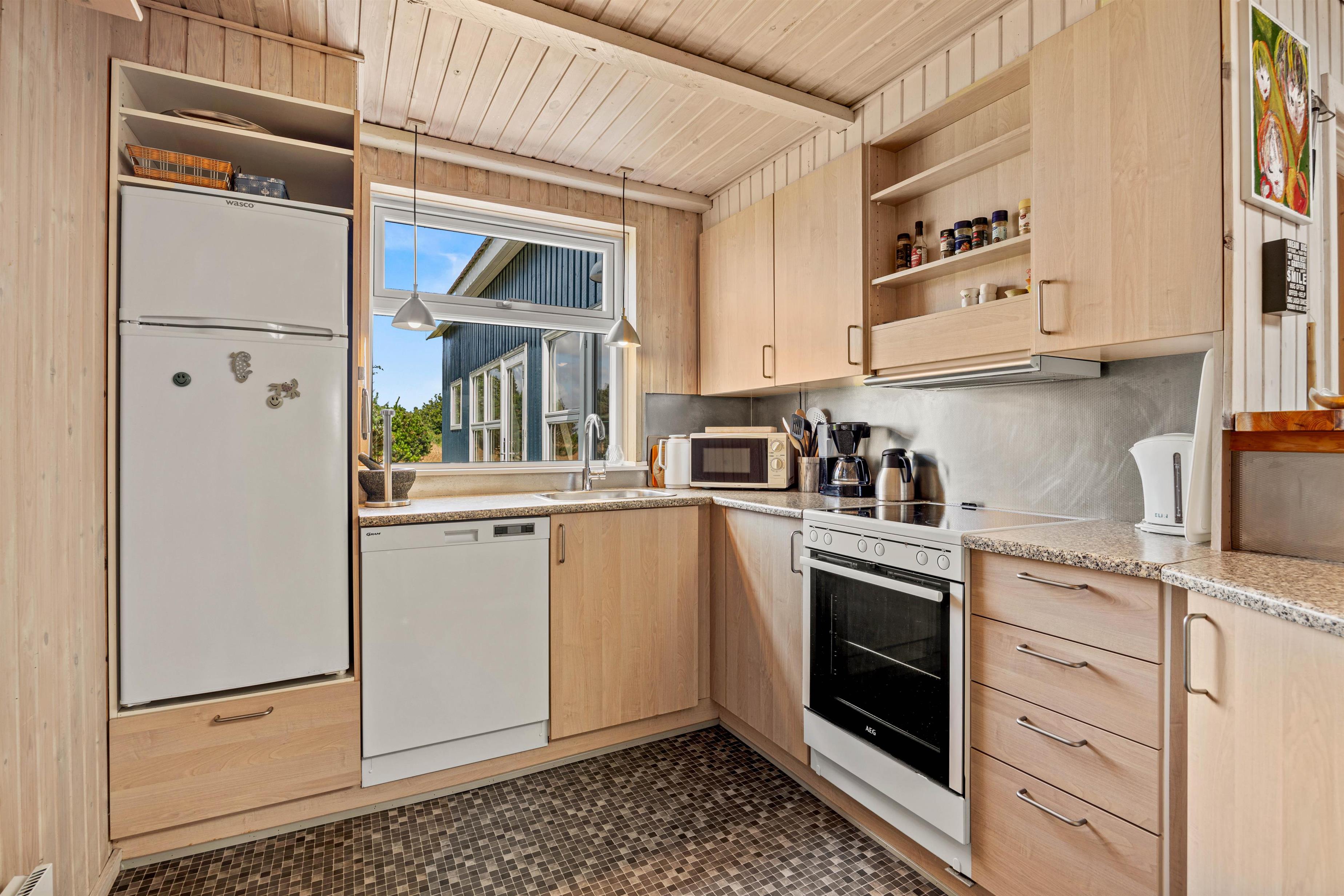 Den åbne køkkenløsning er bl.a. udstyret med en opvaskemaskine, et køleskab med fryser og en mikrobølgeovn, ideel til fælles madlavning og sjov i ferien. Badeværelset tilbyder god plads med gulvvarme og sauna, så I rigtig kan blive varmet igennem, mens vaskemaskinen giver ekstra komfort. Der er god plads i soveværelserne, da der er 1 soveværelse med dobbeltseng og 2 yderligere soveværelser, med hver især 2 enkeltsenge.