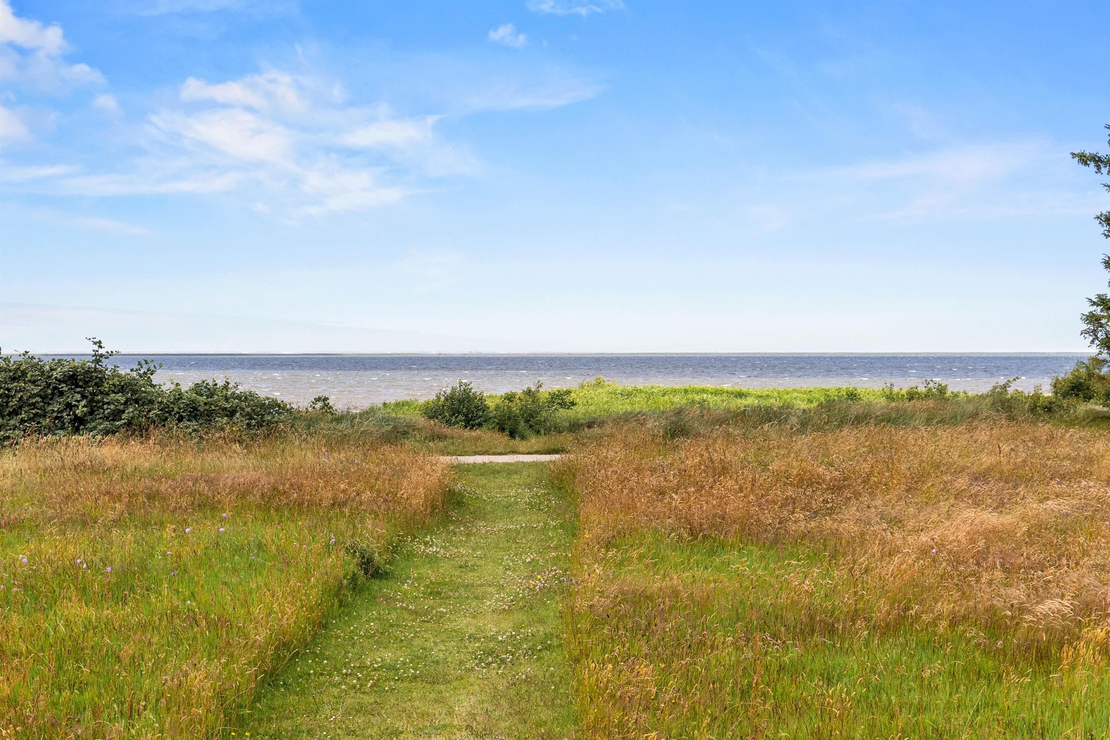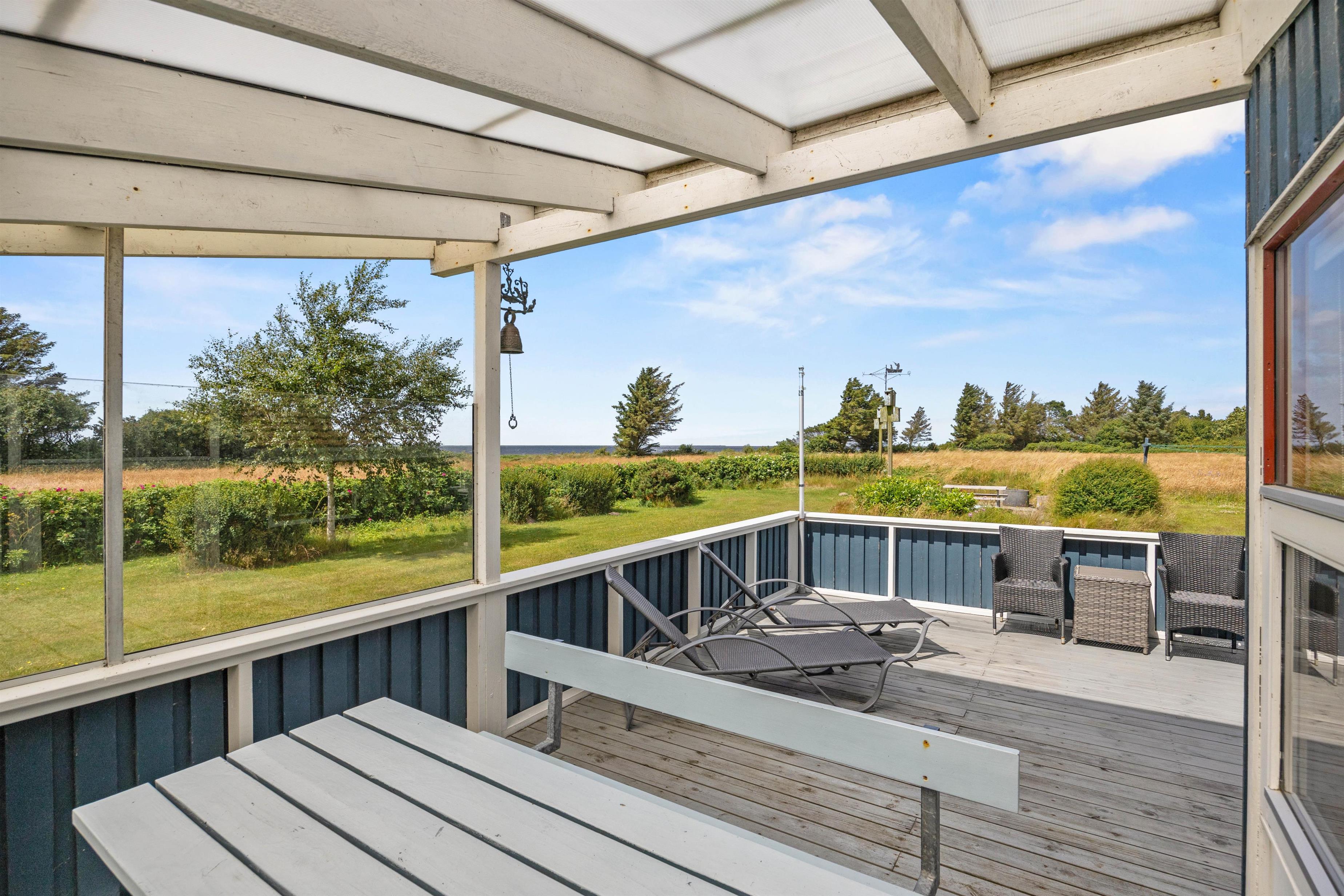 På den 1160 kvadratmeter store plænegrund er der rigeligt med plads til afslapning. Takket være beliggenheden i udkanten af sommerhusområdet, får I en fantastisk panoramaudsigt over fjorden. Den vestvendte træterrasse byder både på et overdækket og et åbent område, så I altid kan finde et sted i solen eller skyggen – alt efter vejret og humøret.