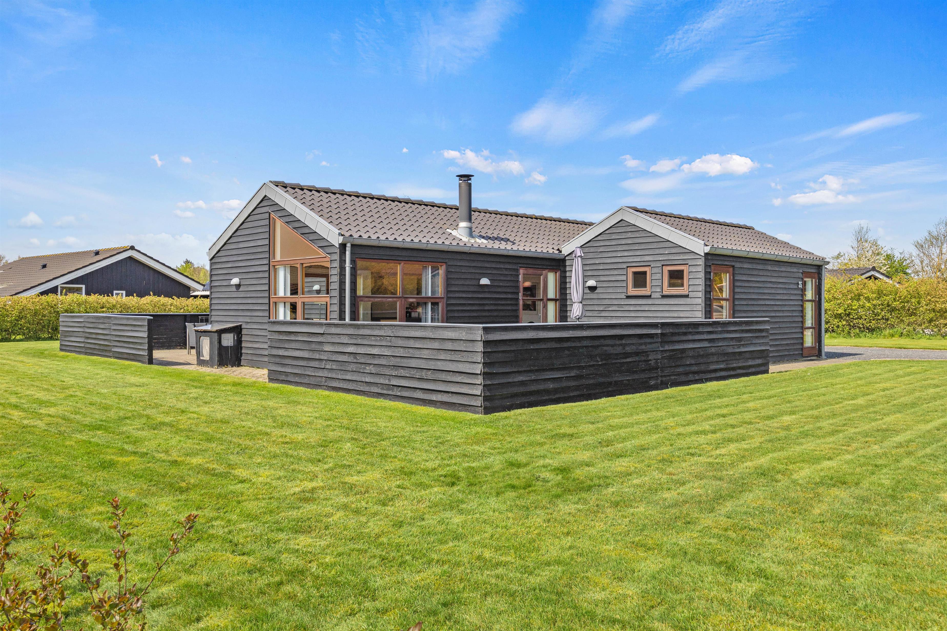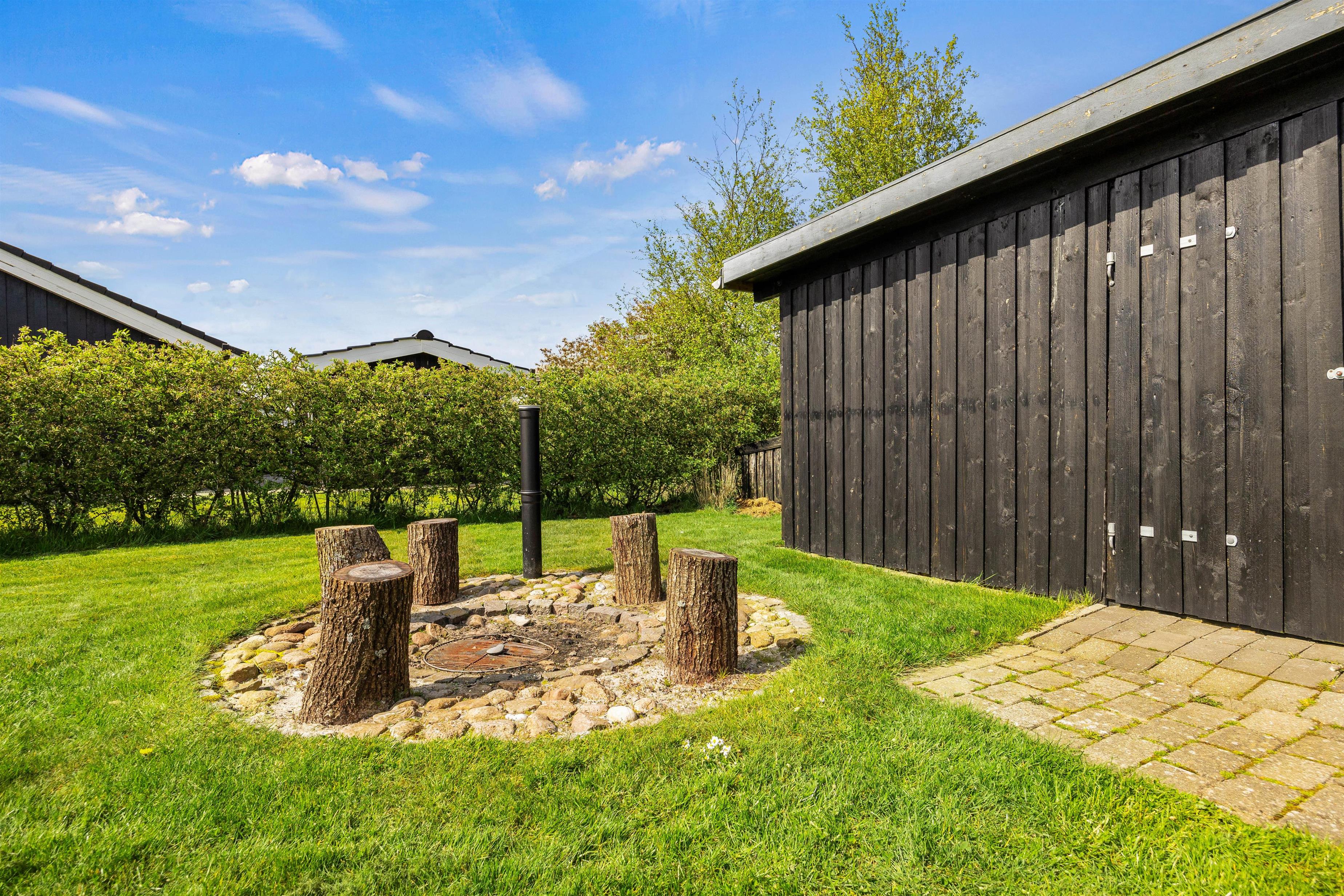 Fra begge sider af stuen har I direkte adgang ud til sommerhusets store terrasse, hvor I kan sidde afskærmet og nyde jeres feriedage. Her står havemøbler, parasol og solvogne klar til jer. Både bålstedet og grillen giver gode muligheder for at tilberede skønne middage og til de mindste feriegæster er der en sandkasse på den 1200 kvadratmeter store plænegrund, hvor I naturligvis også kan spille bold eller andre havespil – til stor glæde for både voksne, børn og hunden.