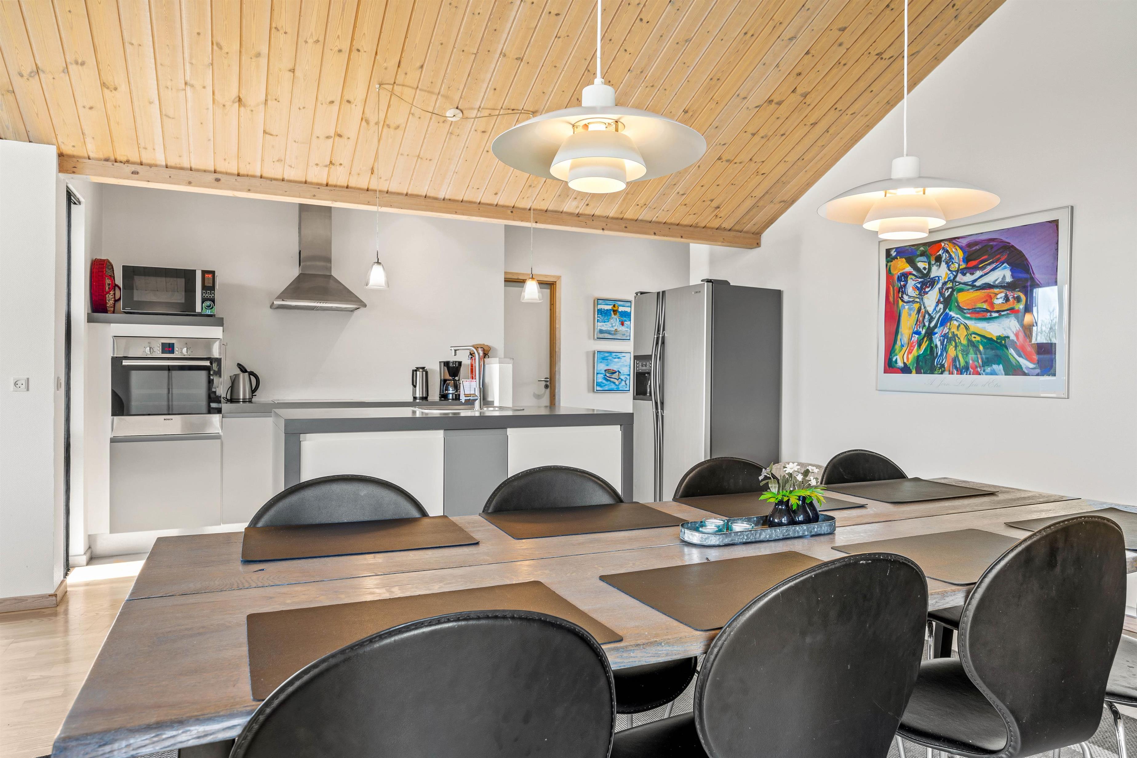 Opholdsrummet er sommerhusets hjerte, hvor køkkenet ligger i åben forbindelse med stue og spisestue. Her kan I alle nyde hinandens nærvær, mens I hver især har gang i forskellige aktiviteter, hvad end I er i køkkenet og laver lækre måltider, lægger ferieplaner ved spisebordet eller bare nyder livet med en god bog eller et kortspil i sofaen.