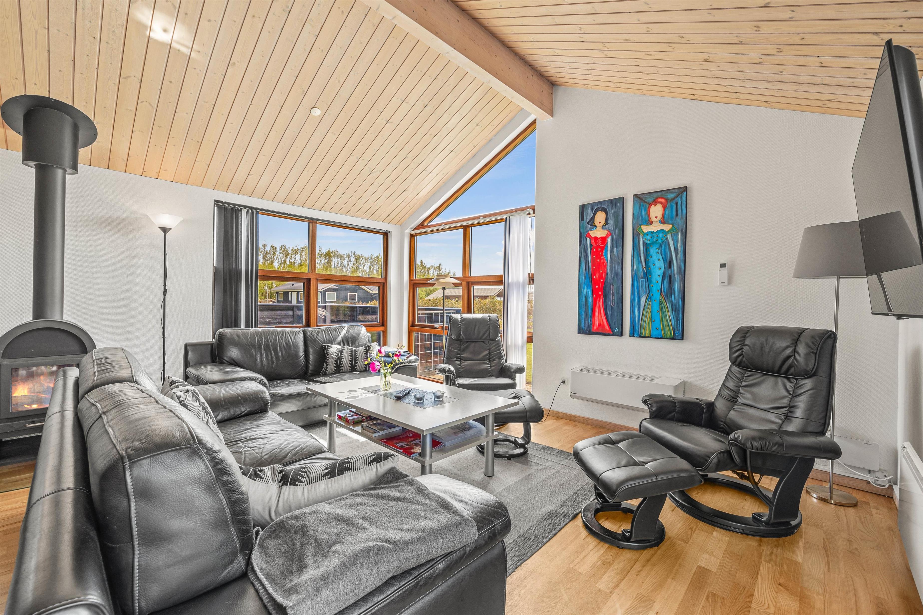 Sommerhuset opvarmes med en energivenlig varmepumpe, der hurtigt og effektivt skaber en behagelig varme og godt indeklima. På værelserne er der også radiatorer til at supplere med, hvis det skulle blive for køligt. Når I vil tage stemningen til næste niveau, kan I tænde op i brændeovnen og mærke varmen brede sig, mens flammerne skaber en fantastisk atmosfære.