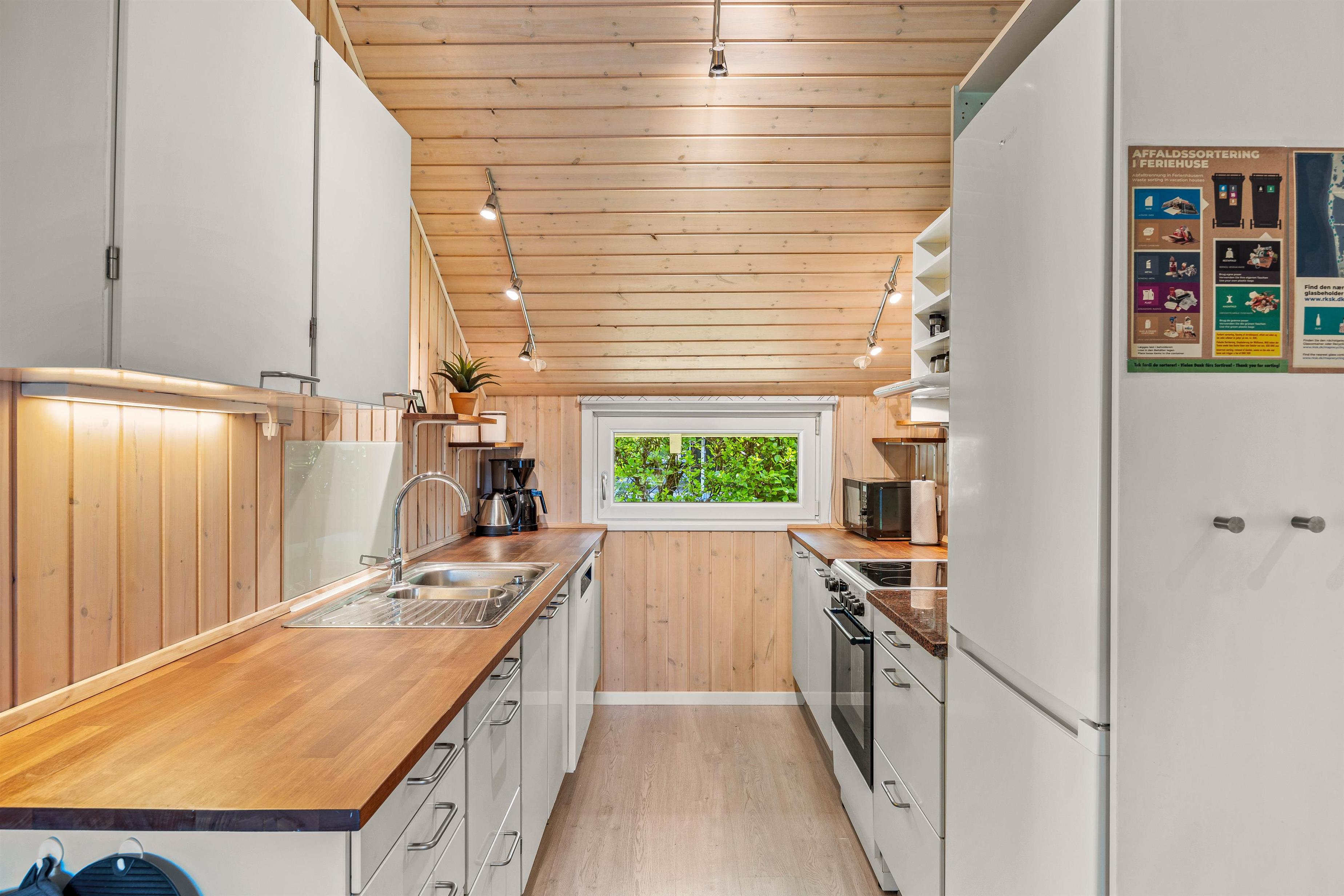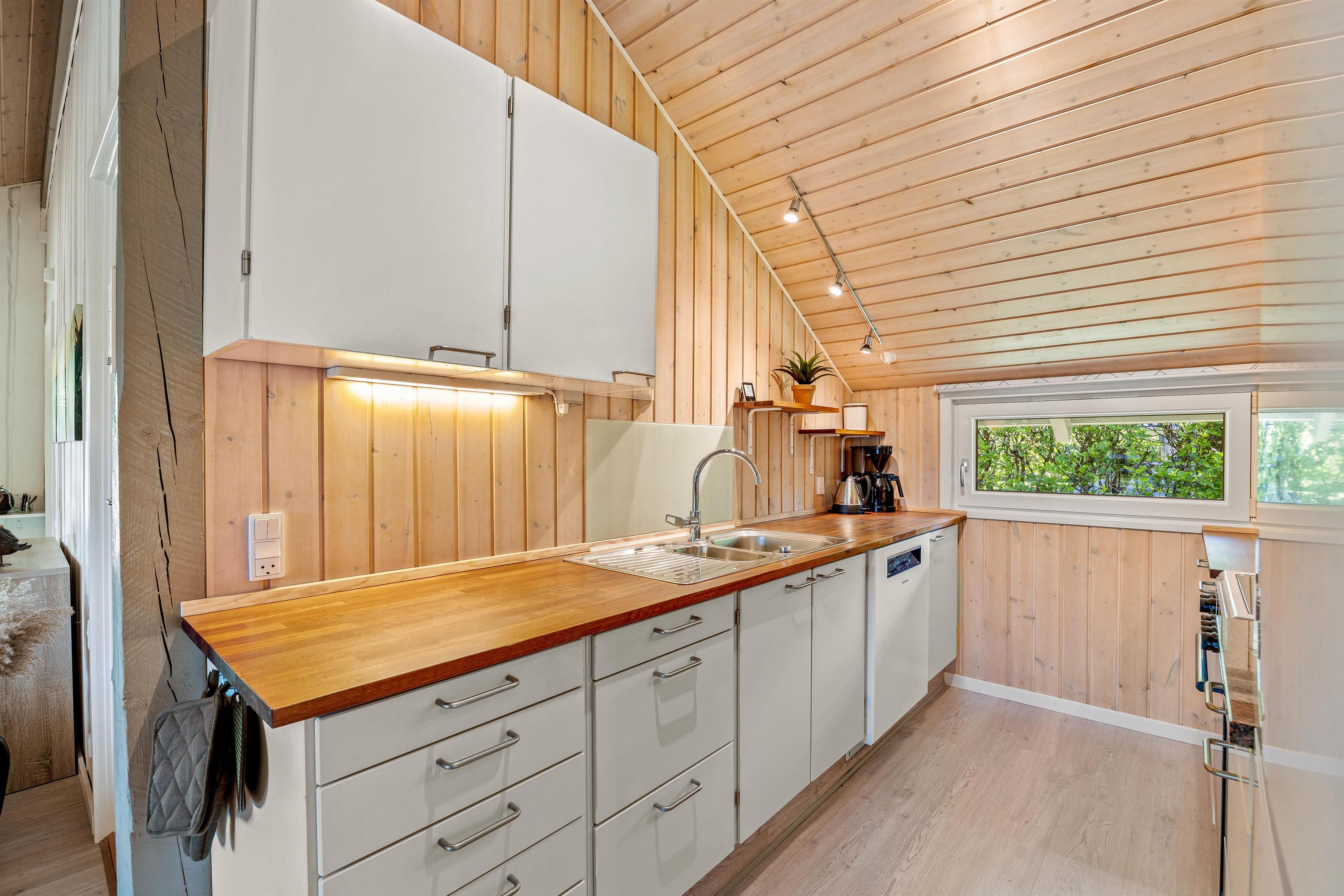 Inde i sommerhuset finder I et lyst og åbent køkken, der er direkte forbundet med både stue og spisestue. Dette skaber en sammenhængende atmosfære, hvor samtaler kan fortsætte uforstyrret fra madlavning til middagsbordet. Køkkenet er udstyret med en praktisk opvaskemaskine, så I hurtigt kan komme videre til dagens næste eventyr.
