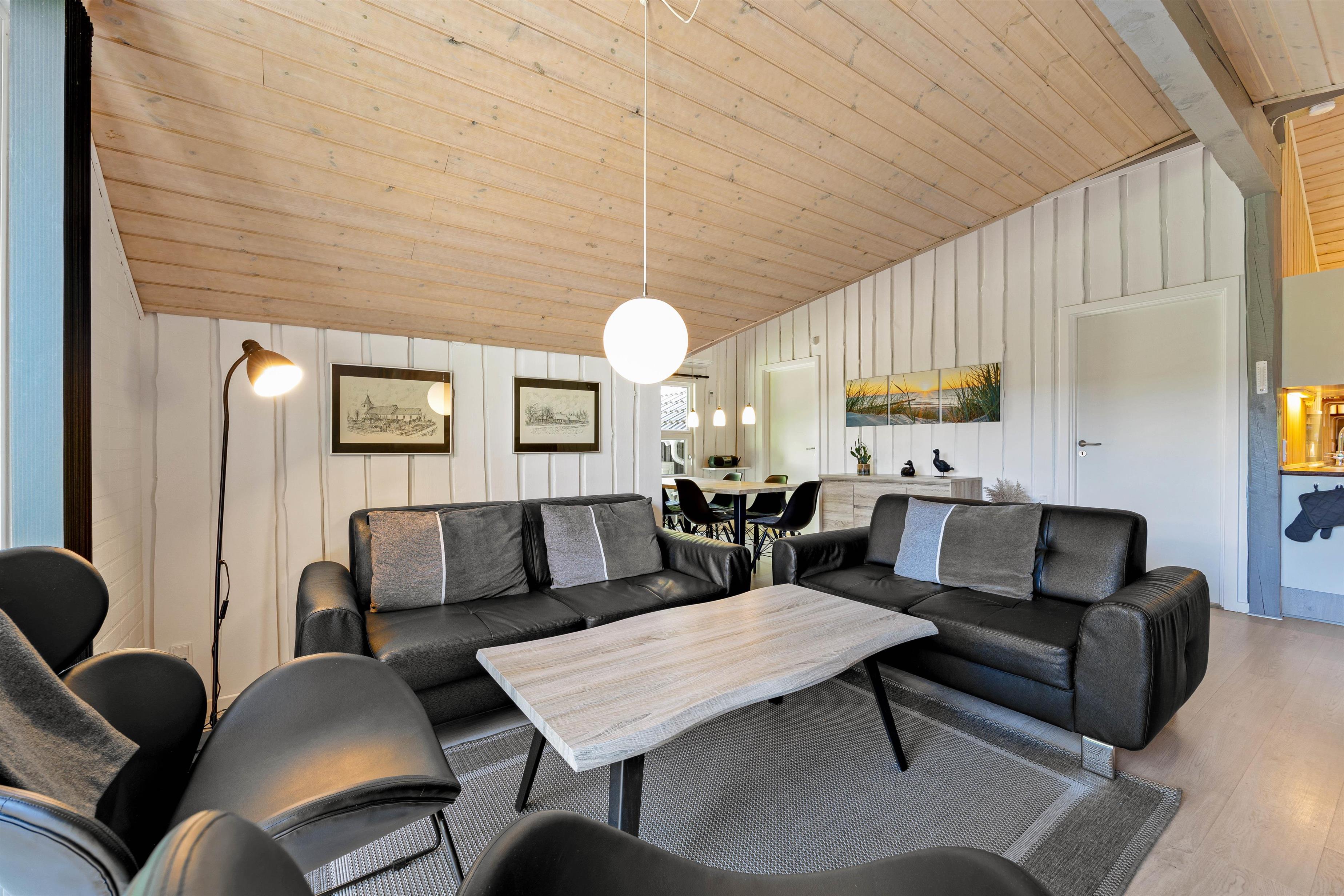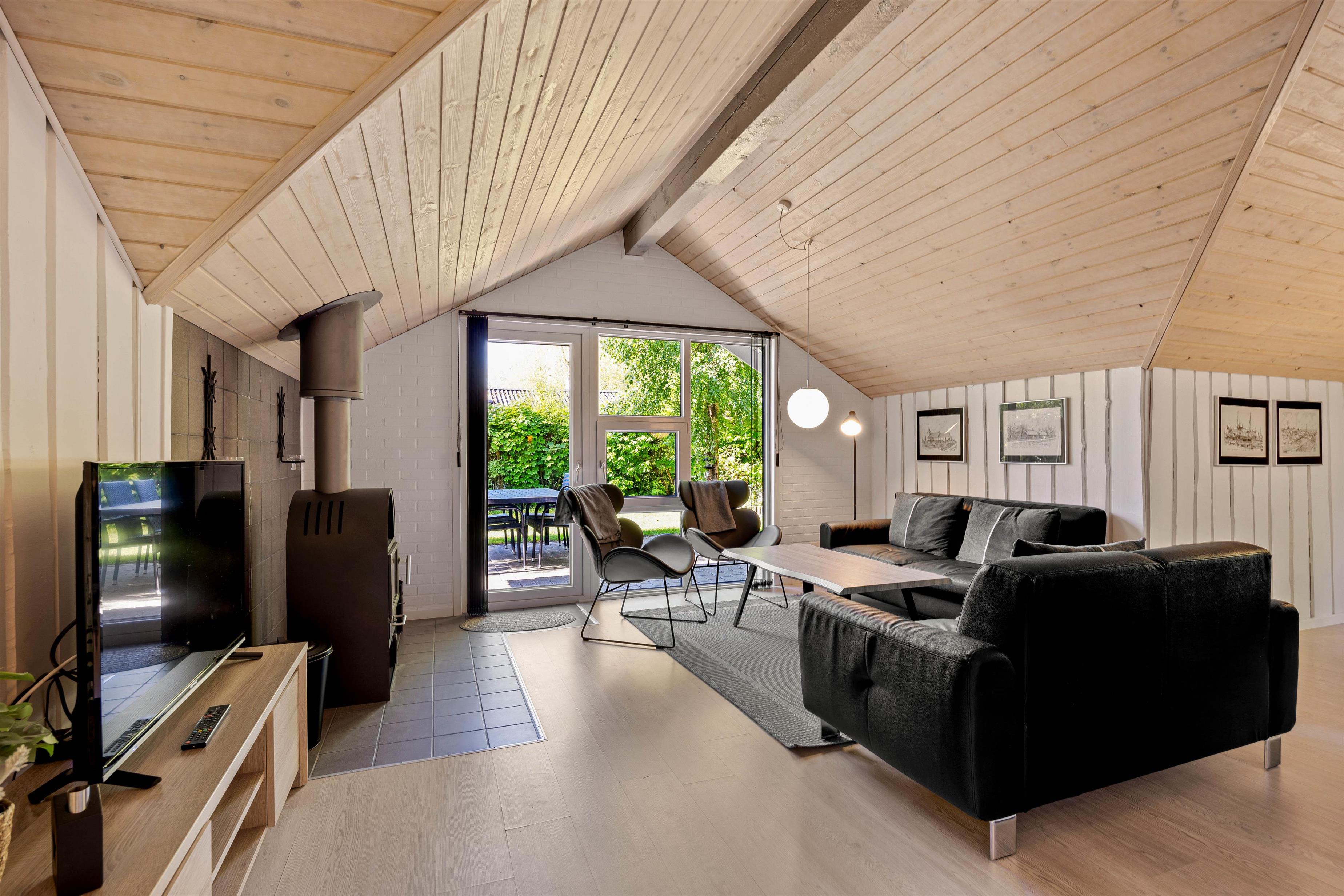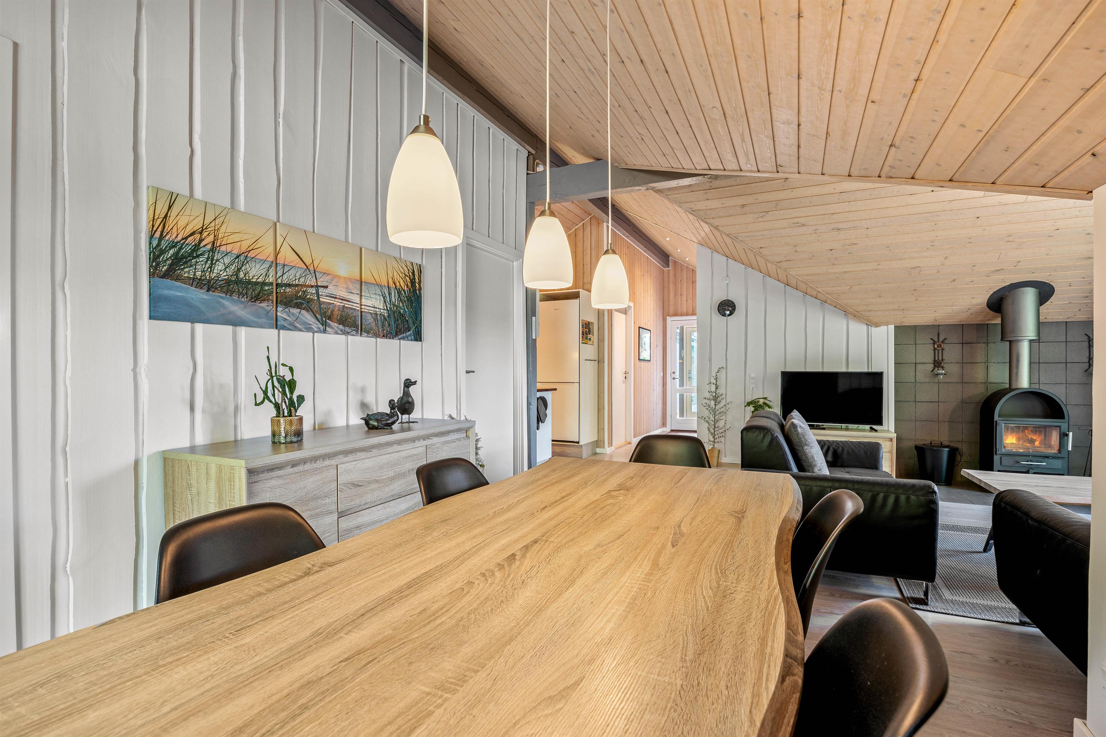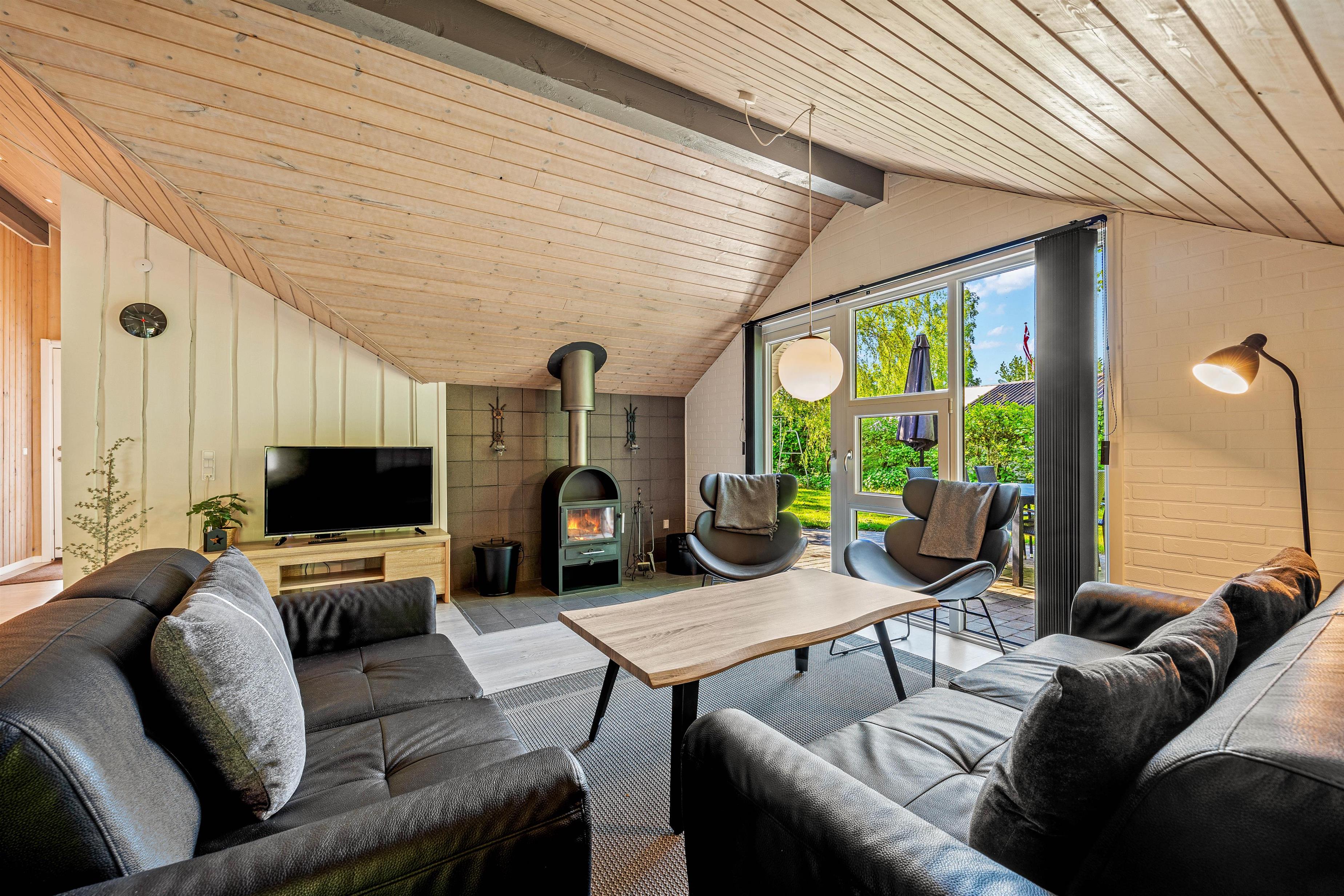 Stuen er indrettet med bløde møbler, der giver plads til hele familien. Det lyse interiør skaber en indbydende stemning, hvor I kan samles omkring tv'et og streame jeres yndlingsfilm og serier via tv'ets Chromecast. Alternativt kan I hygge jer ved brændeovnen på køligere aftener.