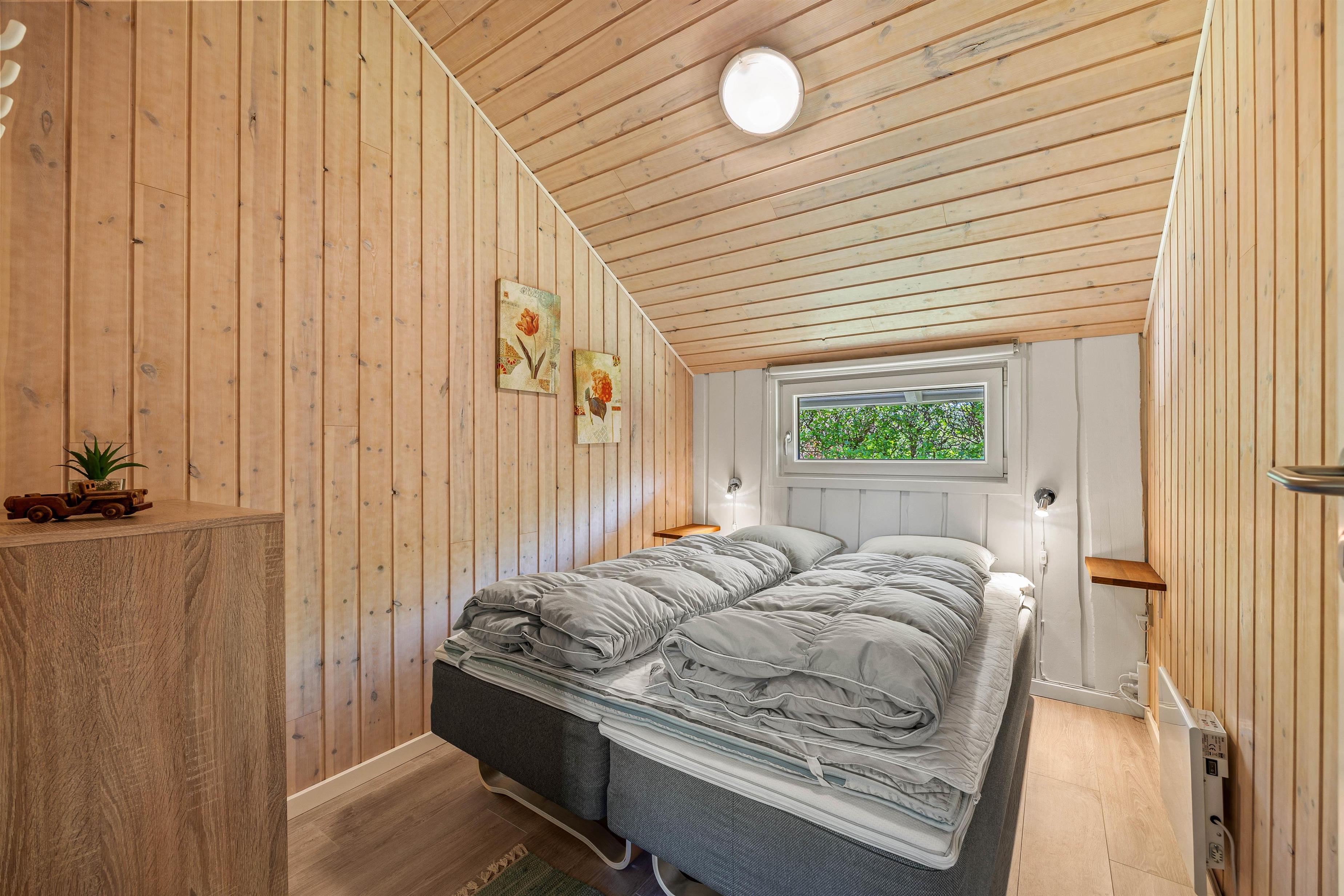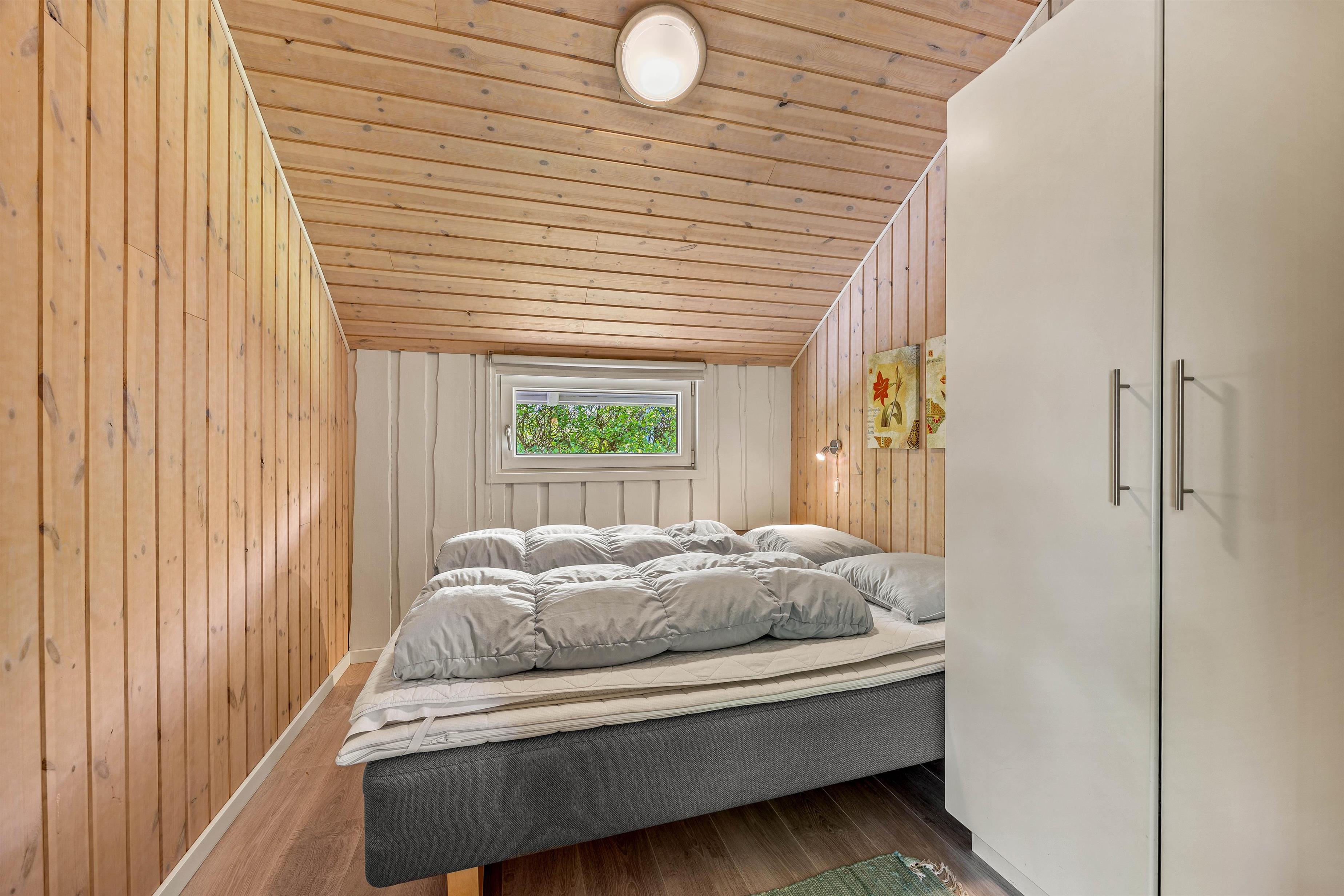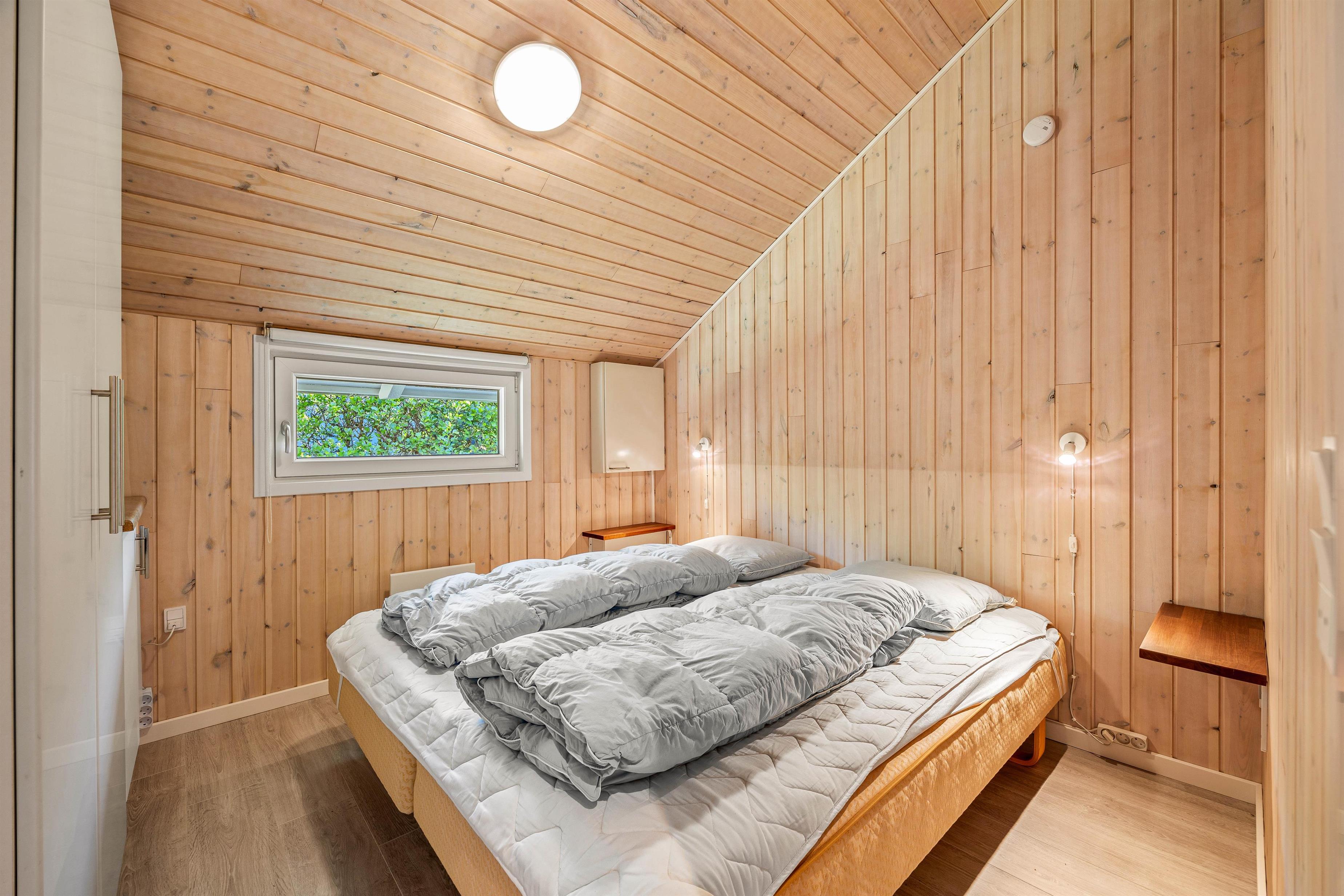 Sommerhuset rummer 3 lyse soveværelser alle med dobbeltsenge, charmerende indrettet med lyse træpaneler.