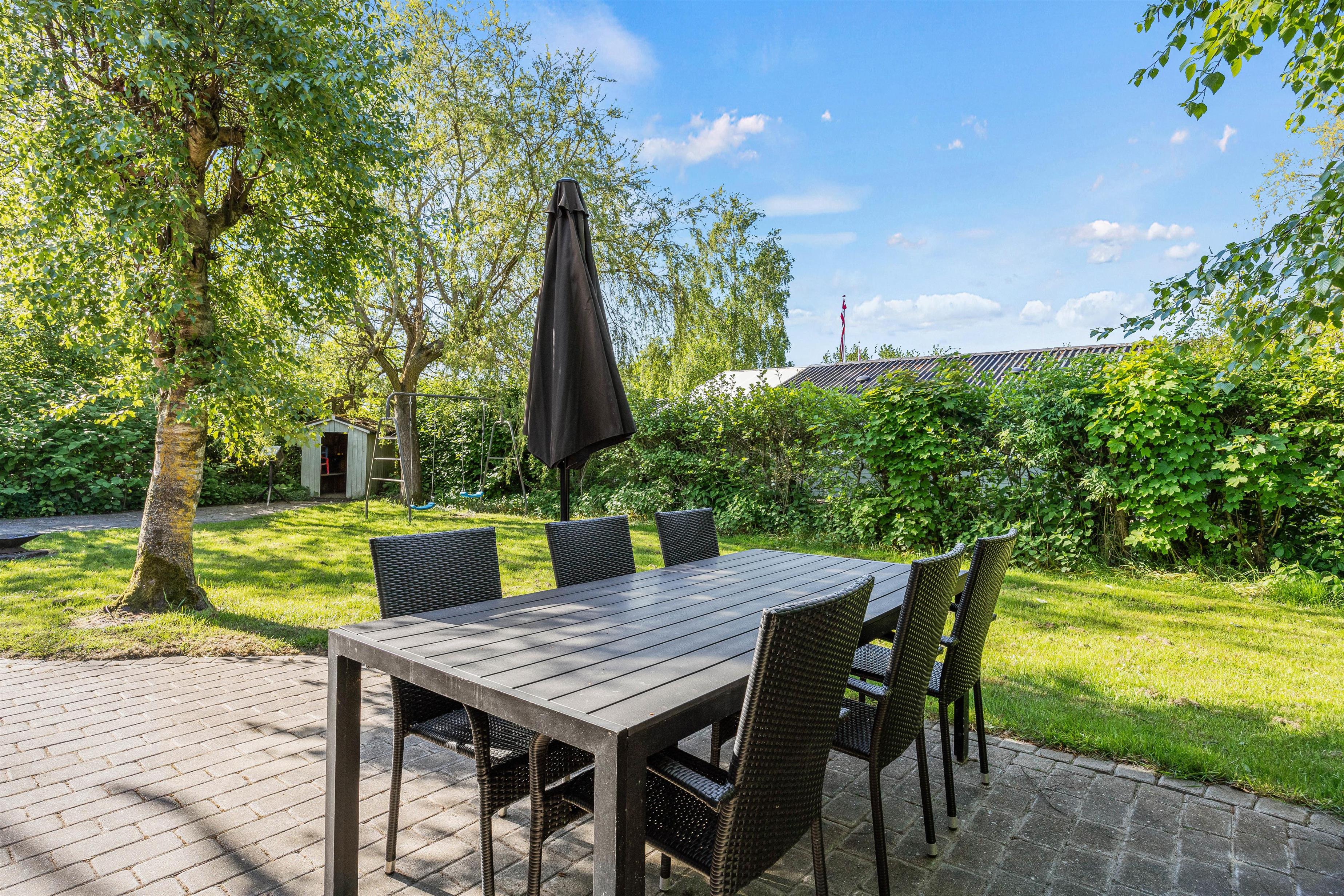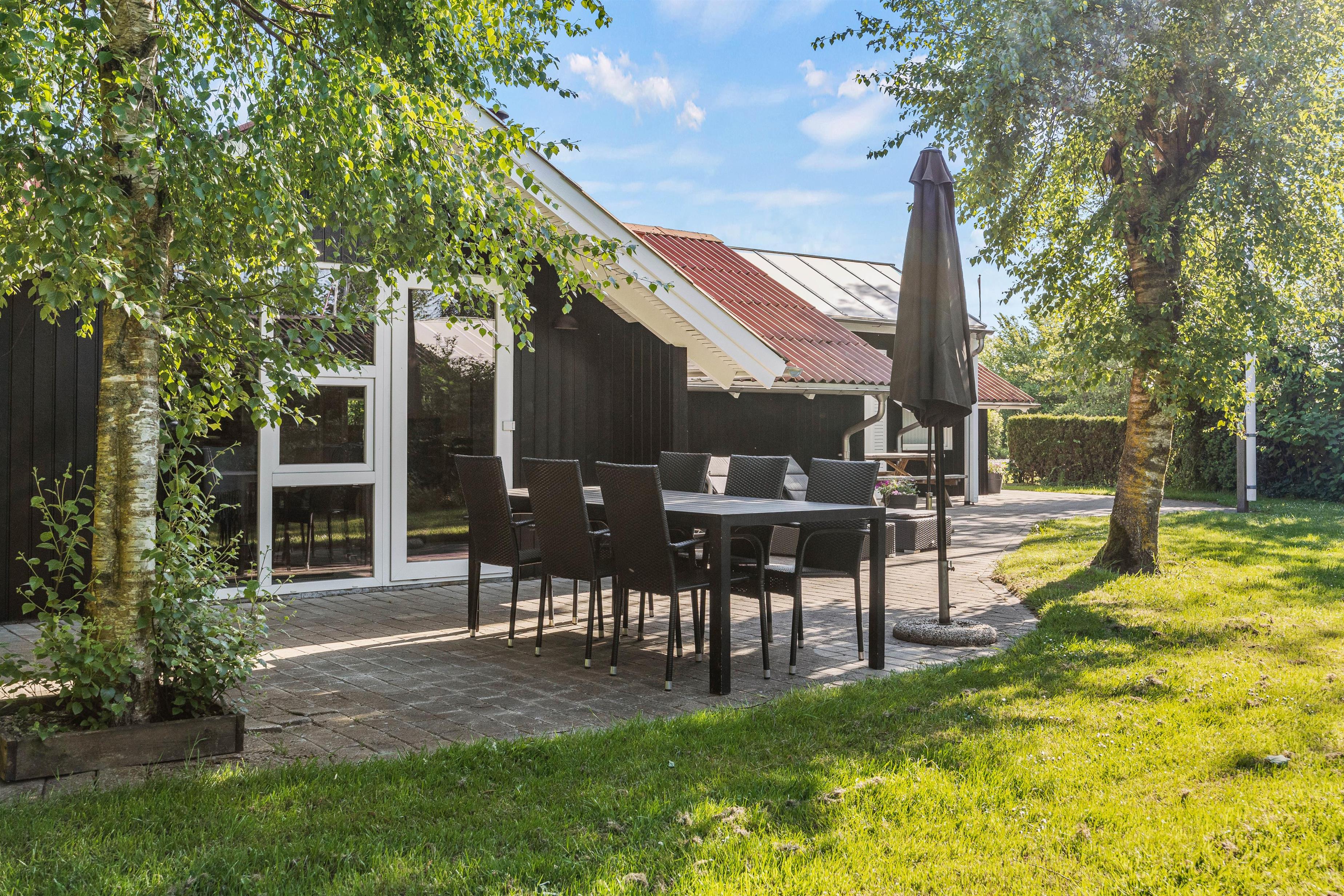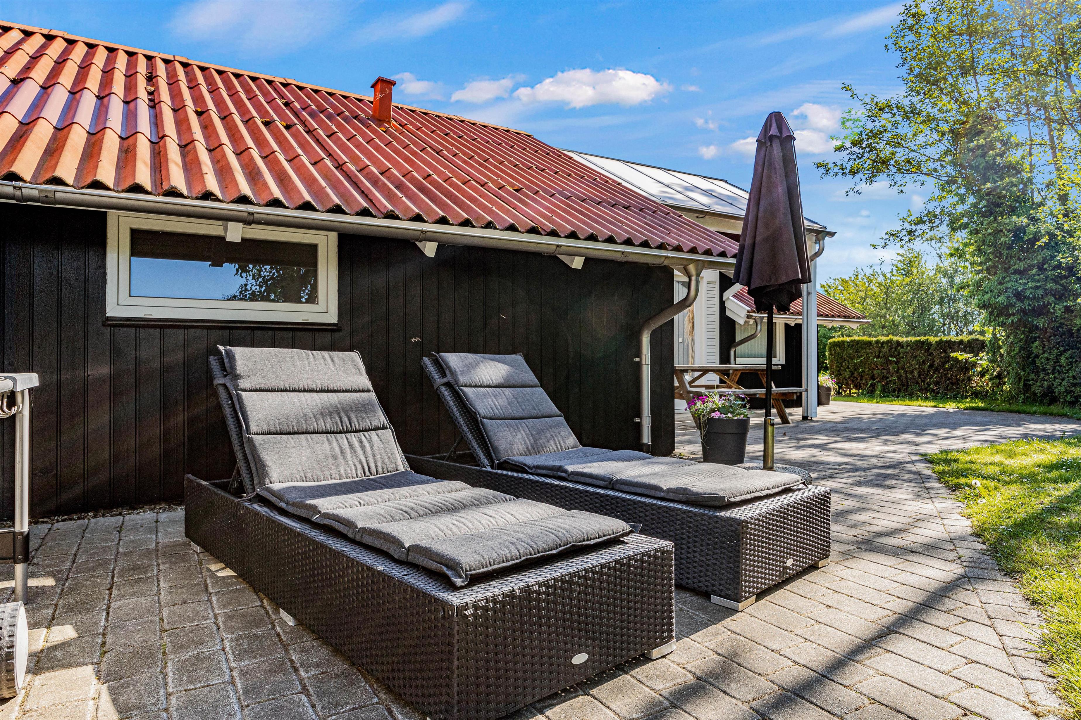 Udenfor sommerhuset finder I en afskærmet terrasse, perfekt til at nyde jeres morgenkaffe eller et glas vin til aften. Terrassen byder på forskellige hyggelige kroge, hvor I kan slappe af og nyde omgivelserne. For dem, der elsker udendørs madlavning, er der både grill, havemøbler og solvogne til rådighed, hvilket gør det nemt at tilberede og nyde måltider under åben himmel.
