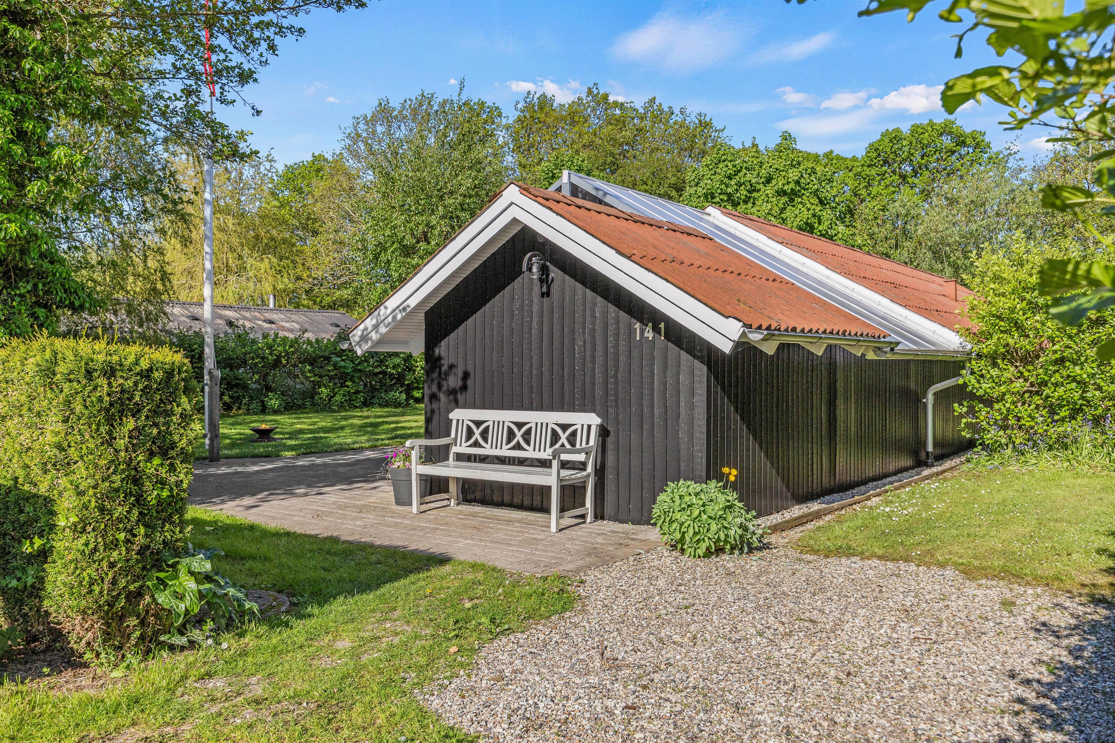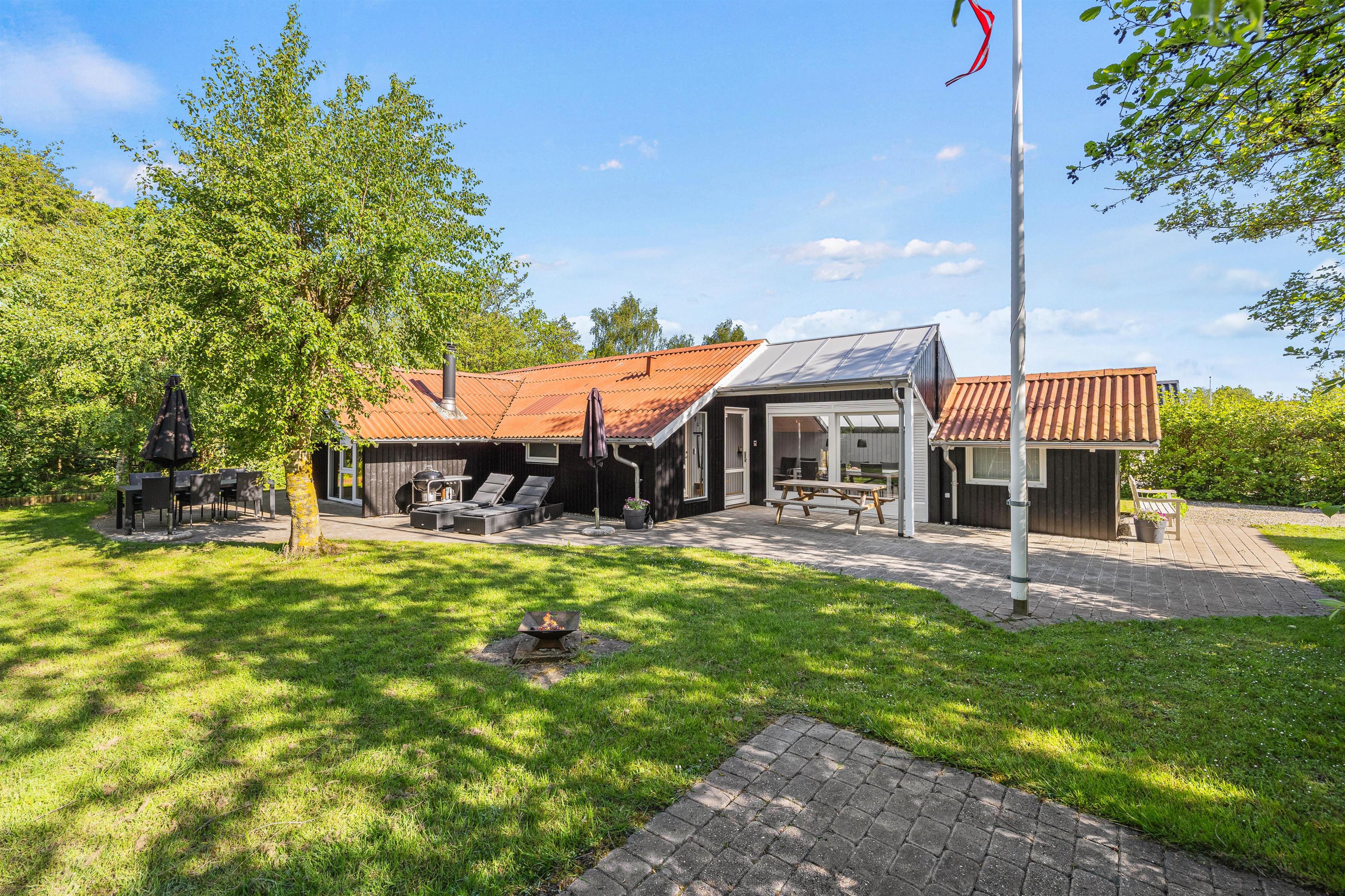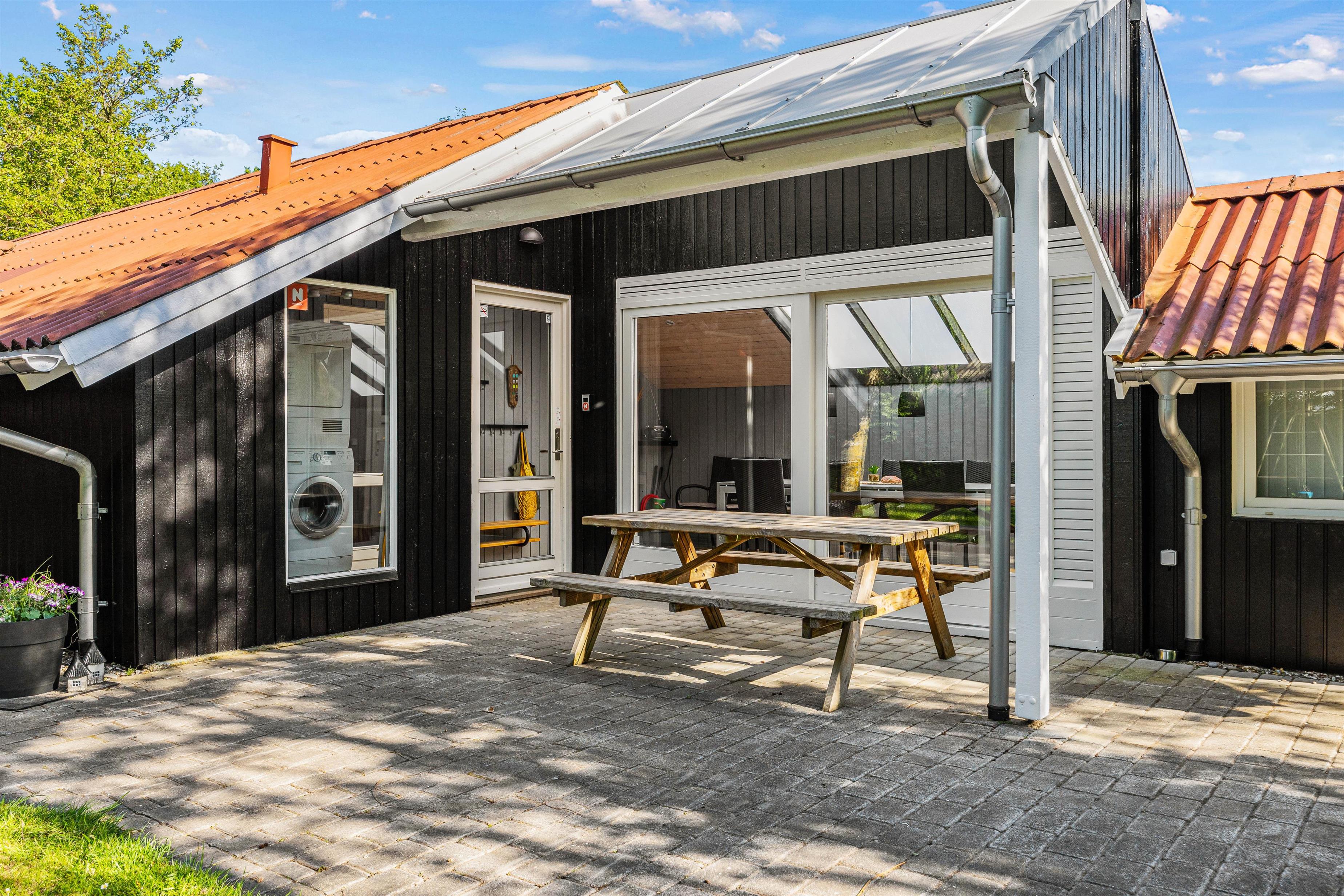 Udenfor sommerhuset finder I en afskærmet terrasse, perfekt til at nyde jeres morgenkaffe eller et glas vin til aften. Terrassen byder på forskellige hyggelige kroge, hvor I kan slappe af og nyde omgivelserne. For dem, der elsker udendørs madlavning, er der både grill, havemøbler og solvogne til rådighed, hvilket gør det nemt at tilberede og nyde måltider under åben himmel.