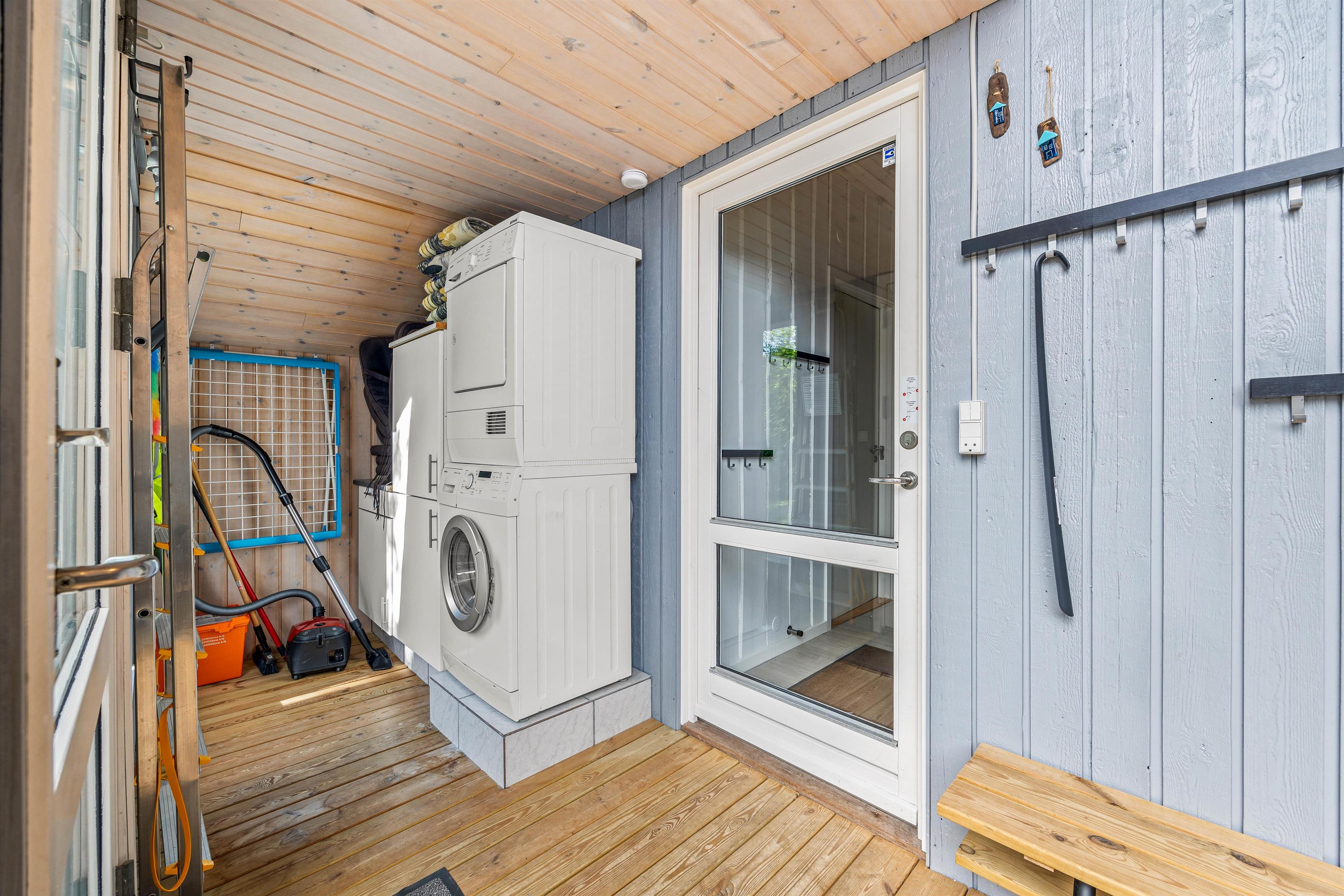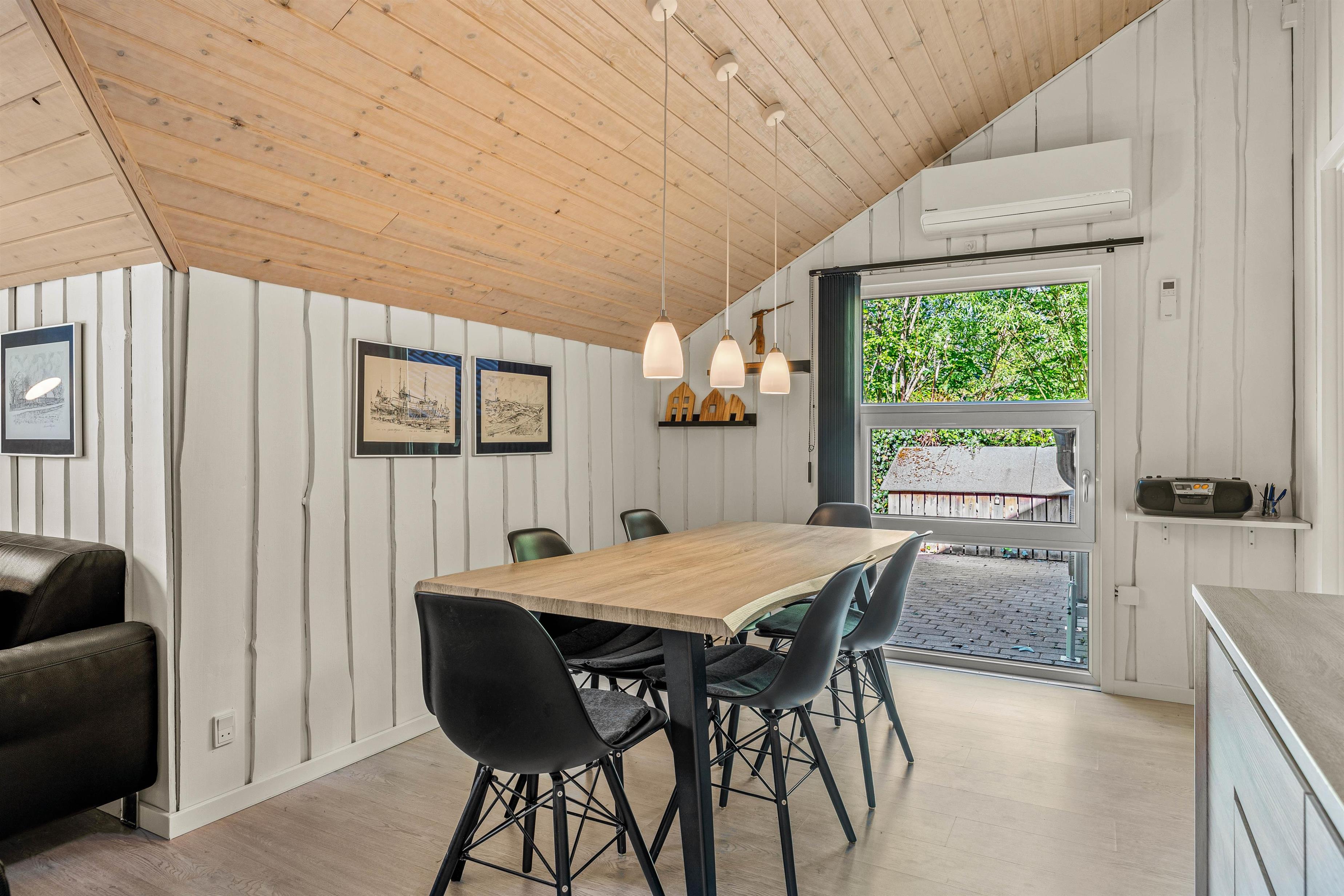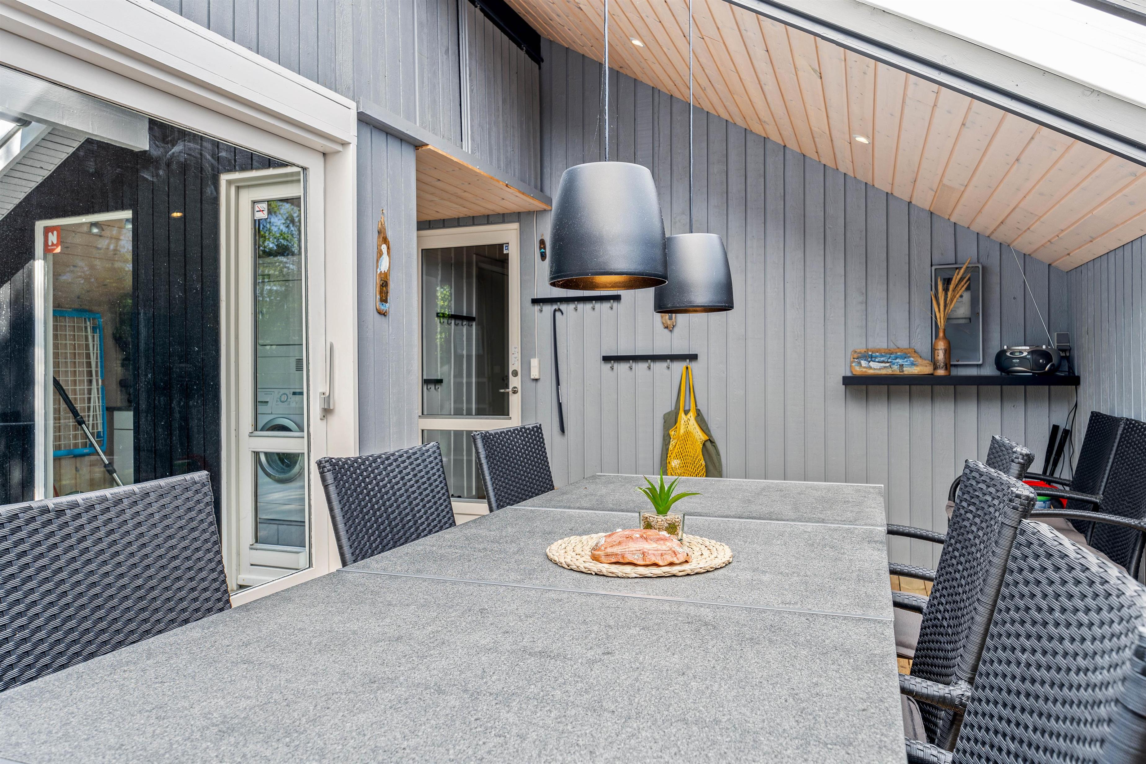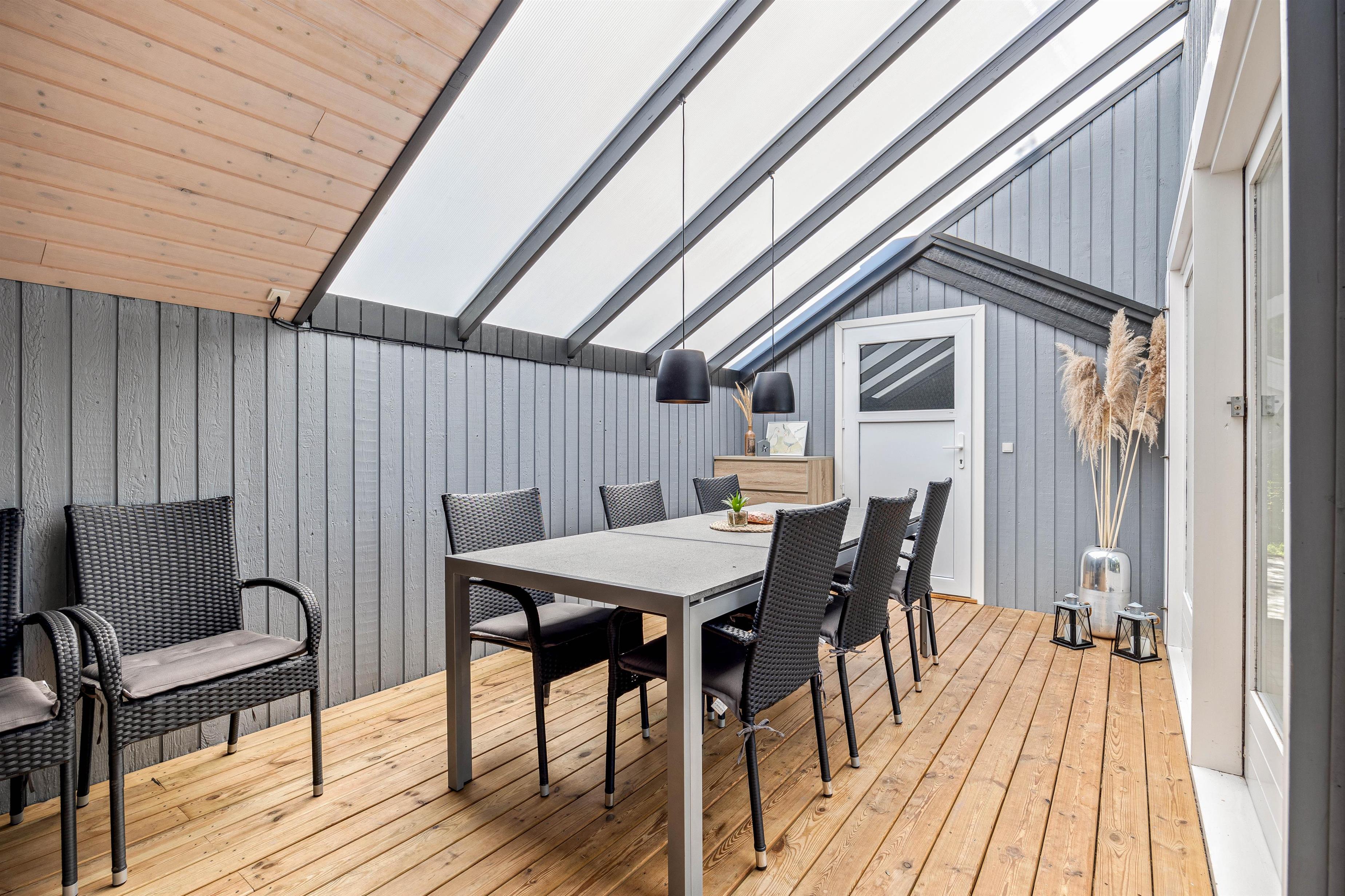 Et af sommerhusets hyggelige detaljer er udestuen, hvor I kan nyde jeres måltider med en skøn udsigt over haven gennem det store panoramavindue. Udestuen er en ideel plads til at slappe af med en bog eller en kop kaffe, uanset vejret.
