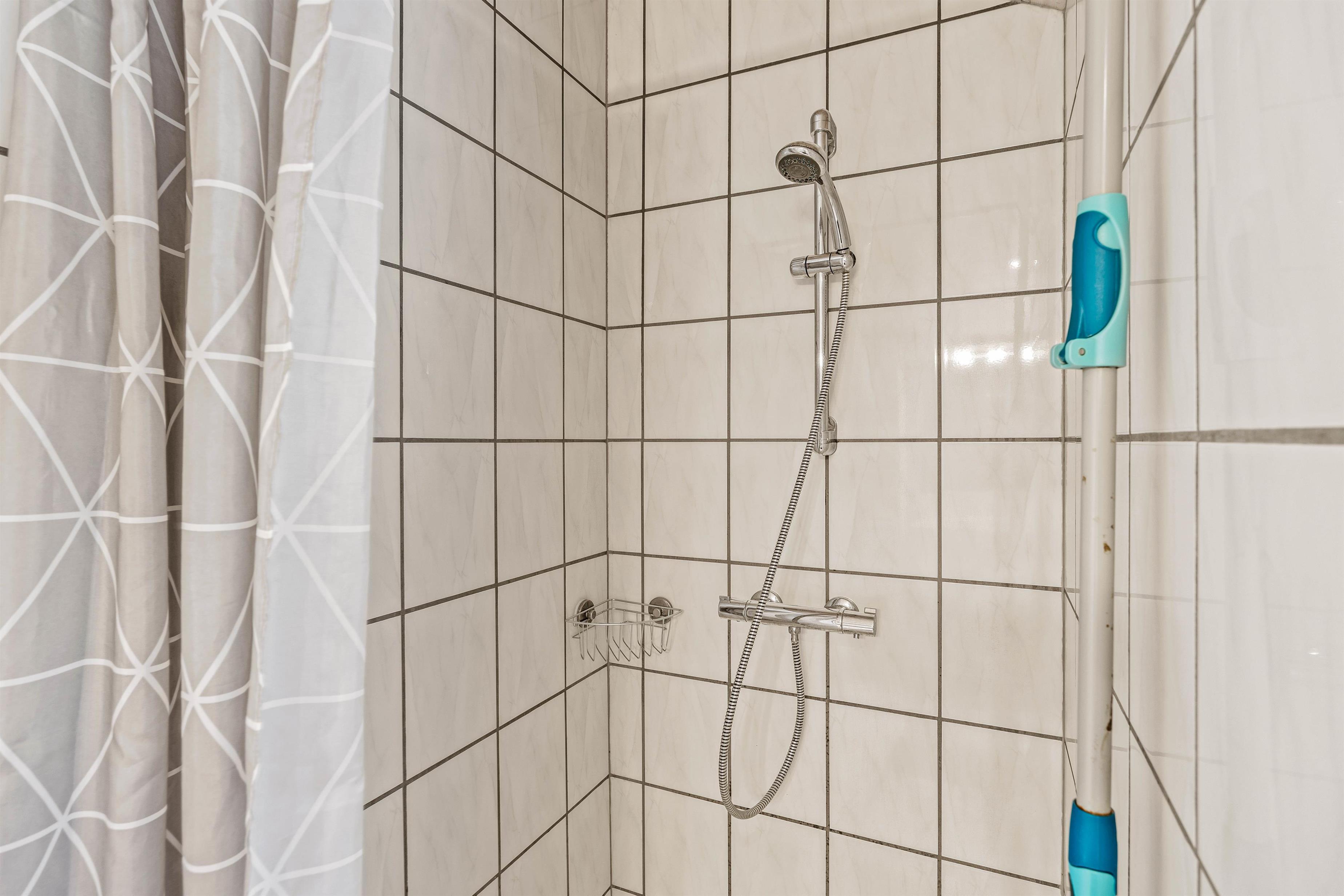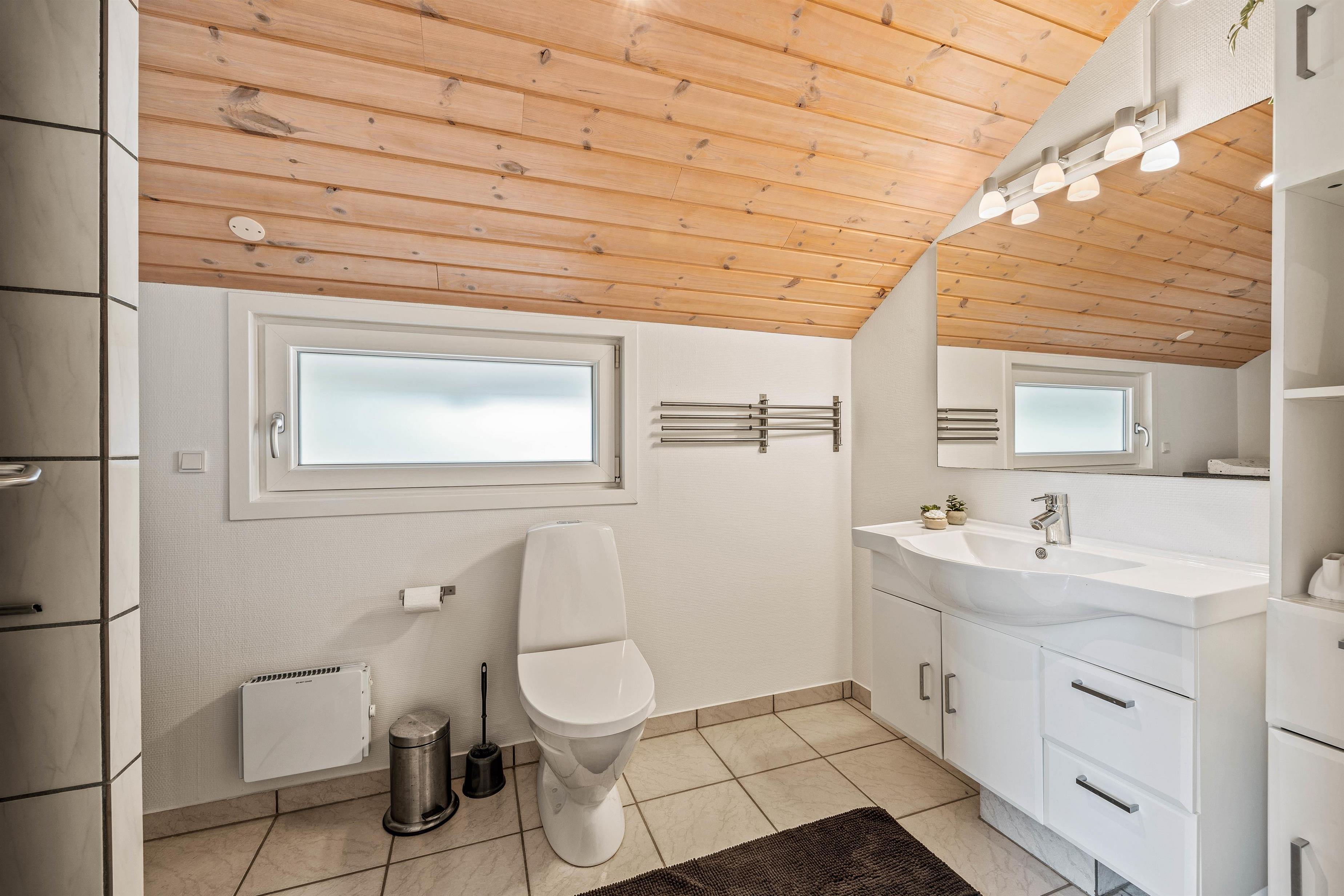 Badeværelset er lyst og indbydende, og her kan I nyde komforten af gulvvarme, som sikrer varme fødder selv på de køligste morgener.