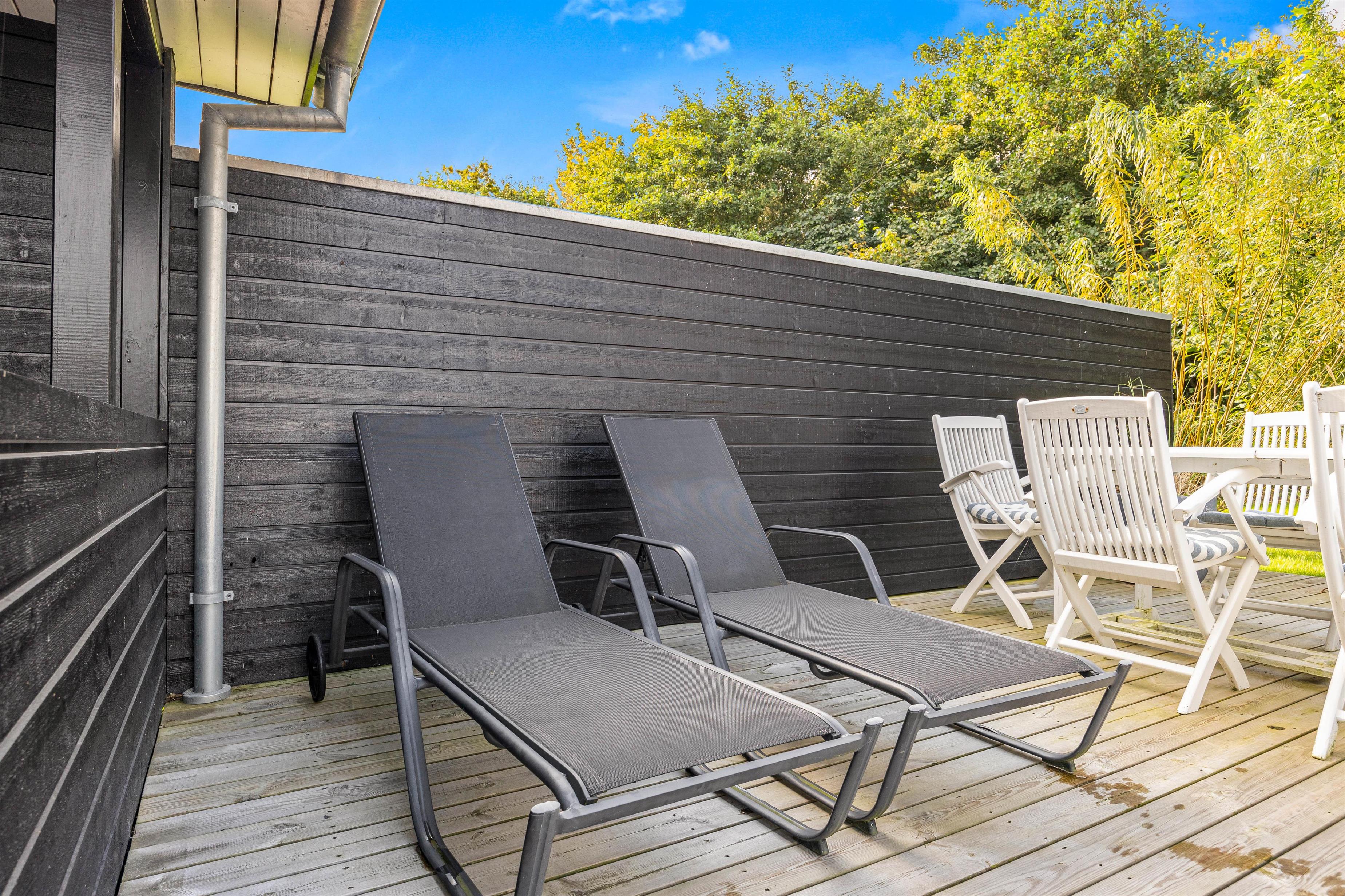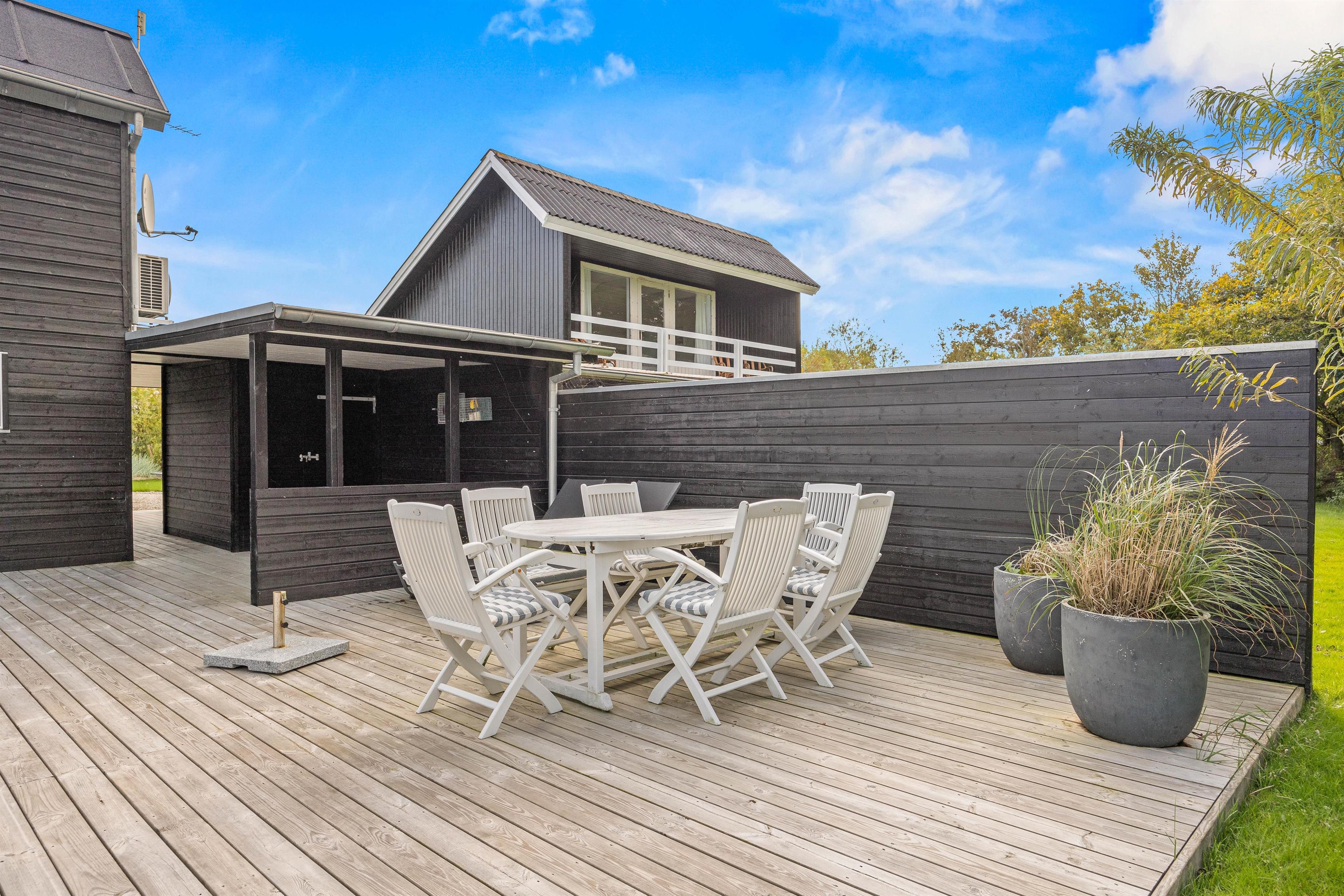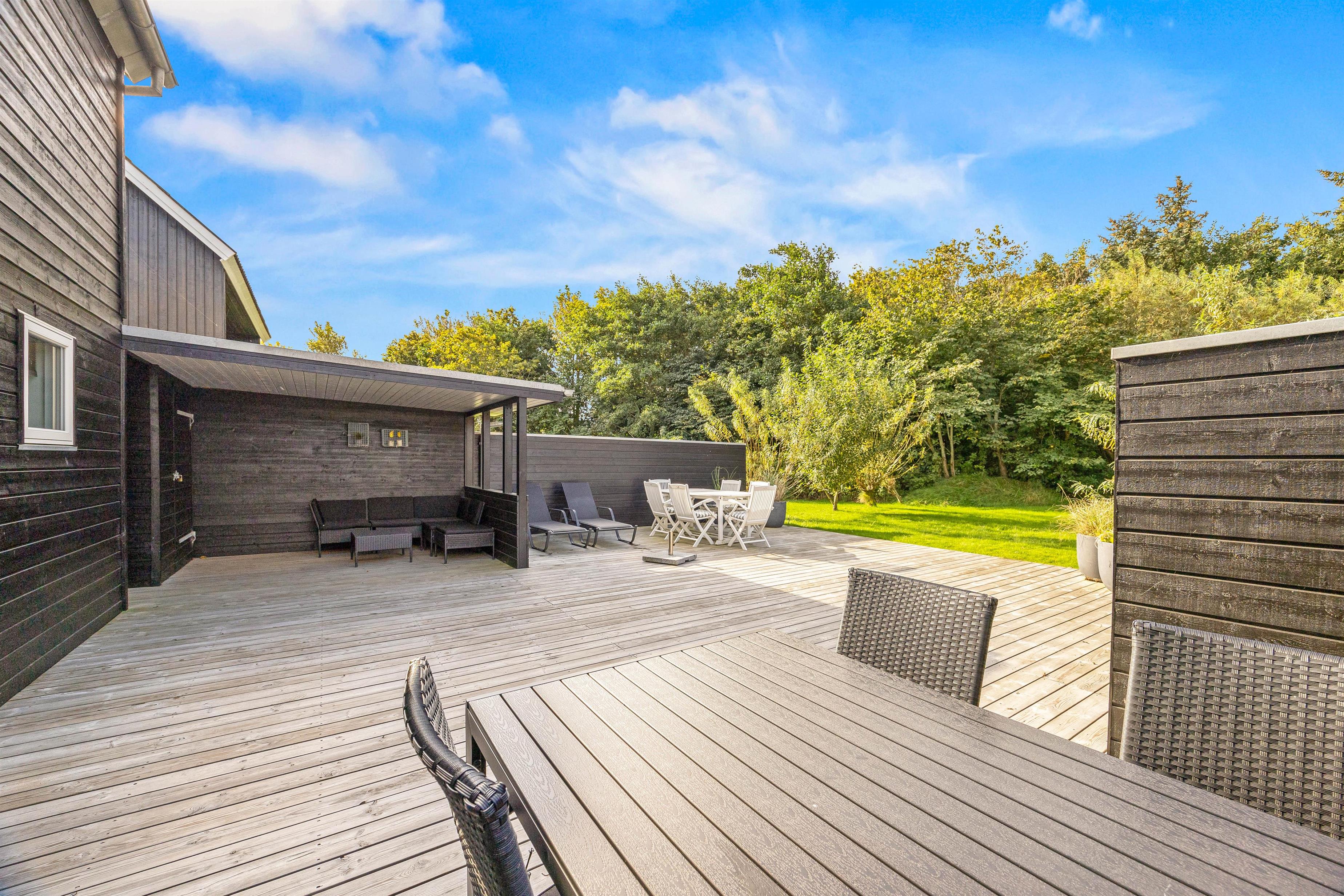 Omgivet af flere terrasser, delvist overdækkede og afskærmede, kan I nyde hyggelige stunder og samvær udendørs. Uanset om I foretrækker sol eller skygge, er der altid et passende sted at slappe af og nyde det gode vejr. Terrasserne er fuldt udstyret med alt. Fra havemøbler til solvogne, parasoller og en grill, er alt til rådighed for jer for at skabe den perfekte feriestemning under åben himmel.