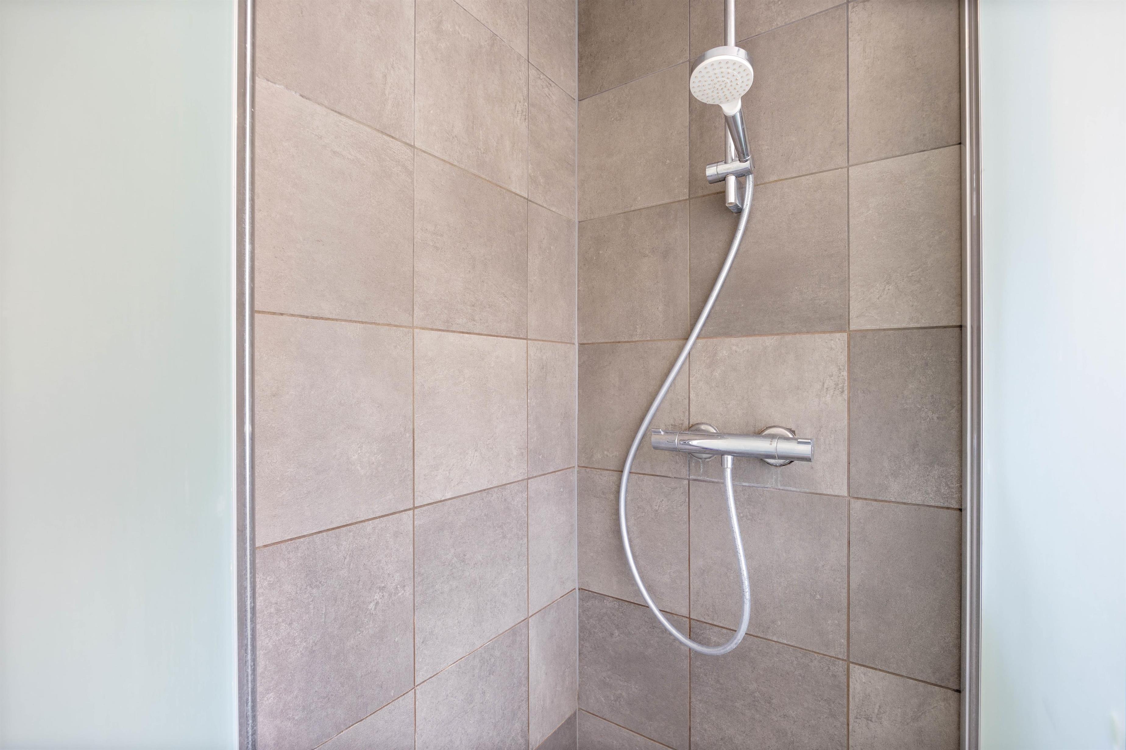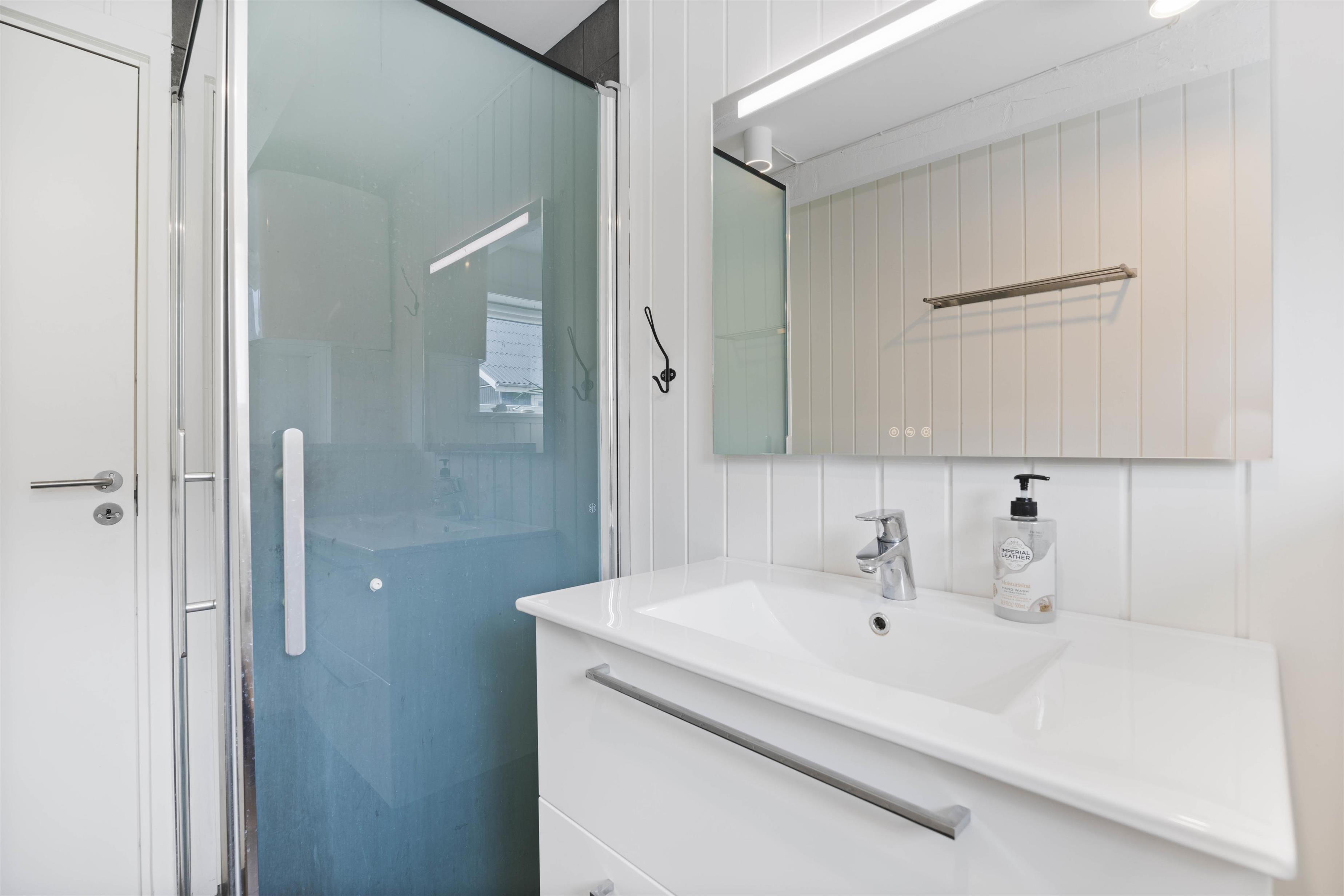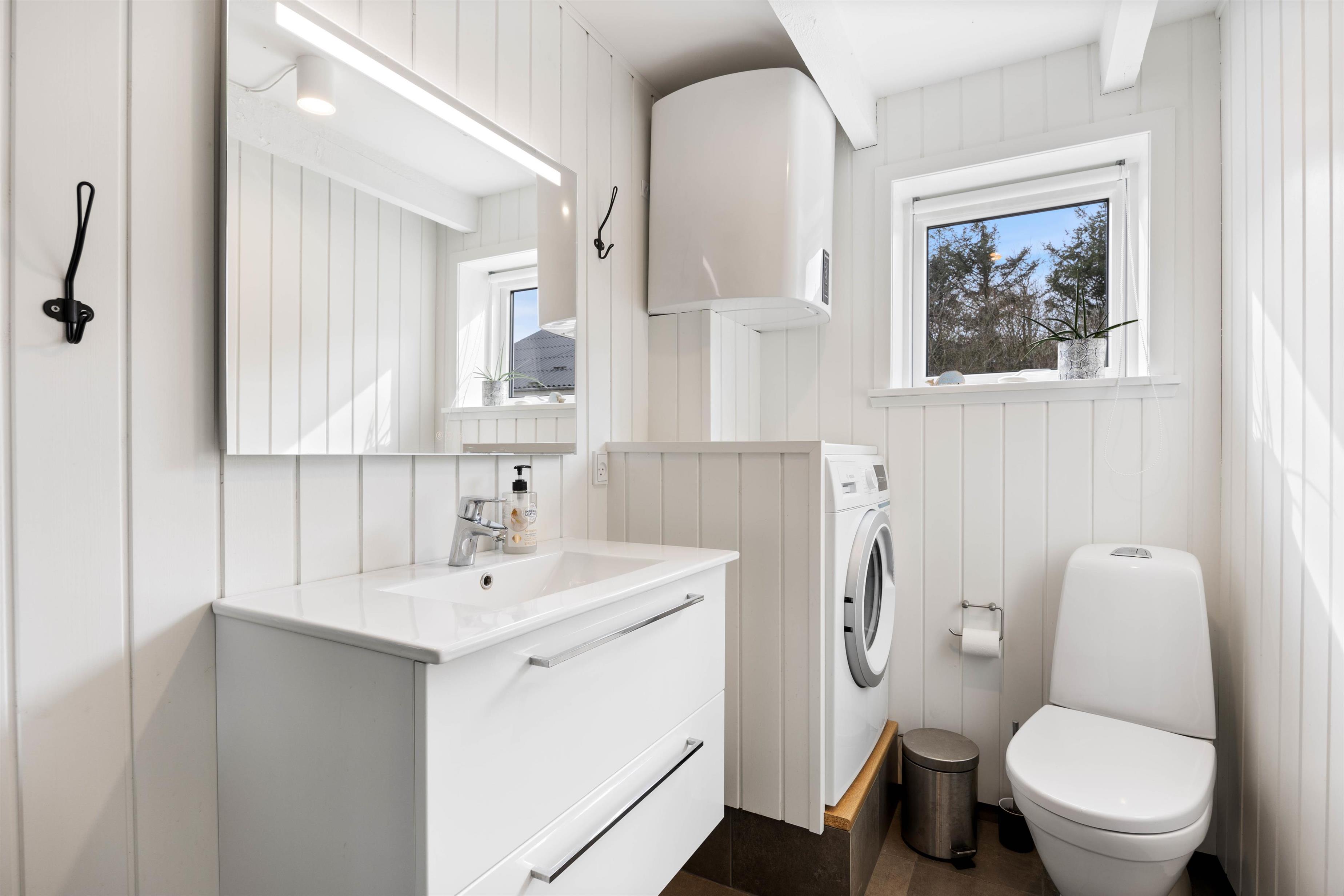 På badeværelset, der er udstyret med behagelig gulvvarme, finder du også en praktisk vaskemaskine, der gør det nemt at holde feriebeklædningen frisk og ren.