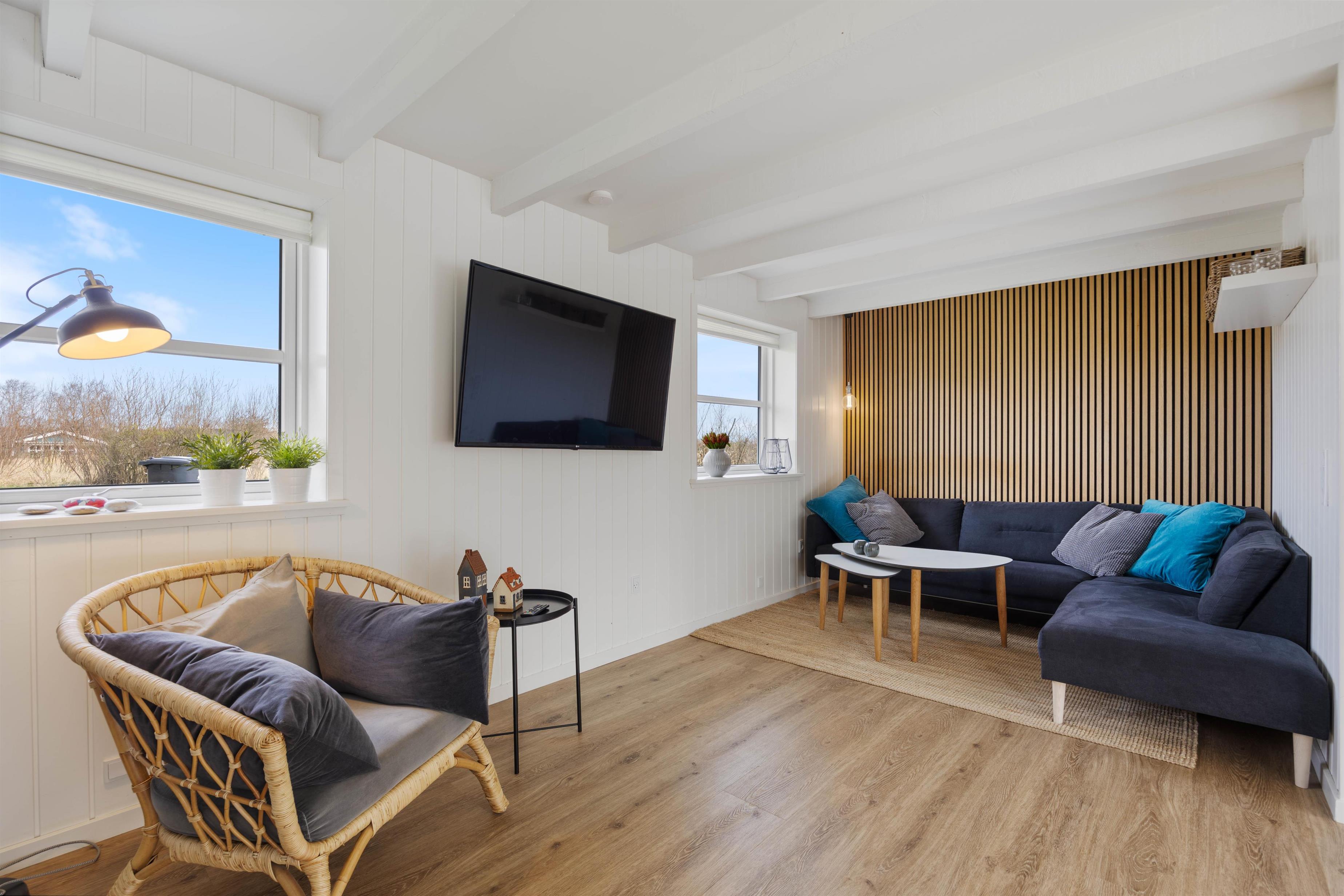 I dette to-etagers sommerhus finder I en rummelig stue, der inviterer til hygge og samvær. Med store vinduer og dejligt lysindfald er det det ideelle sted at tilbringe tid sammen som familie. Om vinteren kan I samles omkring brændeovnen og nyde varmen, mens I om sommeren kan åbne dørene ud til den friske luft. Sommerhuset er desuden udstyret med en energibesparende varmepumpe, der både holder temperaturen behagelig og bidrager til en miljøvenlig ferieoplevelse.