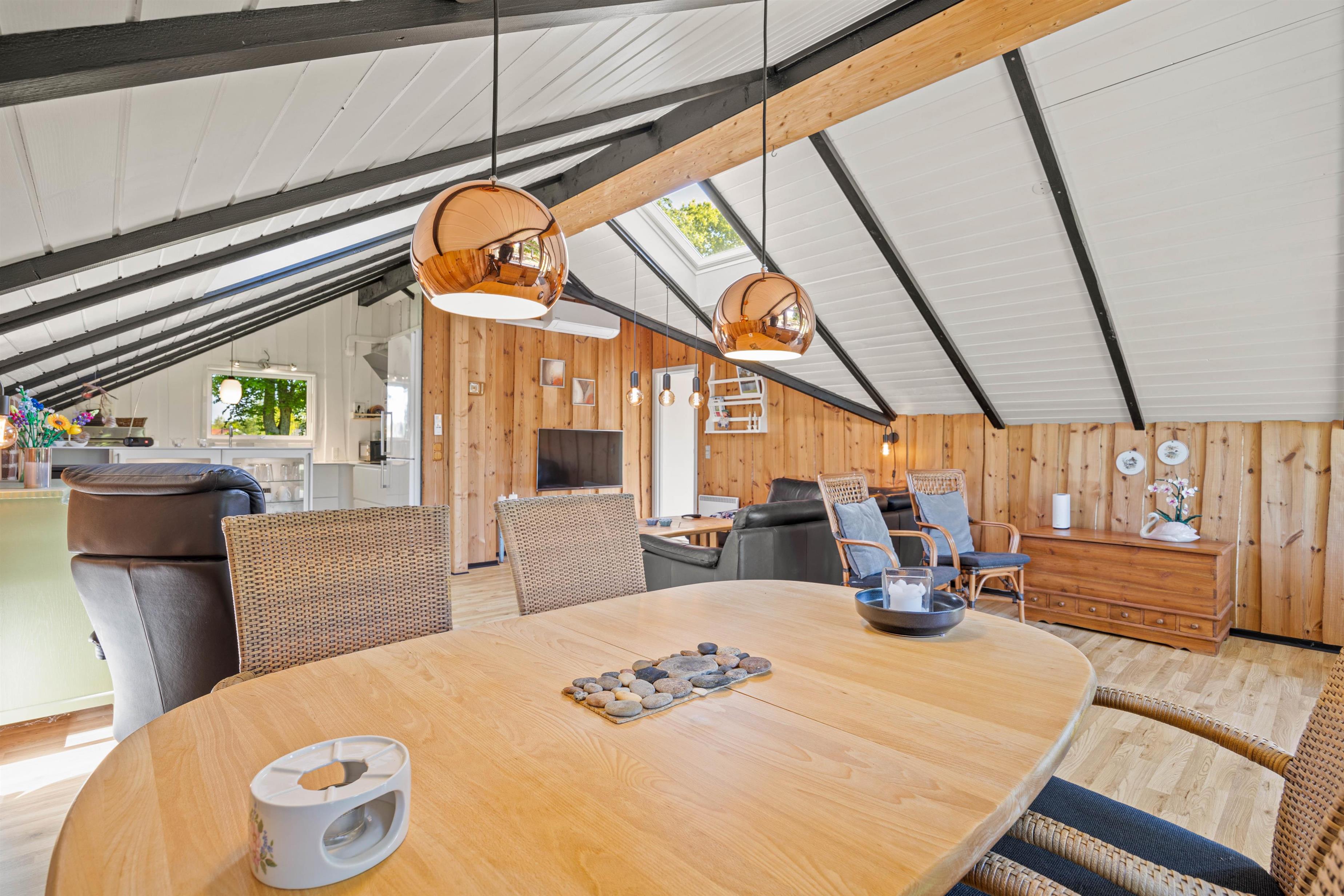 I stuen strømmer lyset ind fra det store ovenlysvindue og det store vinduesparti. Stuen er feriehusets hjerte, og her kan hele familien samles omkring spisebordet til en spilleaften, I kan slænge jer i sofaen til en film, der kan streames via Chromecast, eller lave mad sammen i det åbne køkken ud mod stuen.