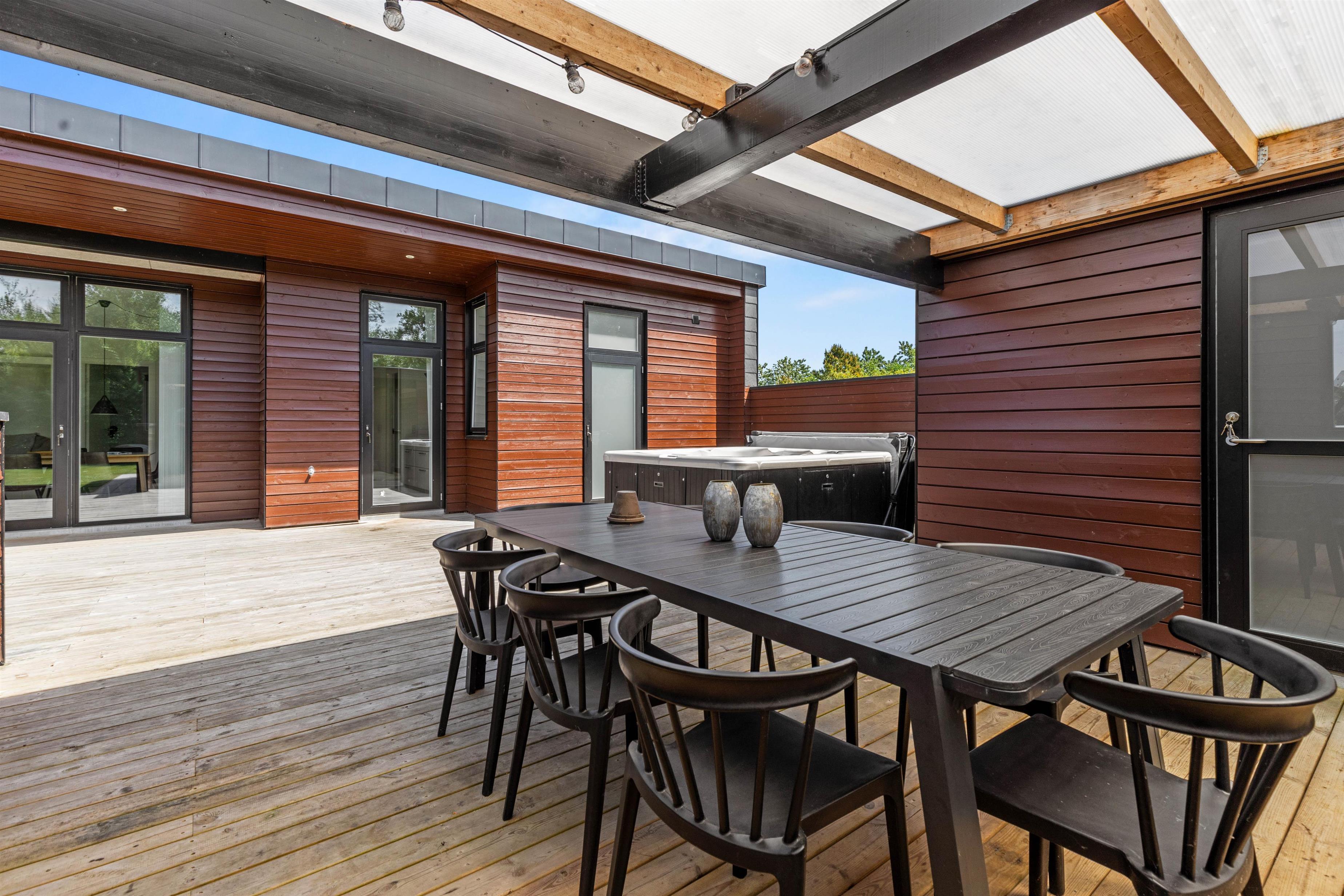 Terrassen rummer en luksuriøs spa med plads til 5 personer, hvor I kan synke ned i det varme, boblende vand og lade hverdagens stress fordampe under den åbne stjernehimmel.