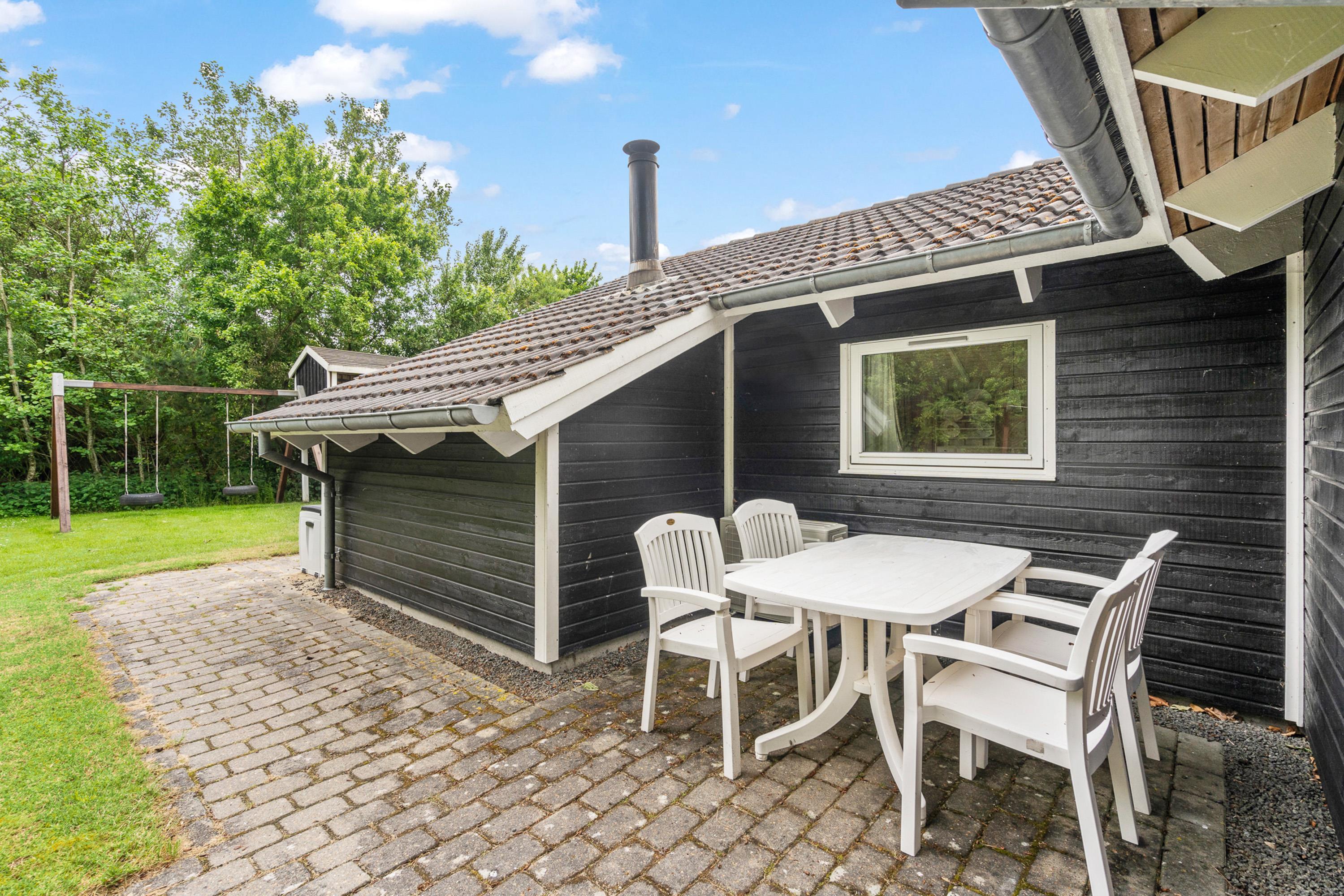Fra sommerhuset kan I træde ud på det dejlige udeområde, hvor hele familien kan nyde feriens solrige dage. På terrassen kan I læne jer tilbage i havemøbler og liggestole, mens børnene leger i haven, hvor der er både sandkasse og gyngestativ.