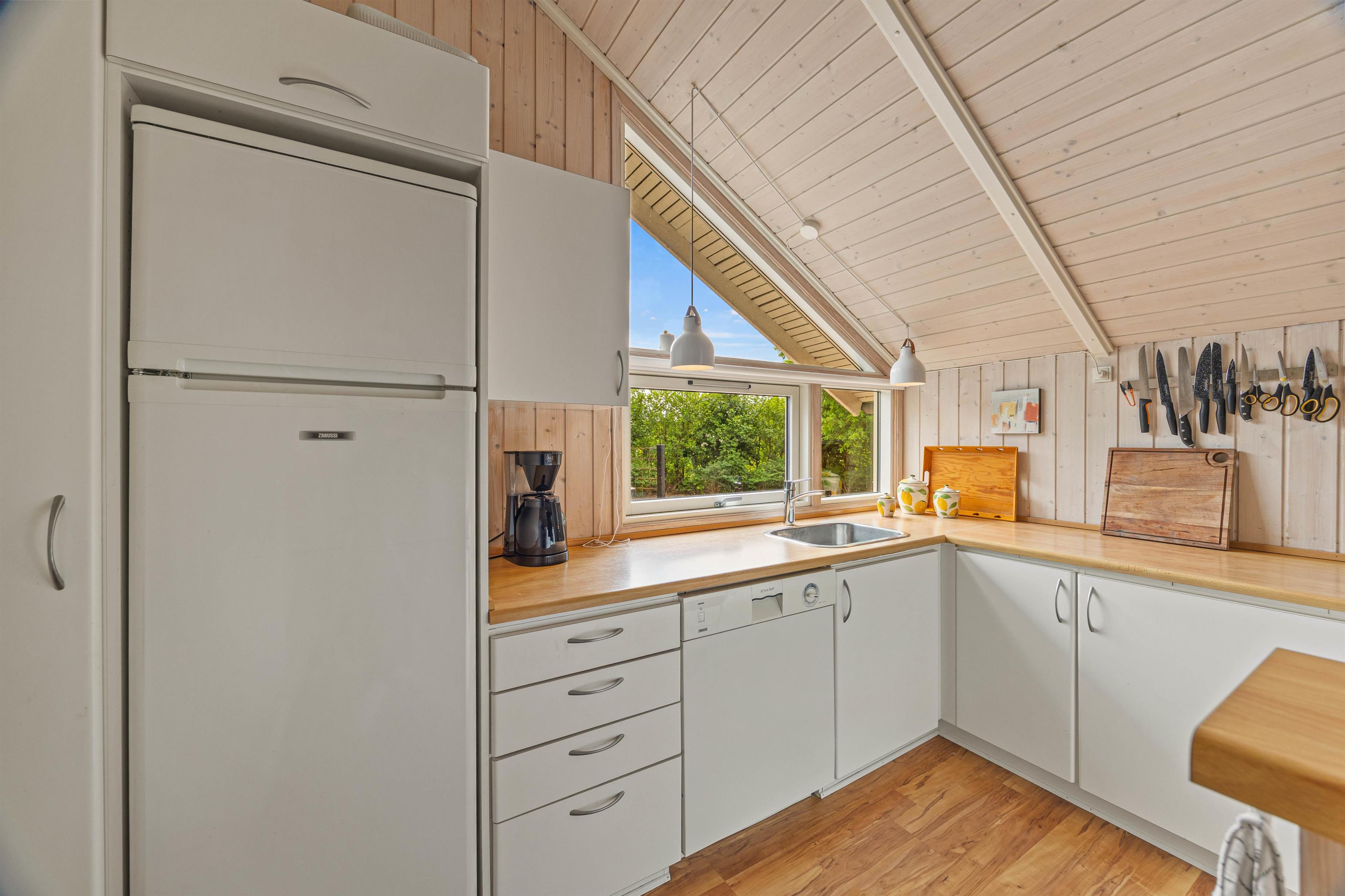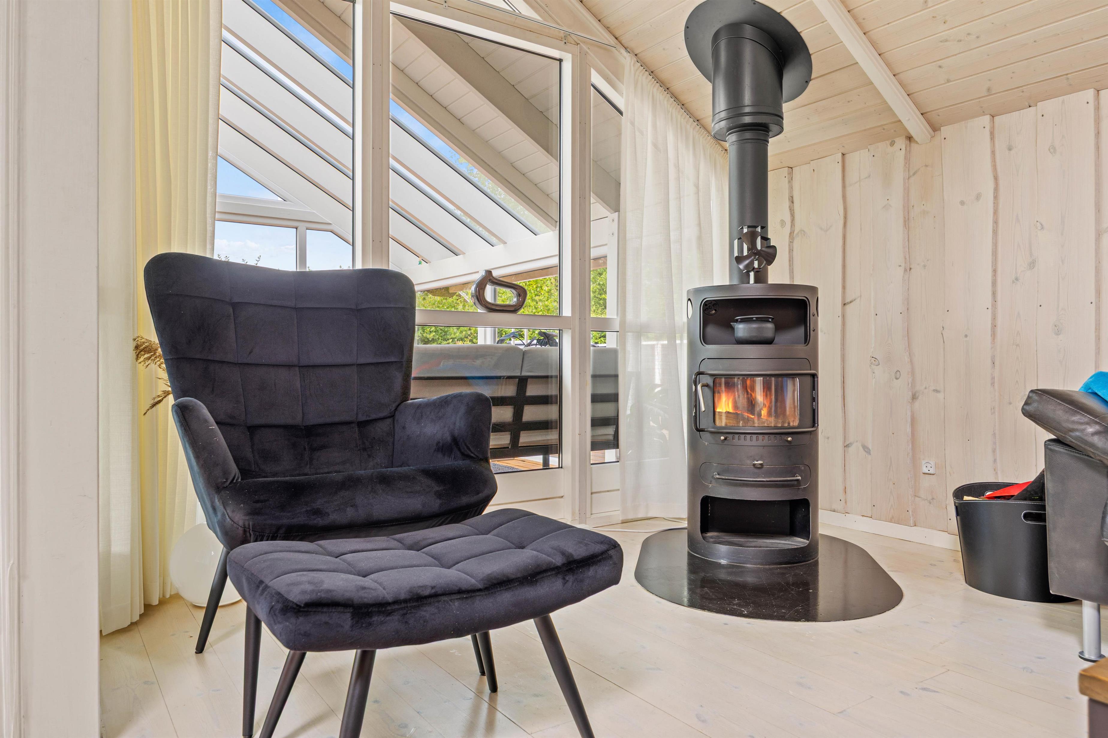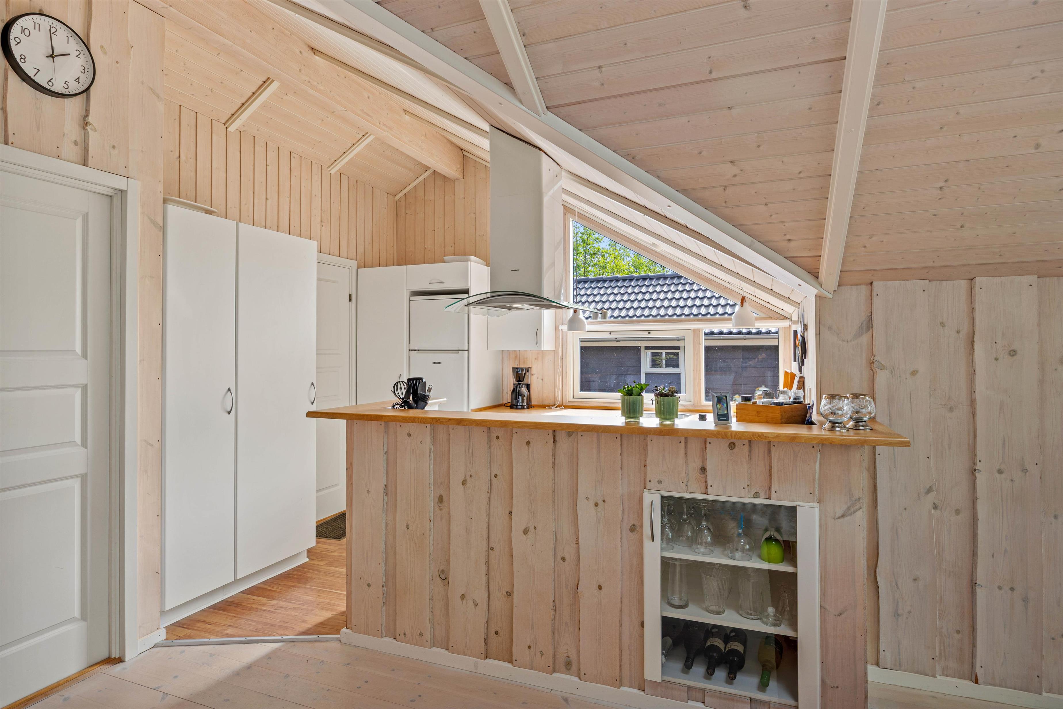 Når man træder ind i sommerhuset, ender man i det skønne samtalevenligt køkken, som i sin beskedenhed sørger for god stemning i huset. I kan trygt starte madlavningen da opvaskemaskinen sørger for oprydningen. Fra køkkenet fører rummene videre til den indbydende stue, hvor en brændeovn står klar til at skabe en varm og hyggelig atmosfære, perfekt til afslapning efter en dag i den friske luft.