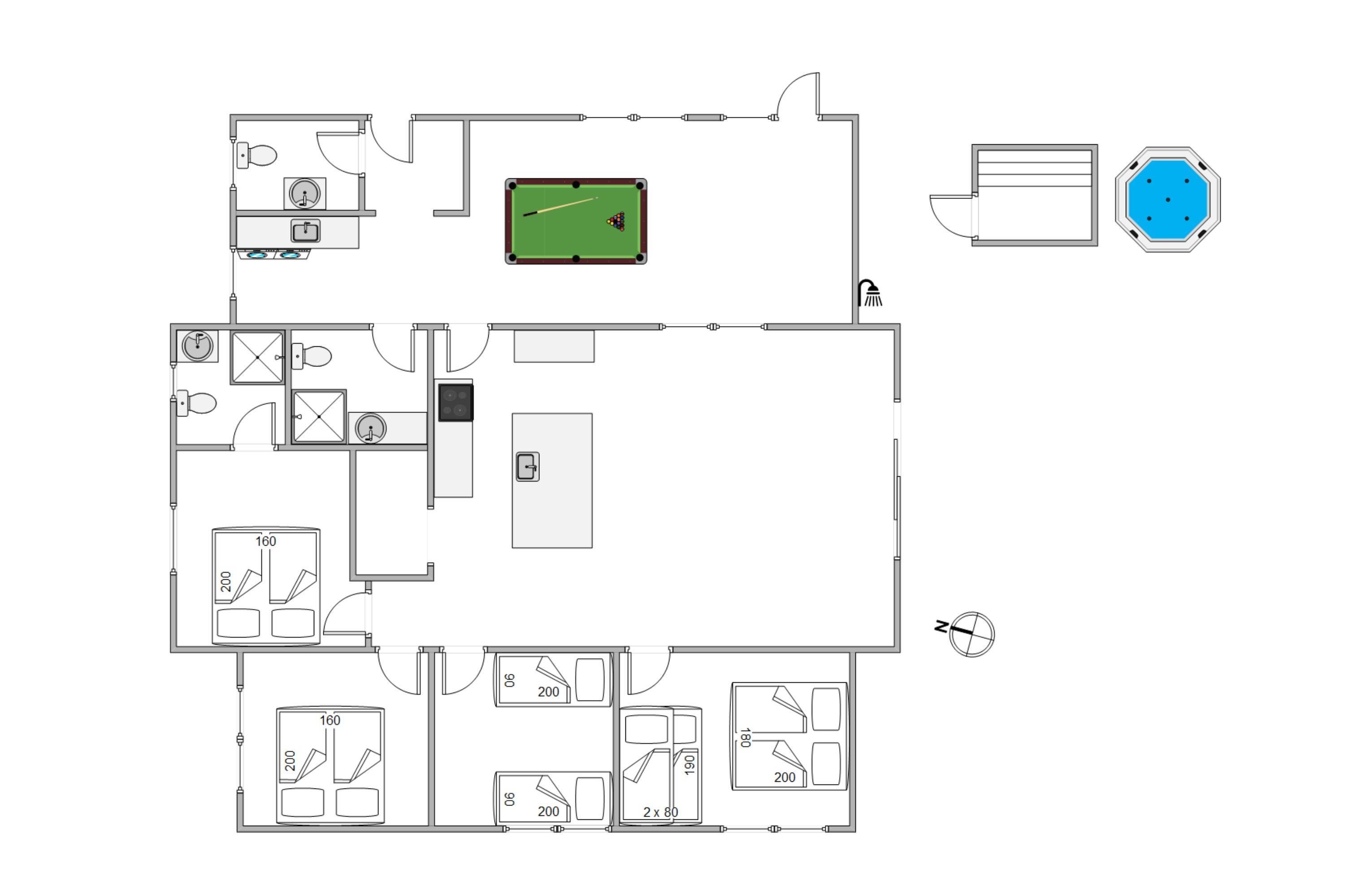 Sommerhuset tilbyder luksus og hygge på flere niveauer. I kan nyde godt af en praktisk vaskemaskine og tørretumbler, hvilket gør det nemt at håndtere praktiske opgaver under ferien. Køkkenet er veludstyret med en opvaskemaskine, som giver jer mere tid til at nyde hinandens selskab, mens poolbillardet i aktivitetshjørnet sikrer sjov og underholdning for alle aldre.