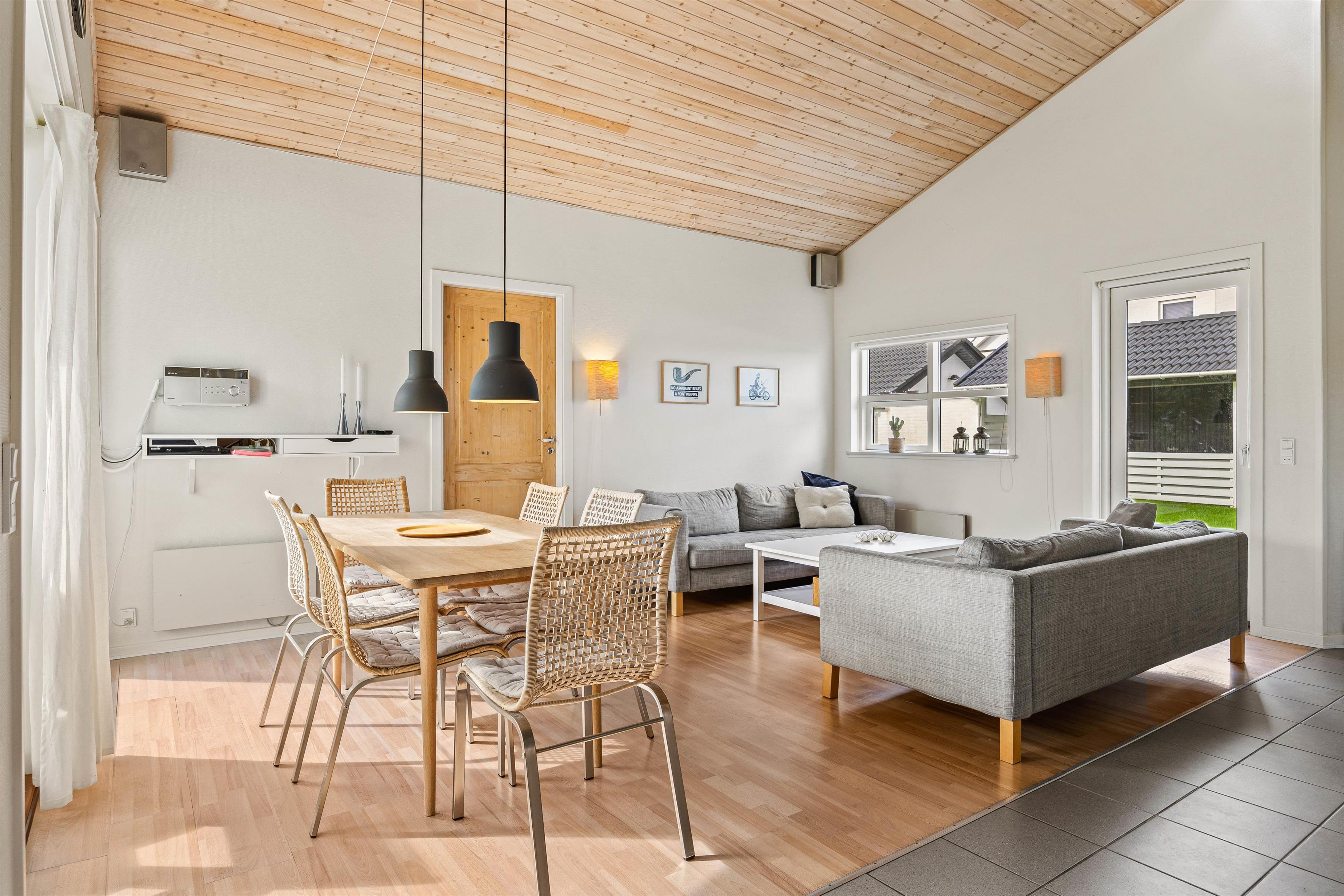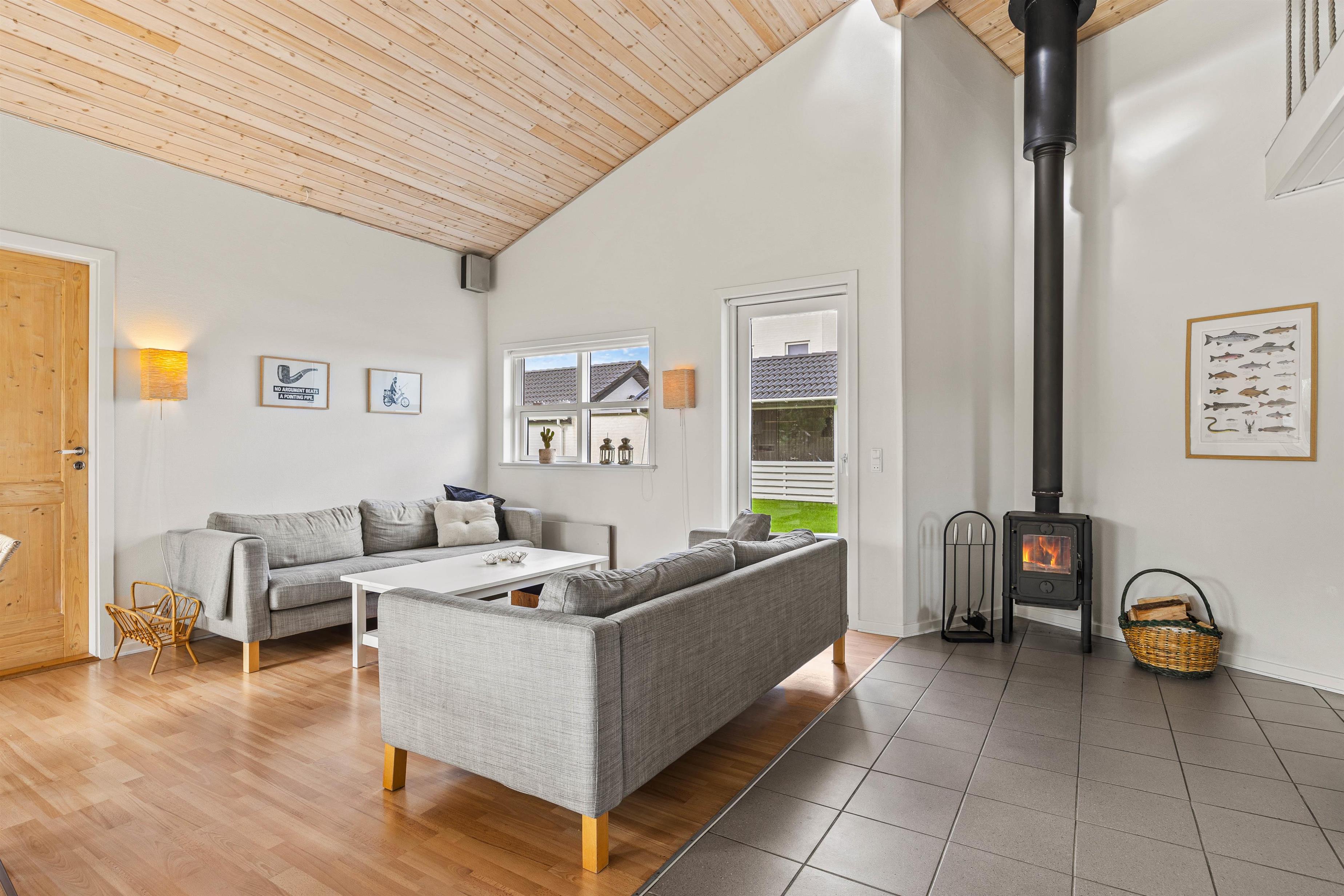 Hele feriehuset er lyst og roligt indrettet, og samlingspunktet bliver uden tvivl alrummet, hvor hele flokken kan samles. I kan lave noget lækkert mad og sammen nyde det omkring spisebordet, mens brændet knitrer i pejsen. Mens opvasken klares i opvaskemaskinen, kan I samle jer i sofaen til brætspils- eller filmhygge.