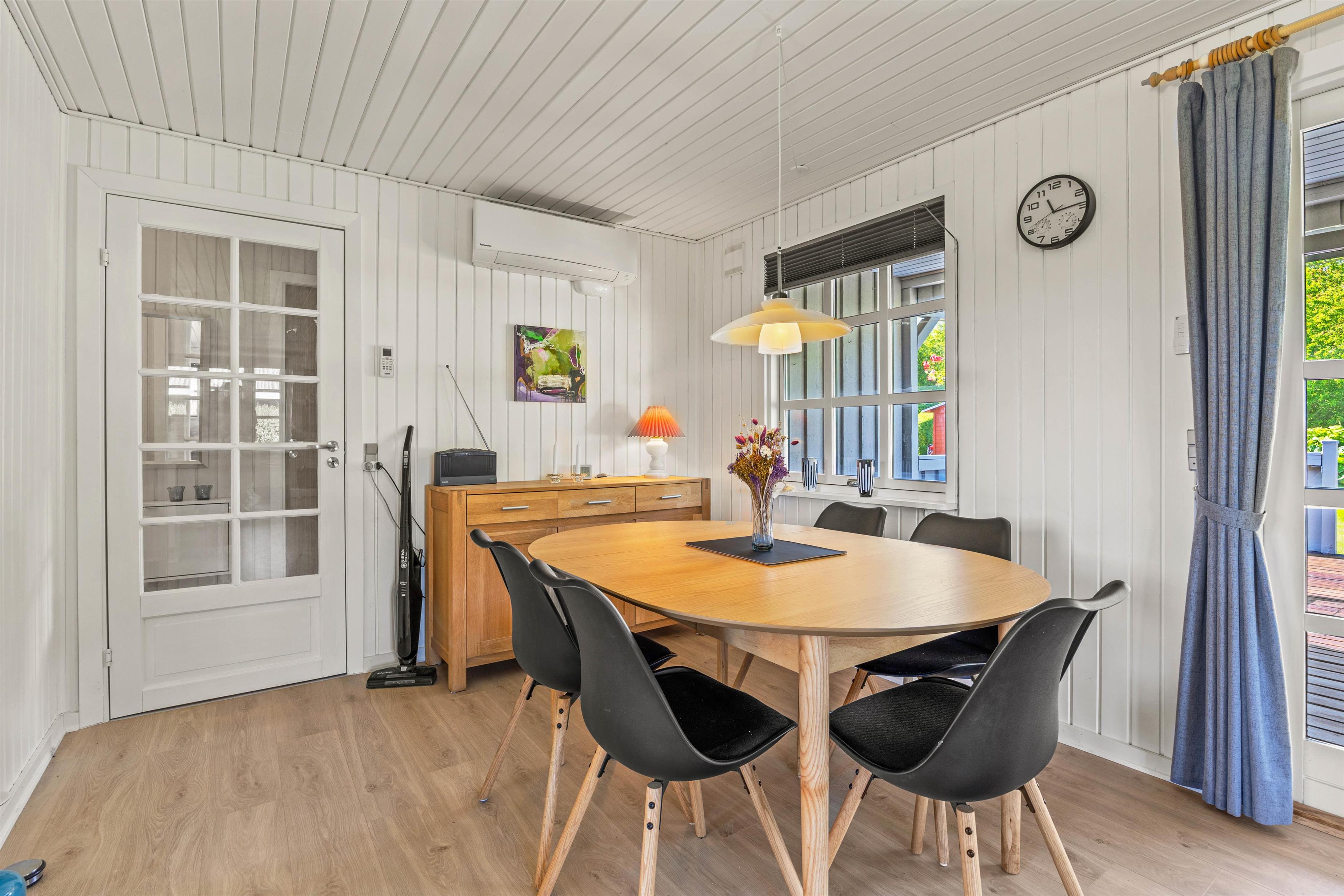 Sommerhuset er designet til at tilbyde komfort og plads til op til fem feriegæster. Med tre velindrettede soverum er der rigelig plads til, at alle kan finde deres egen lille oase af ro og afslapning. Et fuldt udstyret badeværelse sikrer, at alle har mulighed for at få en god start på dagen, uanset om det er ved at tage et langt bad eller frisk opvågnen fra en begivenhedsrig dag. I den hyggelige stue venter en knitrende brændeovn, der inviterer til hygge og samvær på de køligere aftener. Derudover sørger en effektiv og energibesparende luft-til-luft varmepumpe for, at I altid har et behageligt indeklima, uanset årstiden og verjet udenfor.
