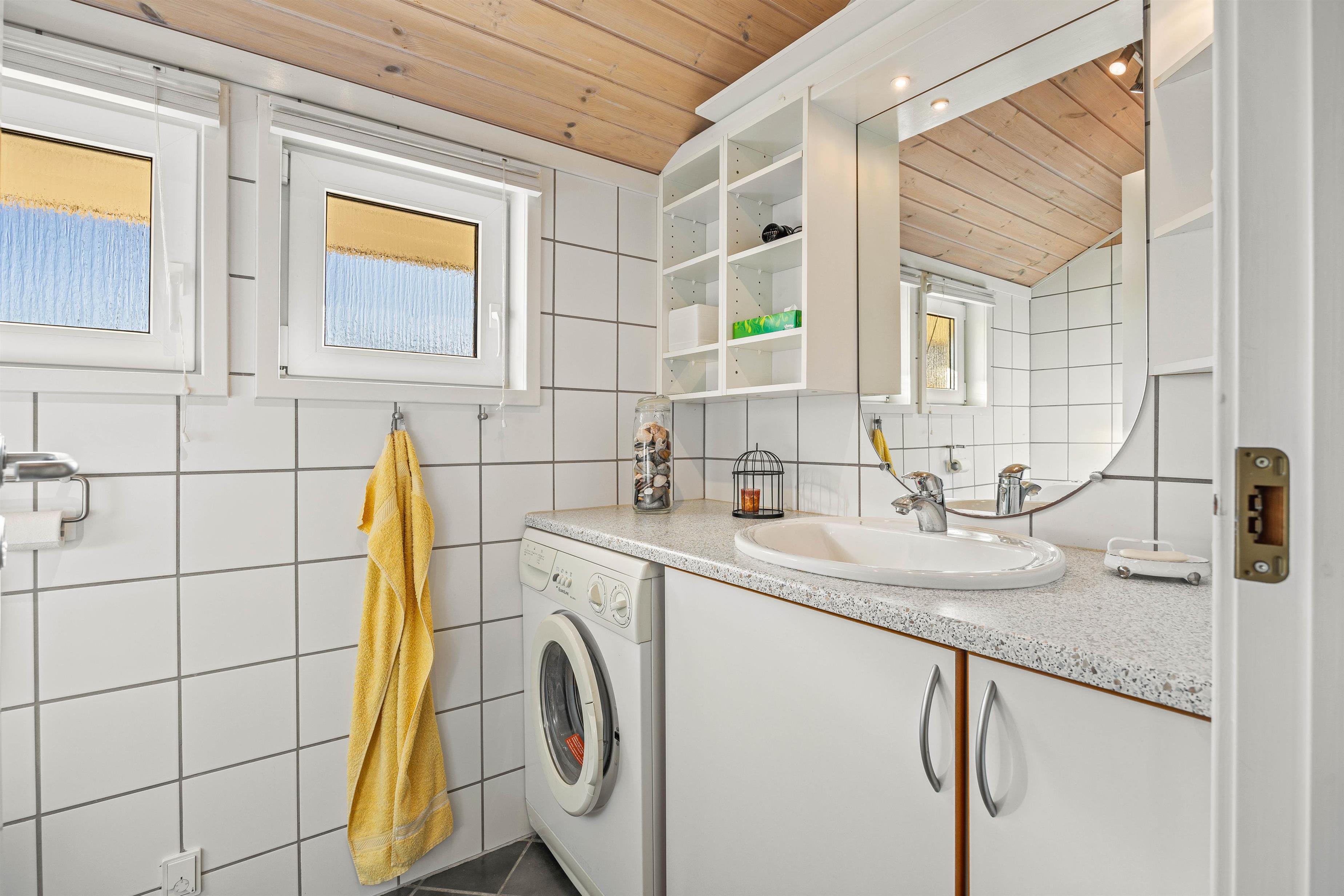 I stuen skaber en hyggelig brændeovn den klassiske feriestemning, der gør aftenerne særligt afslappende. Derudover er der en vaskemaskine, hvilket er ideelt til længere ophold, da I kan holde styr på garderoben uden besvær.