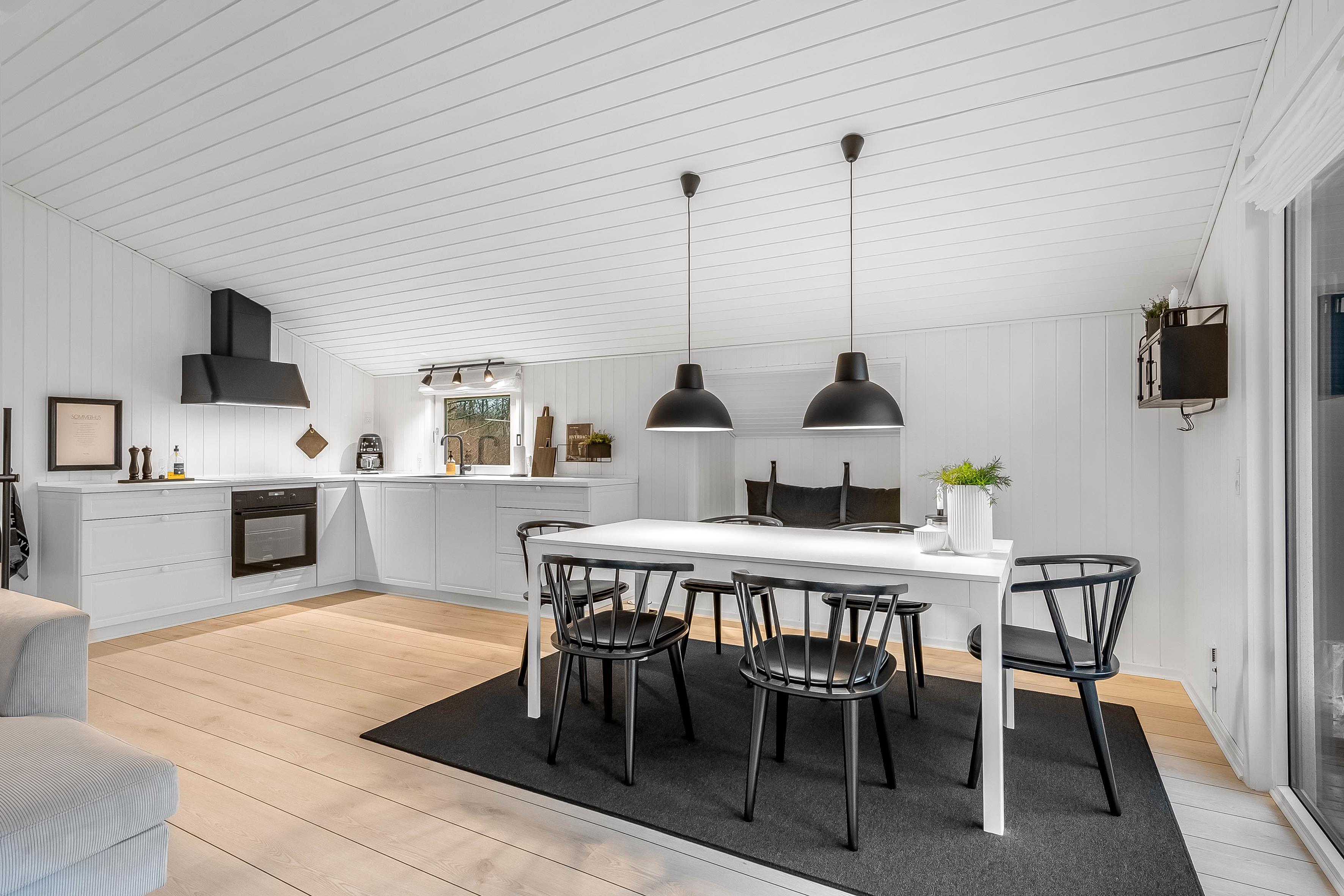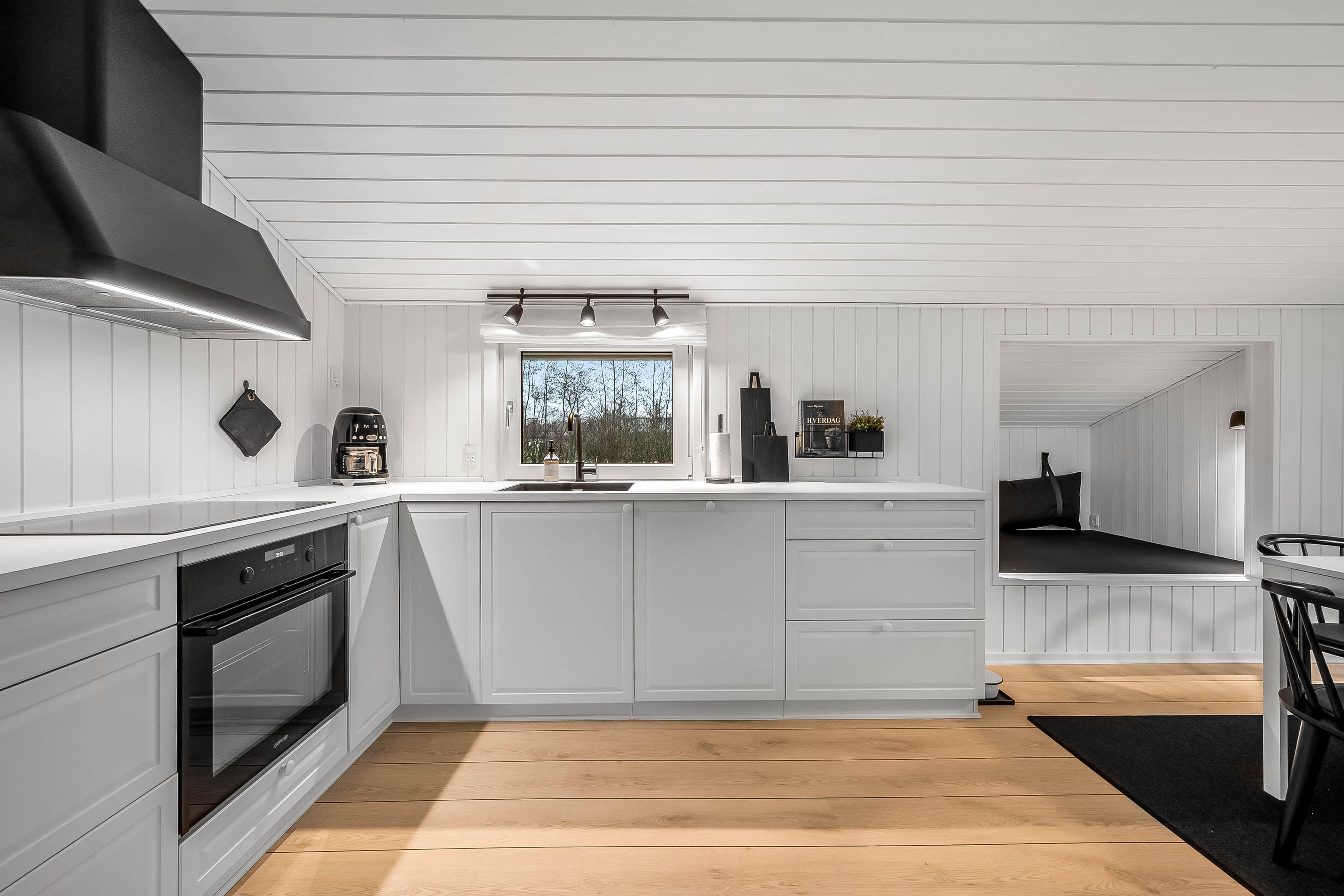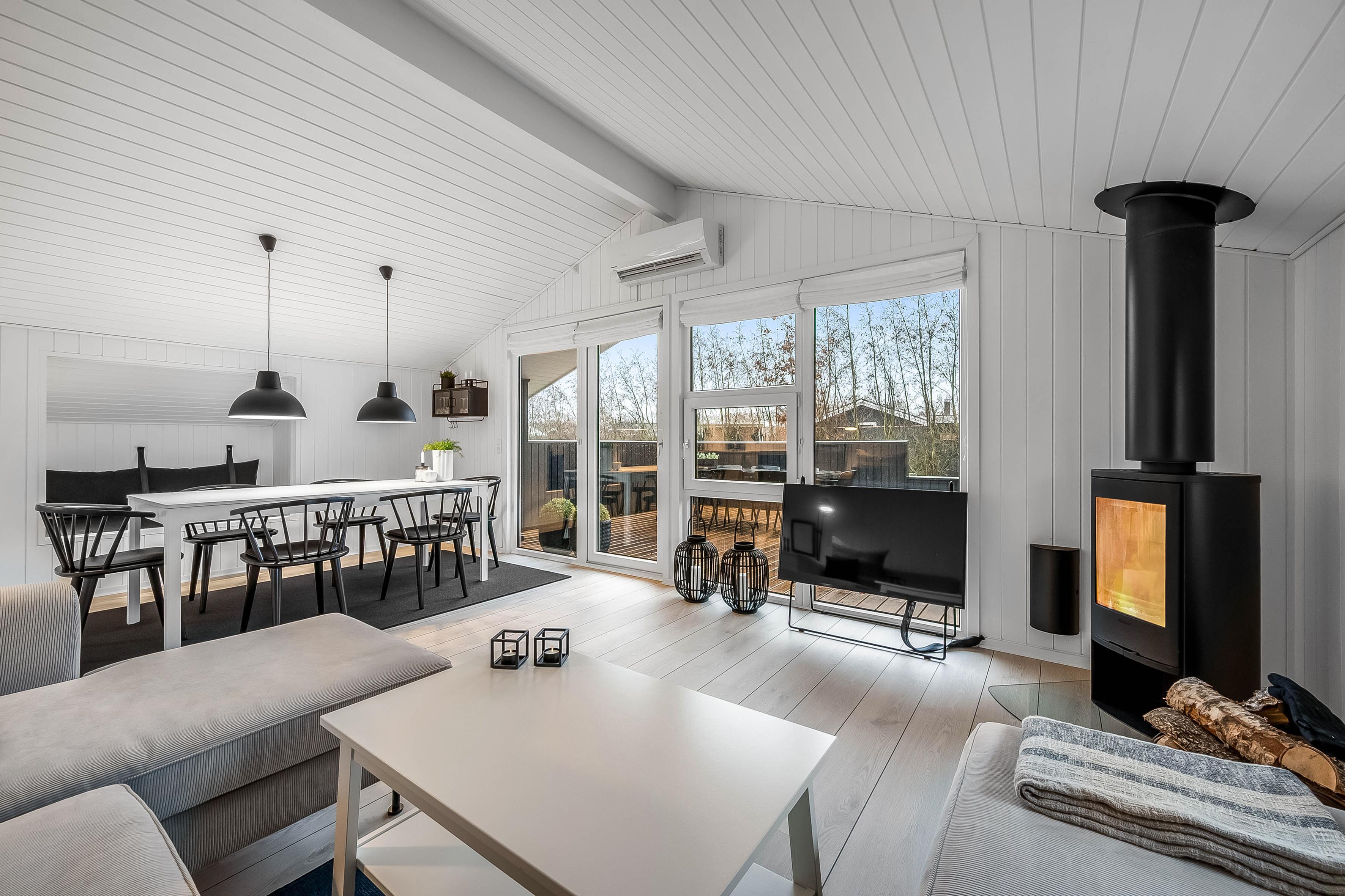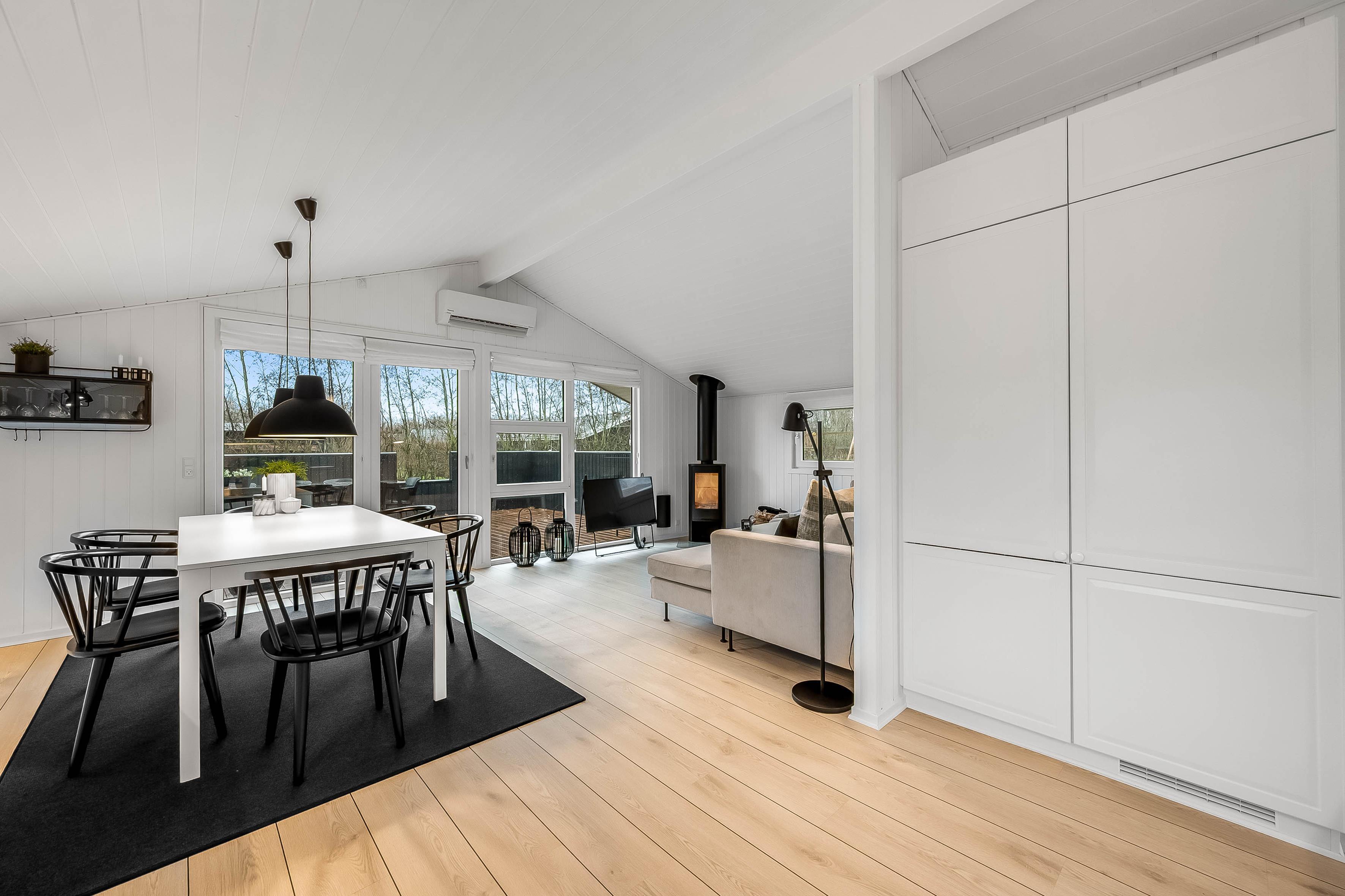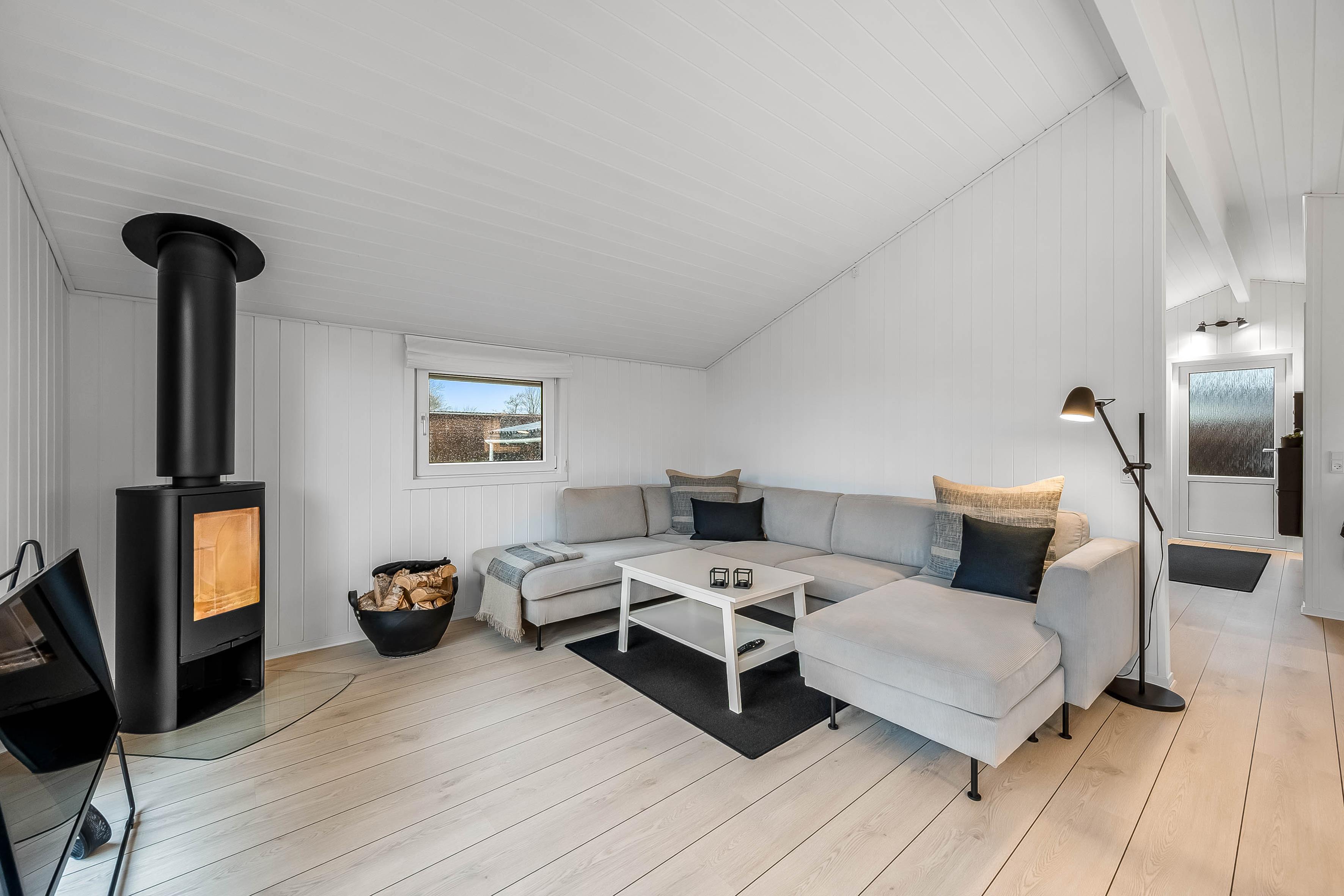 Stue, køkken og spisested er samlet i ét stort rum, hvilket giver en skøn følelse af sammenhold, selv når I har forskellige aktiviteter i gang. I kan slappe af i sofaen og se tv, spille brætspil ved spisebordet, eller blot nyde hinandens selskab med ilden fra brændeovnen knitrende i baggrunden. I feriehuset er en energibesparende varmepumpe, som hurtigt og effektivt sørger for et behageligt indeklima og en god temperatur.