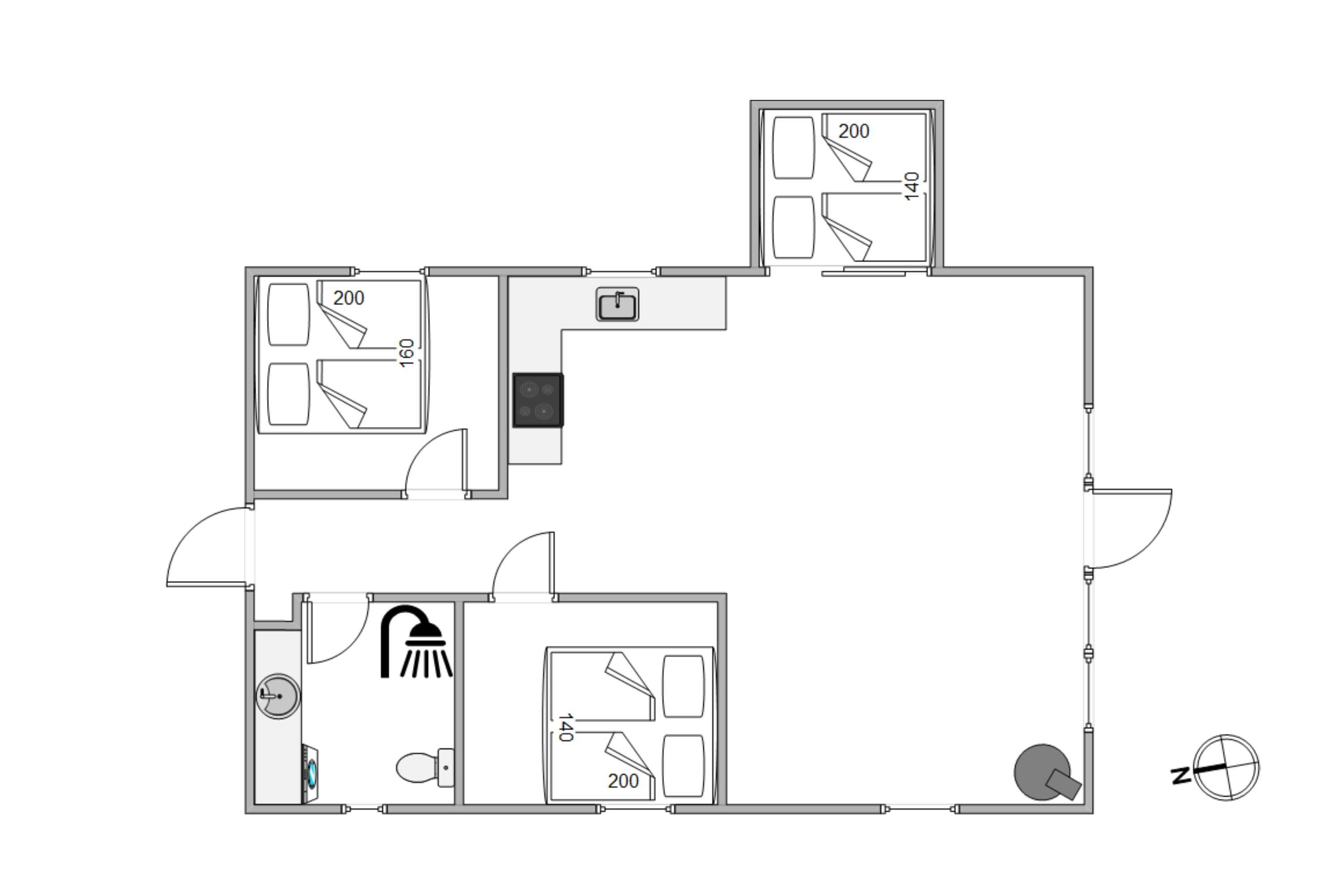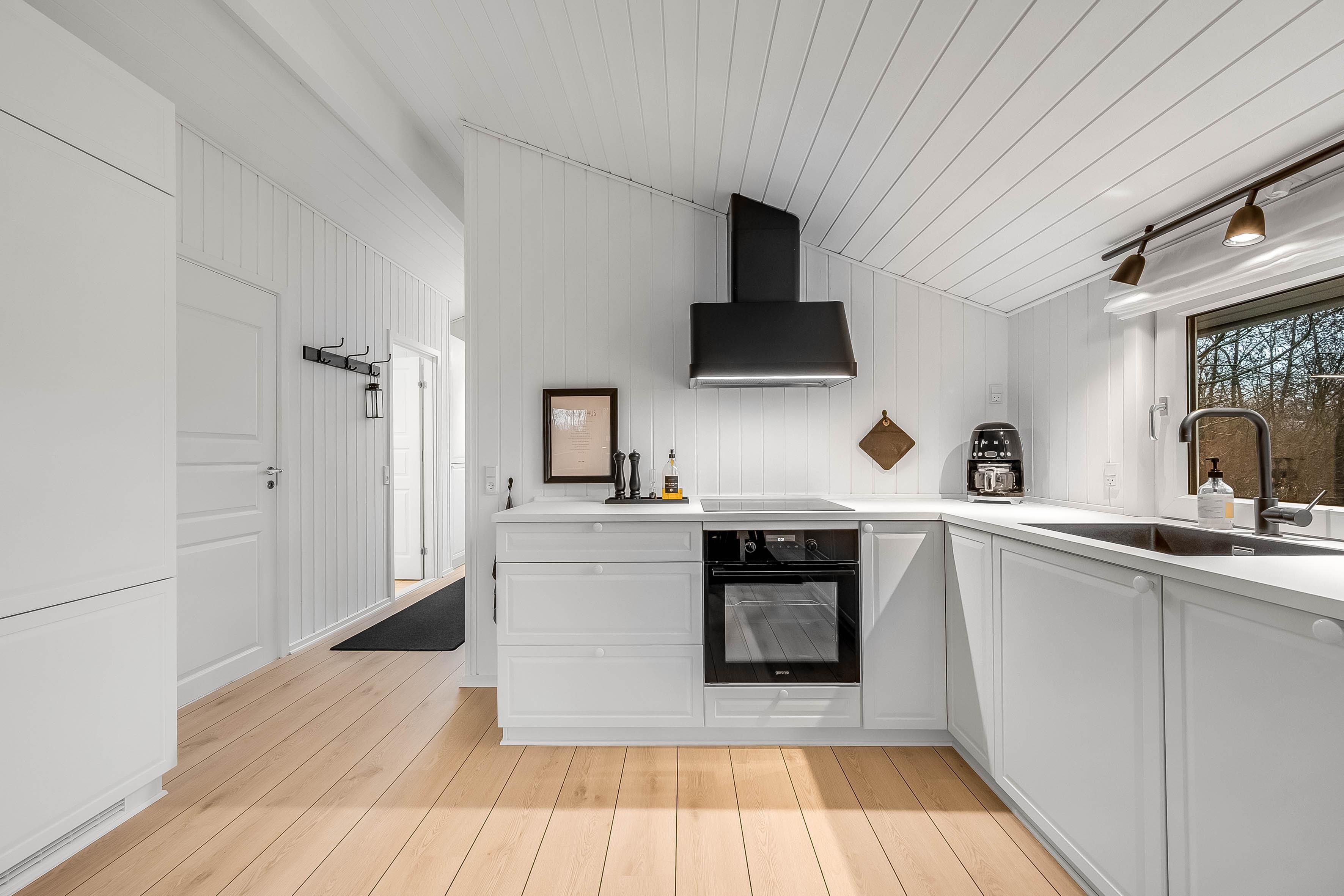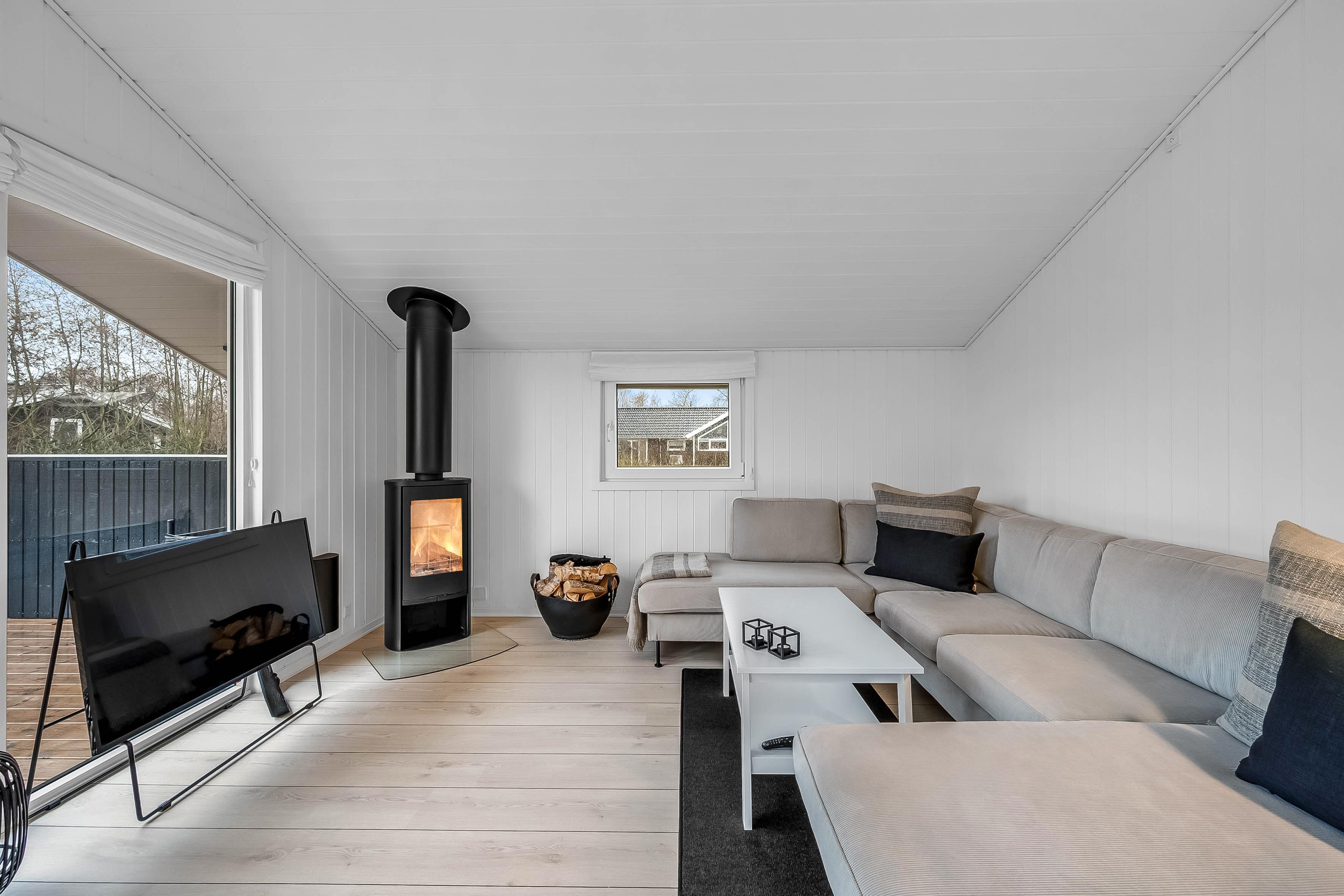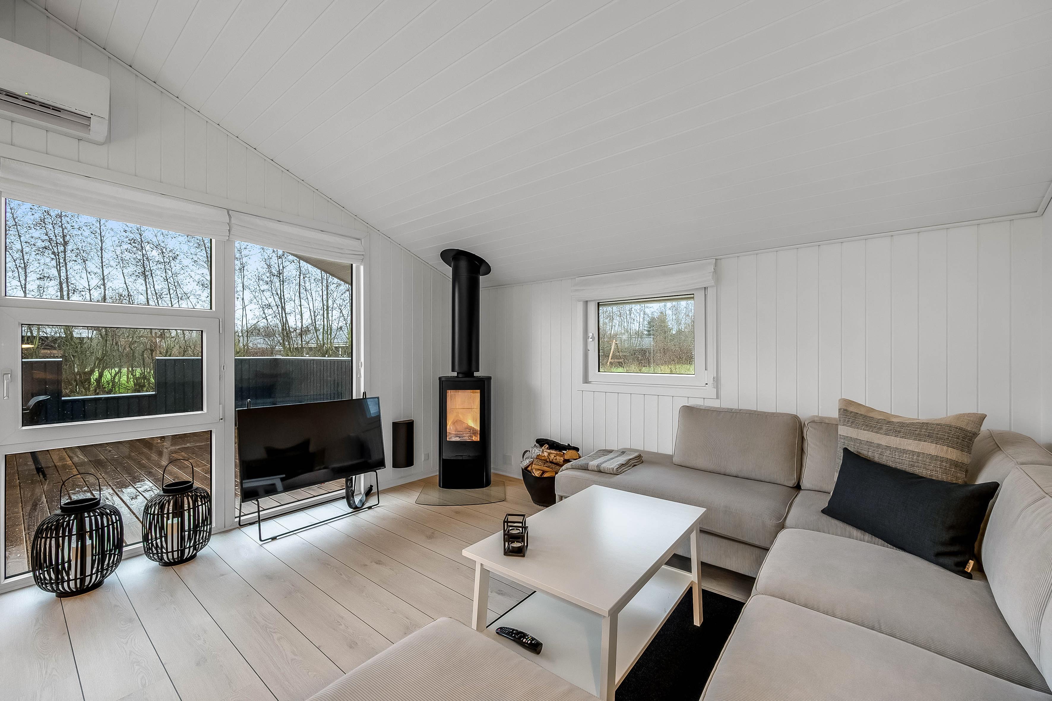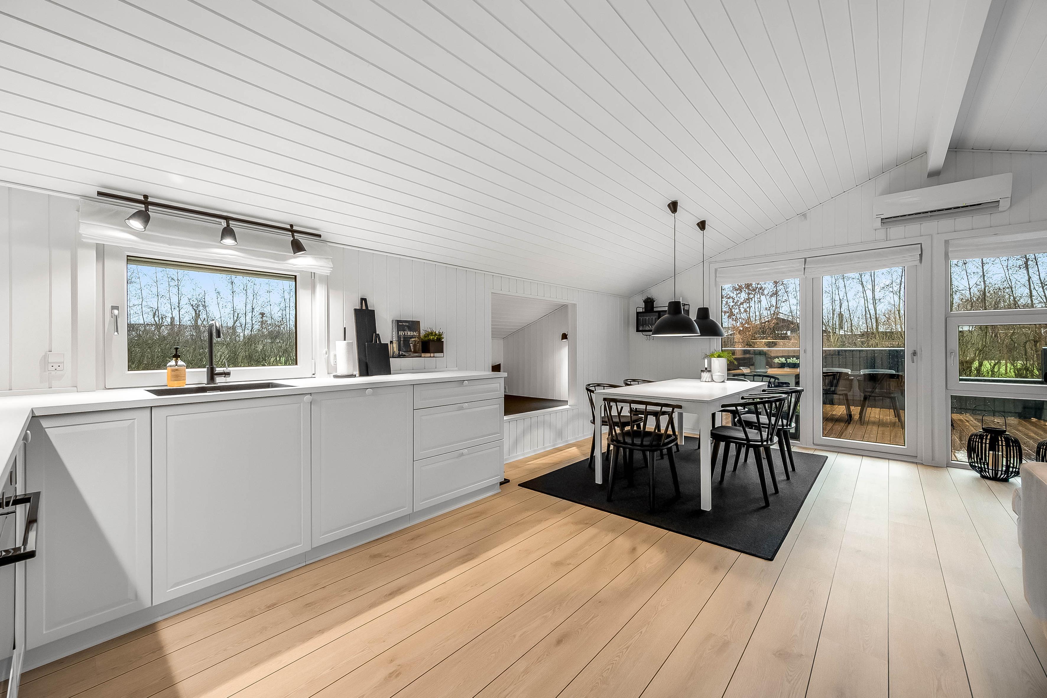 Stue, køkken og spisested er samlet i ét stort rum, hvilket giver en skøn følelse af sammenhold, selv når I har forskellige aktiviteter i gang. I kan slappe af i sofaen og se tv, spille brætspil ved spisebordet, eller blot nyde hinandens selskab med ilden fra brændeovnen knitrende i baggrunden. I feriehuset er en energibesparende varmepumpe, som hurtigt og effektivt sørger for et behageligt indeklima og en god temperatur.