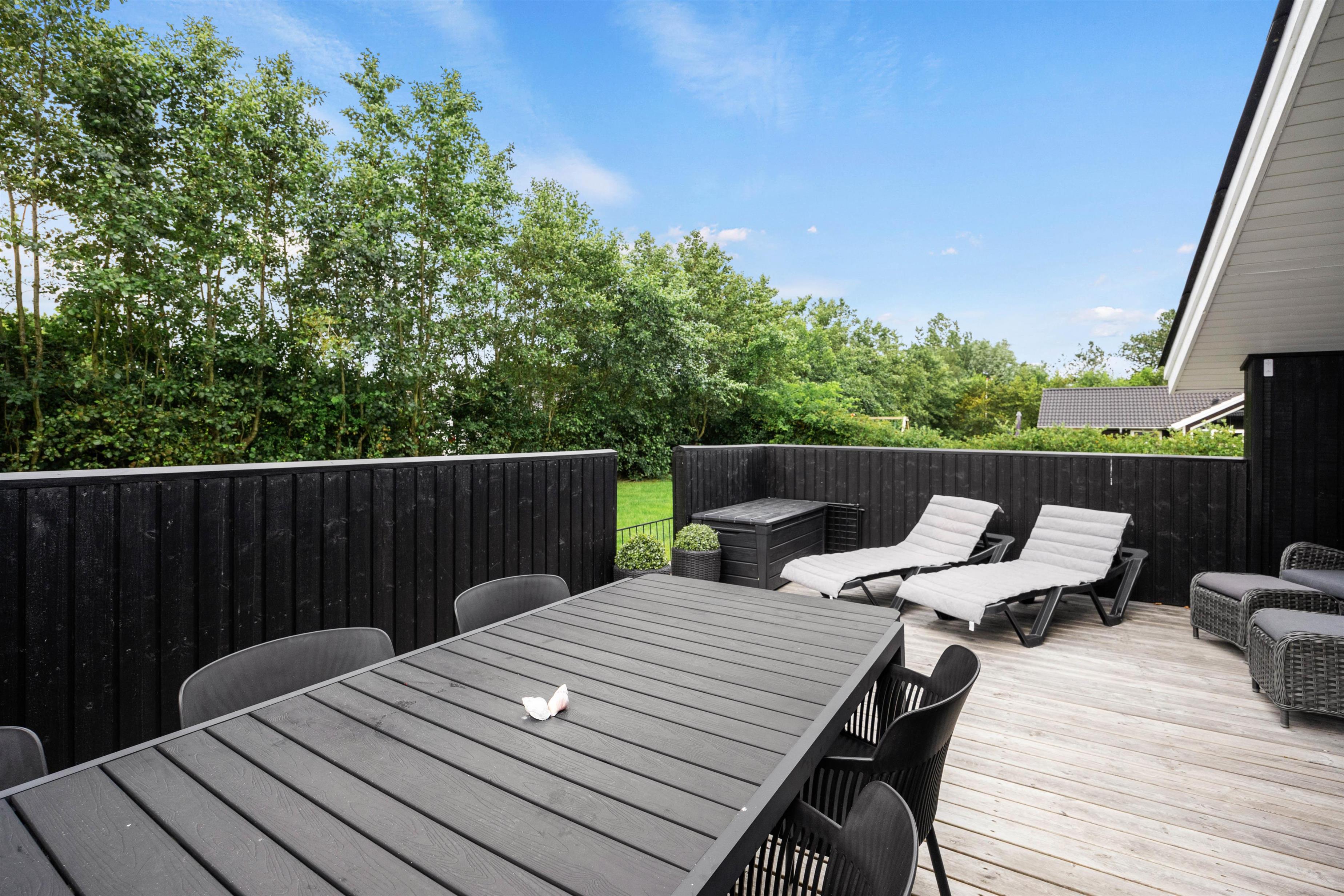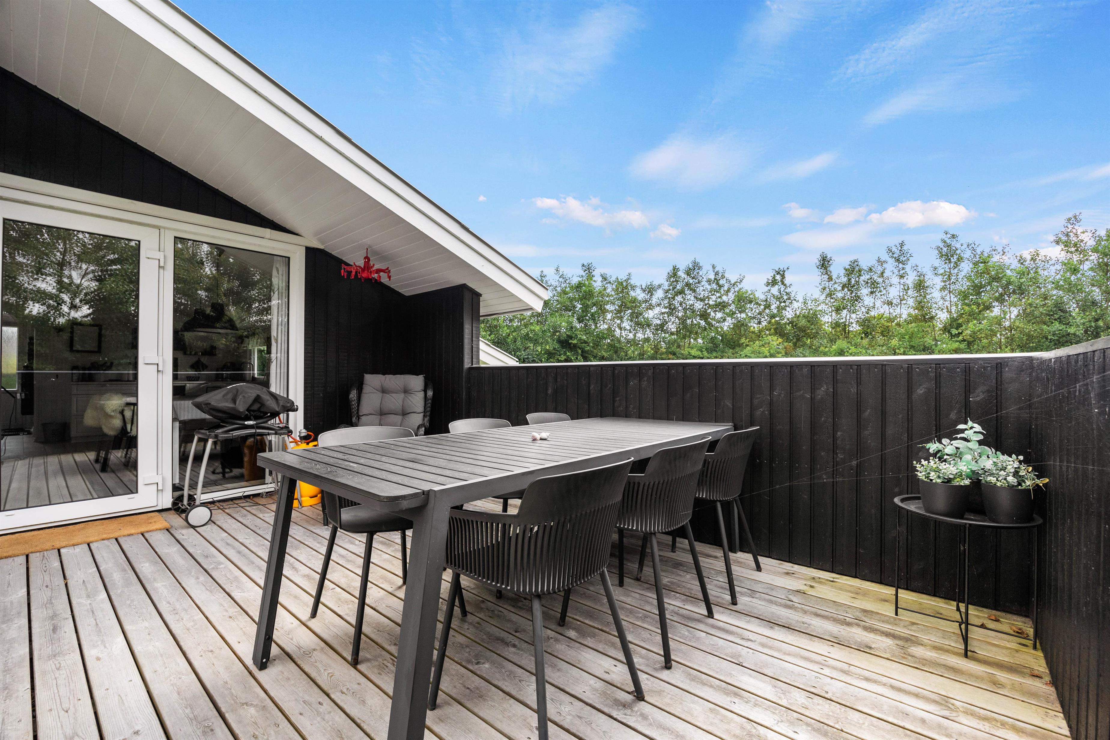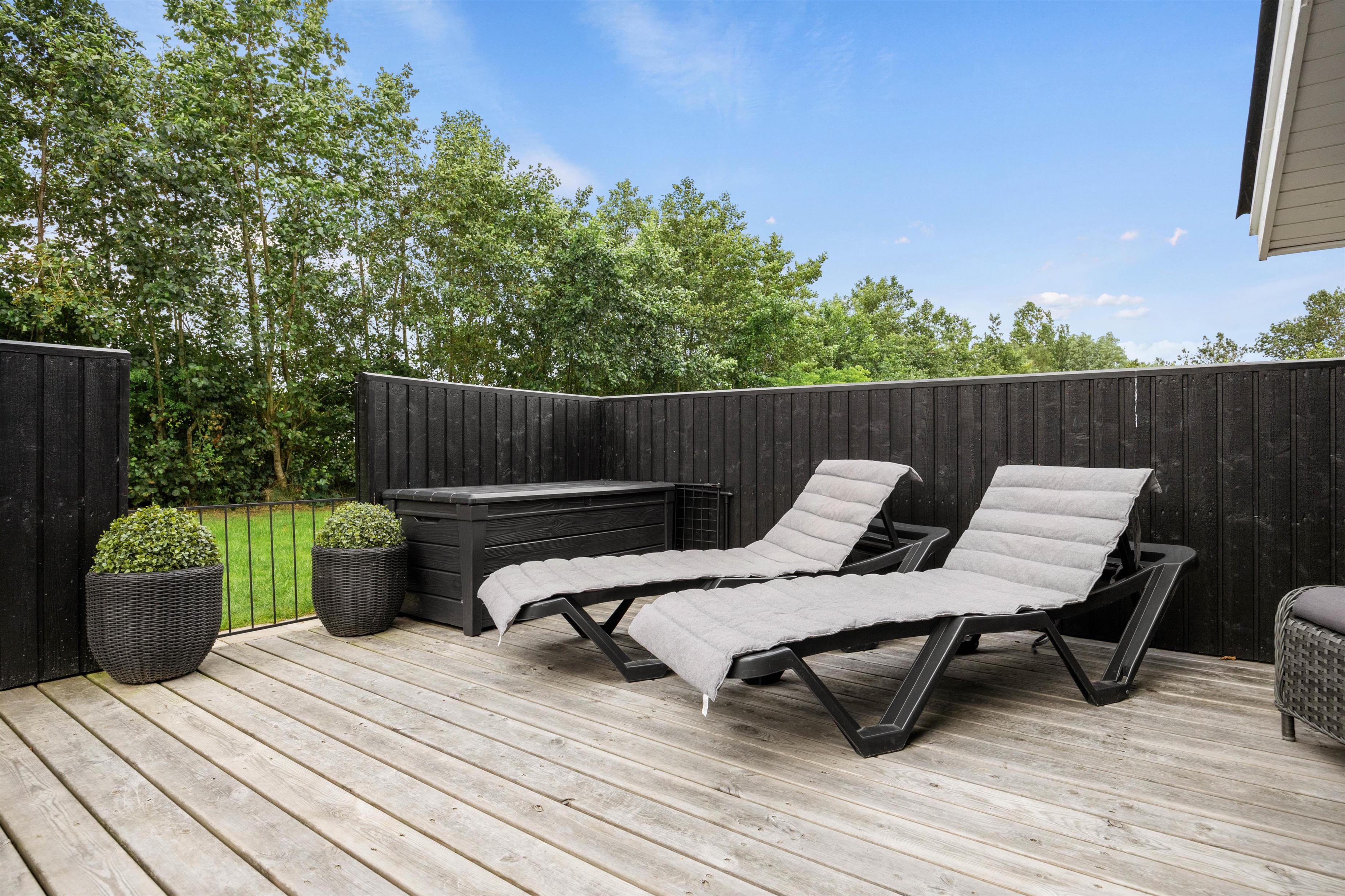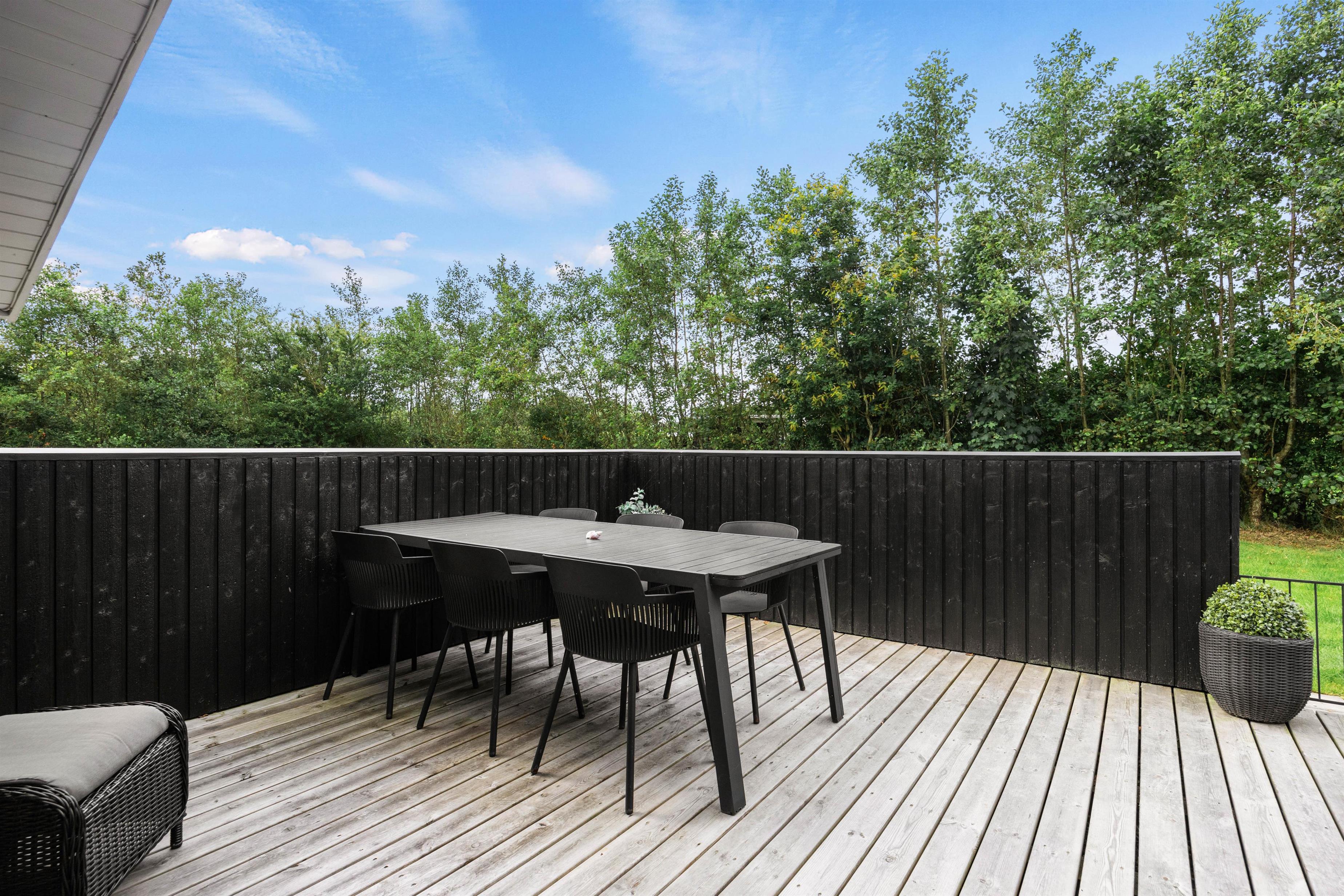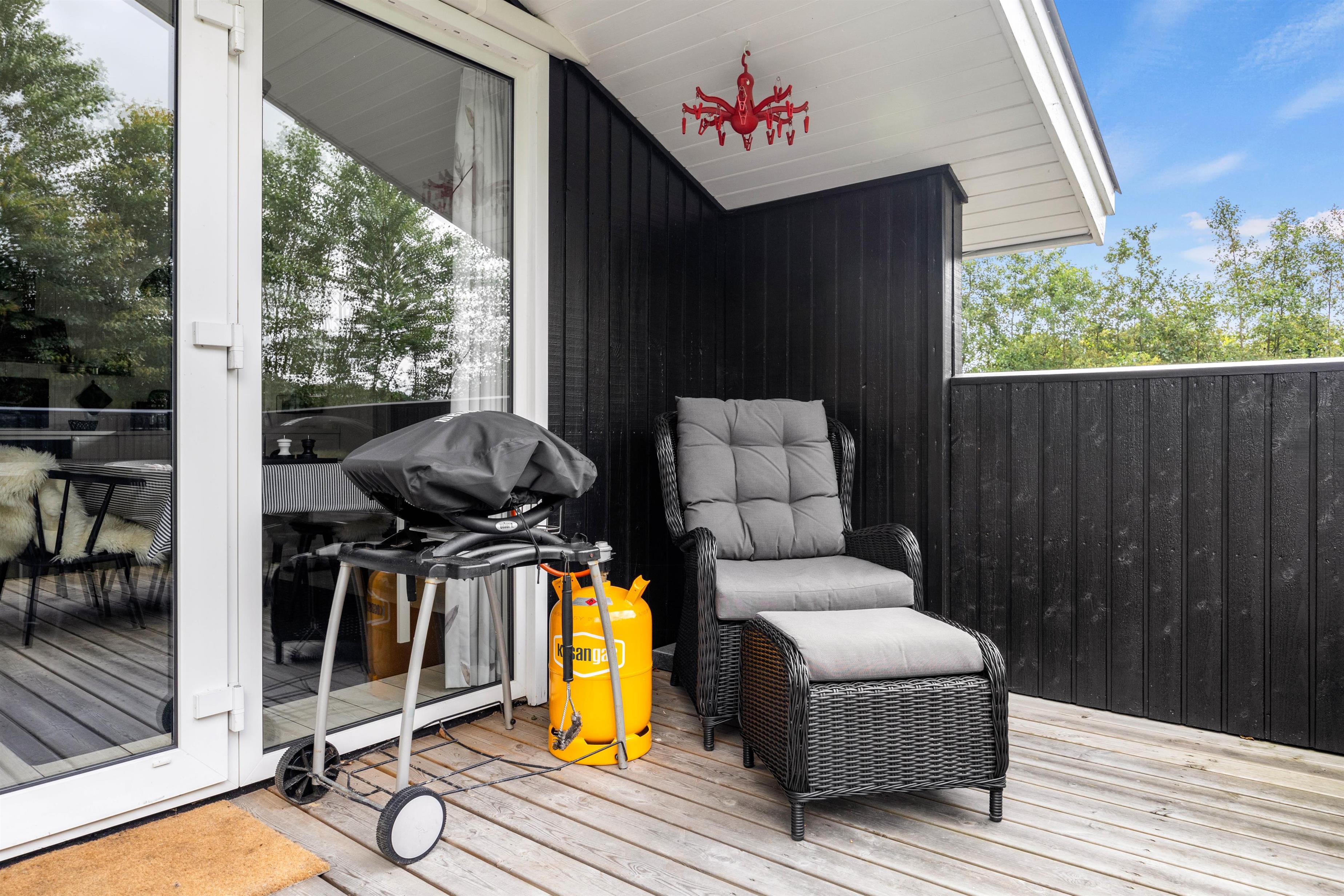 Fra stuen kan I træde ud på den lukkede terrasse, så småbørn eller hunden kan boltre sig i trygge rammer. Her er der alt, hvad I behøver for en aften med mad under åben himmel, hvor I kan tilberede bøffer eller andre lækkerier på grillen.